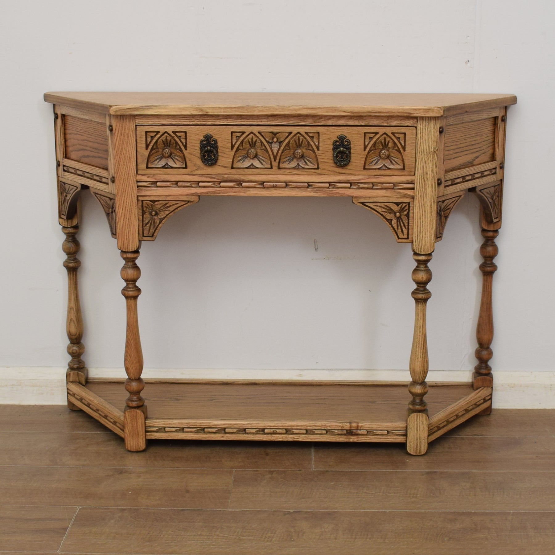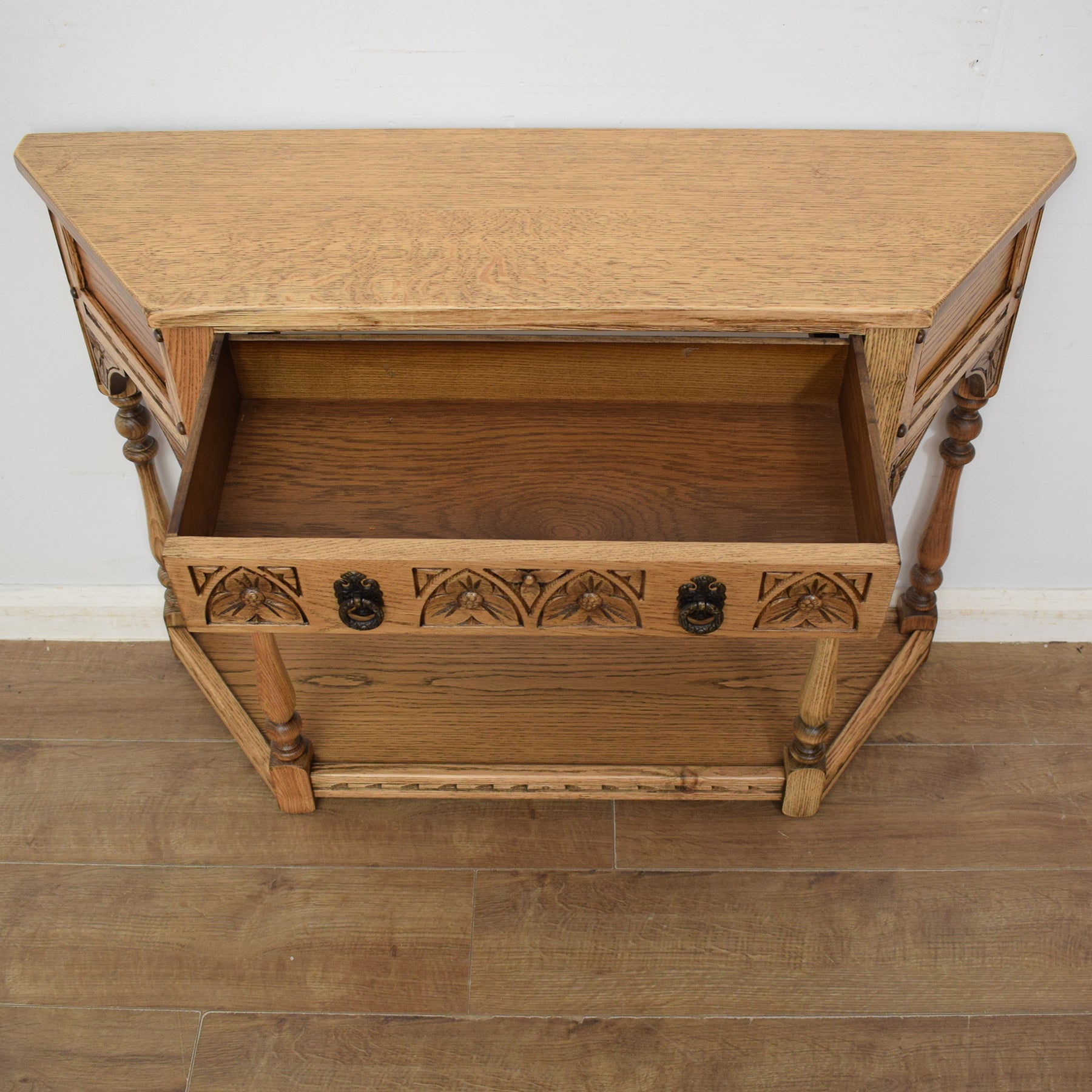 The richly-grained top surface has space for a vase of fresh flowers along with treasured ornaments and family photographs. Below is a drawer that is ideal for notebooks, phone chargers or various other items, then at the base of the legs, there is a useful shelf. This piece is made of a mix of oak with oak veneered panels. The drawer base is plywood.