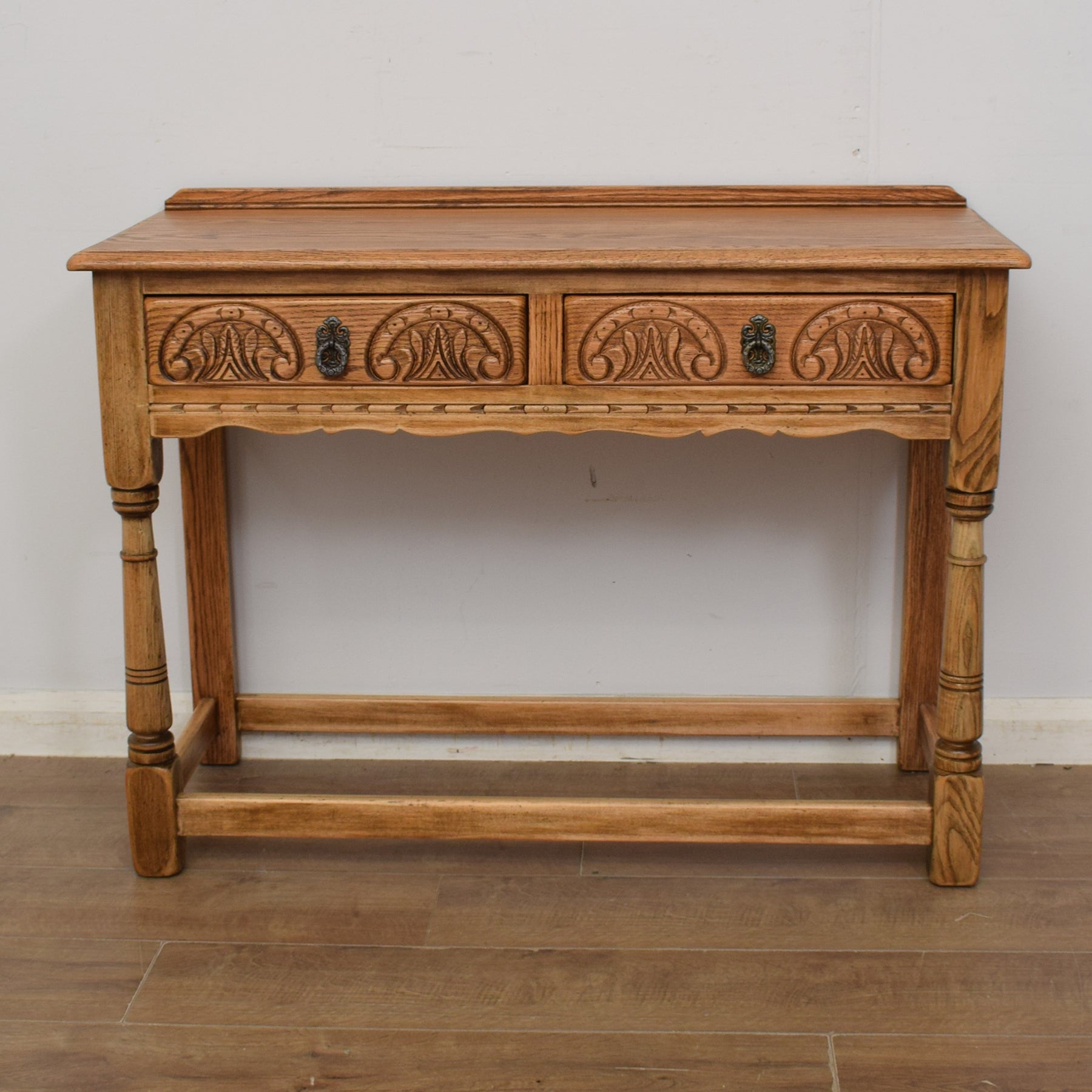 We have restored this console table by removing the previous, darker stain to reveal the natural wood underneath. We have then applied a clear lacquer that not only accentuates the beauty of the oak grain but also provides a protective finish that will keep this item looking its best for many years to come. This console table is constructed from a mixture of solid oak and oak veneer. The drawer bases are plywood.