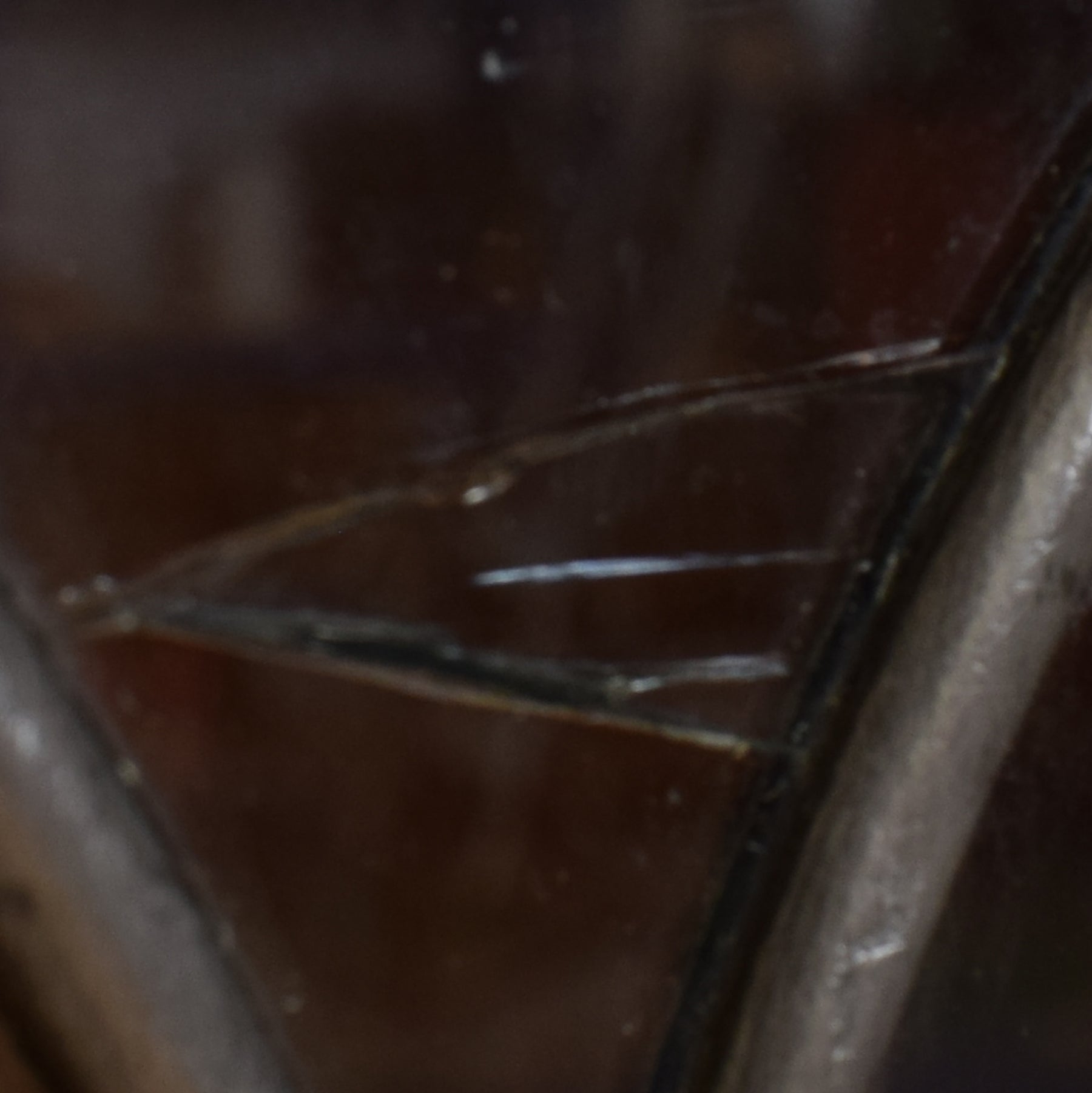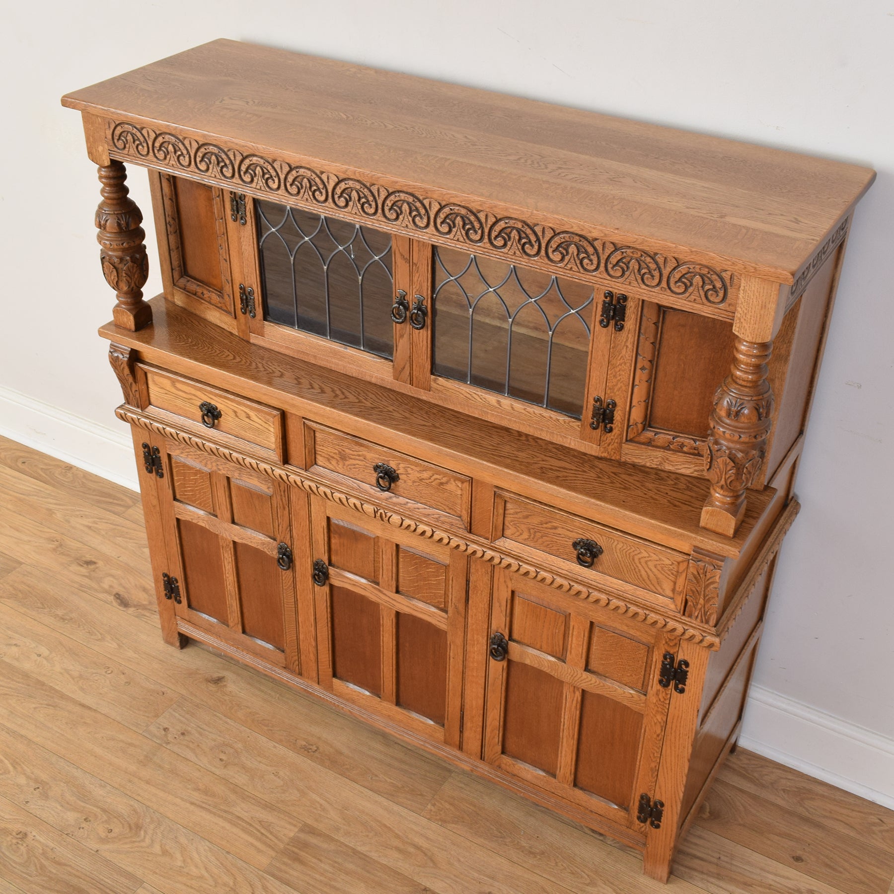 The previous darker finish has been fully stripped back, and multiple coats of hard-wearing matte lacquer have been applied, producing a durable surface that enhances the natural tones of the oak. As visible in the photographs, each of the two glazed doors contains a small hairline crack within the leaded panels; however, we don't feel that this detracts from the overall look of the piece.. The cabinet is constructed from a mixture of solid oak and oak-veneered panels, with plywood used for the drawer bases and rear panel.
