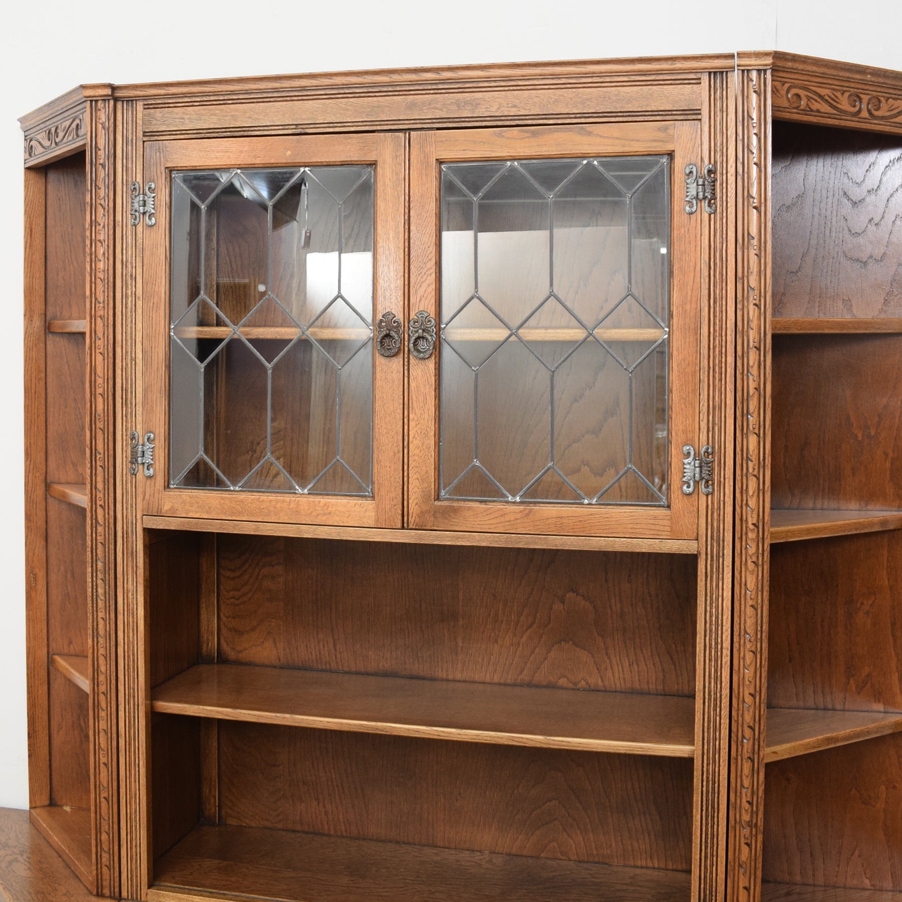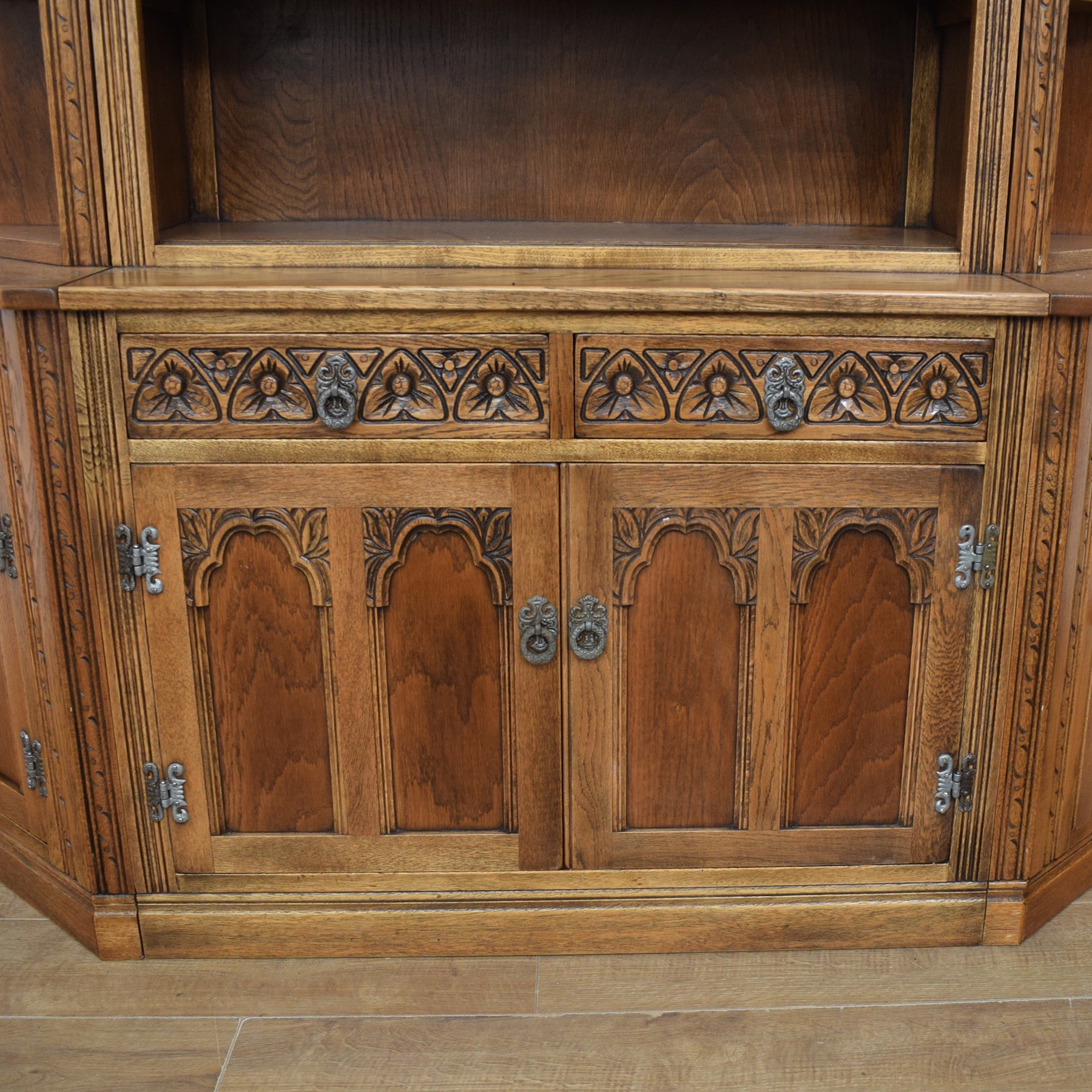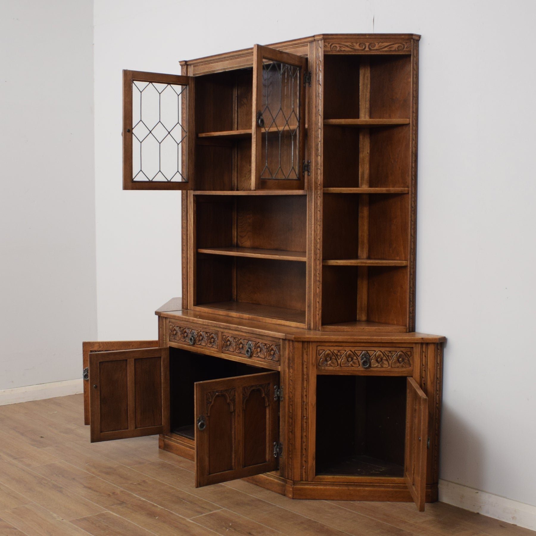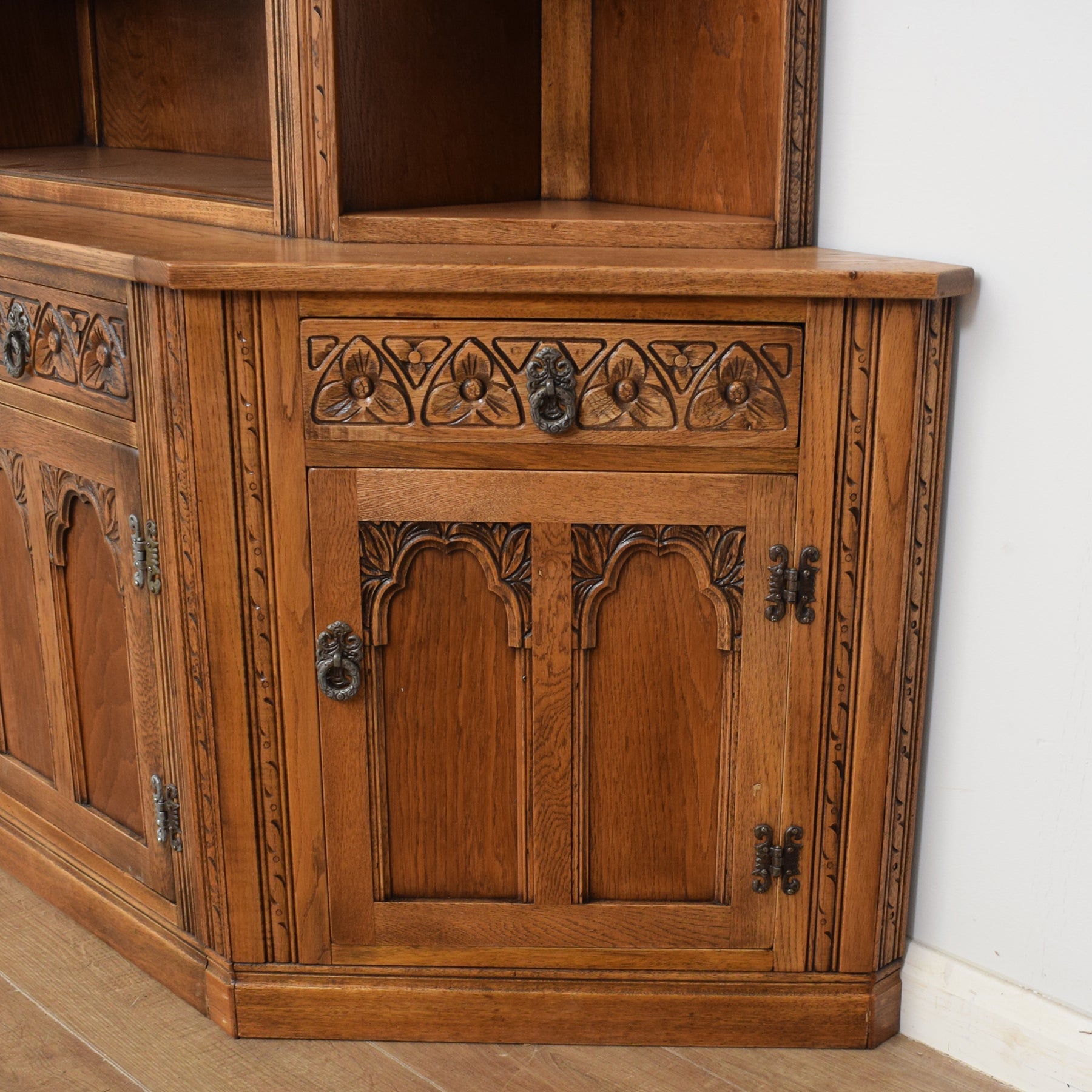 This wall unit is made up of two corner units and a central dresser that fit perfectly alongside one another, as shown in the photographs. The central dresser has a glazed display cabinet at the top, with two shelves and further open shelving underneath, providing plenty of space for ornaments and collectables. At the base are two drawers, fronted by ornate carvings and a double cupboard with a single shelf. The ornate handles and hinges add to the visual appeal.