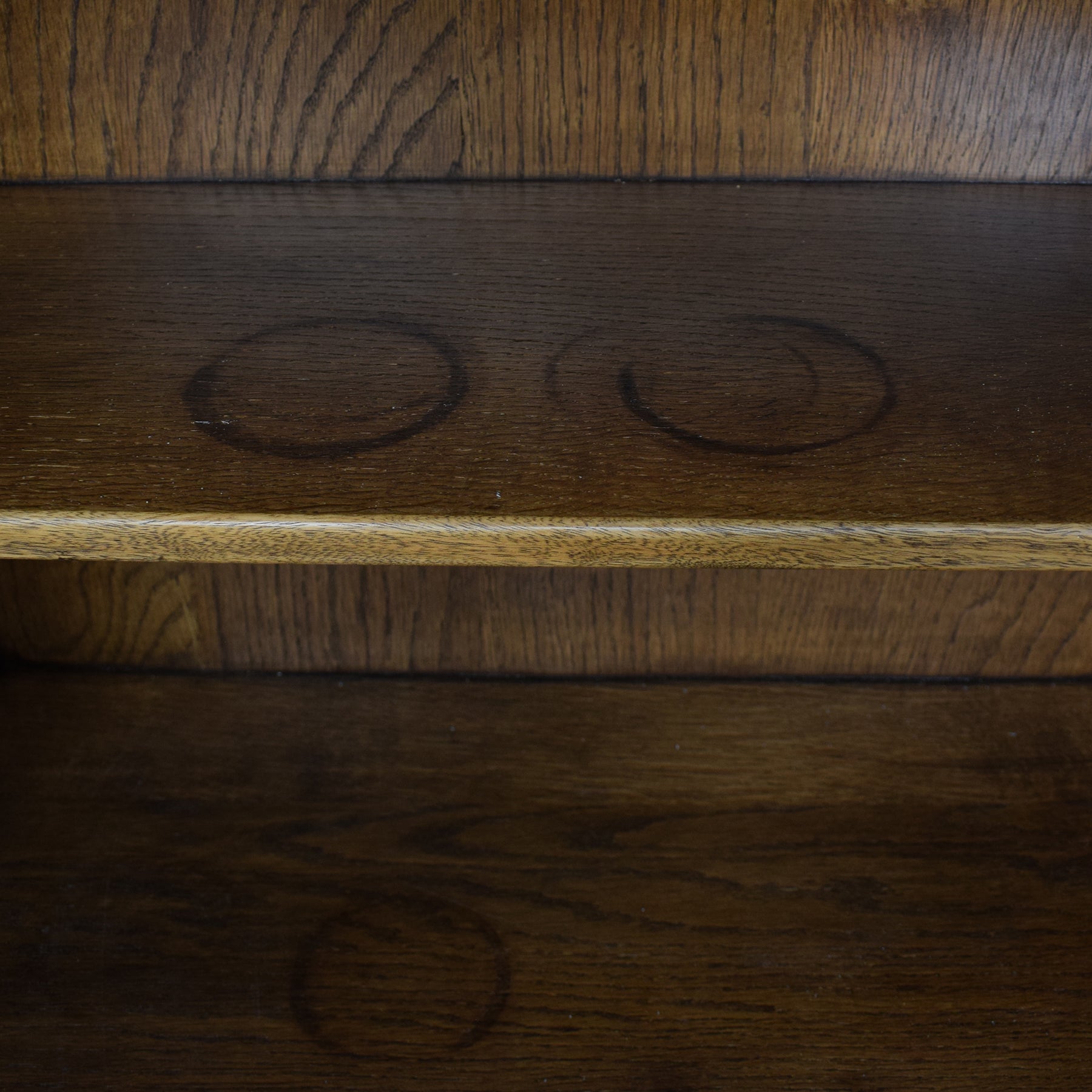 We have restored these pieces by stripping away the older, much darker, finish to reveal the natural colour of the wood underneath. We then applied a clear lacquer to accentuate the beauty of the grain and offer protection. These units are constructed from a mixture of solid oak and veneer panels. The backs and drawer bases are plywood.