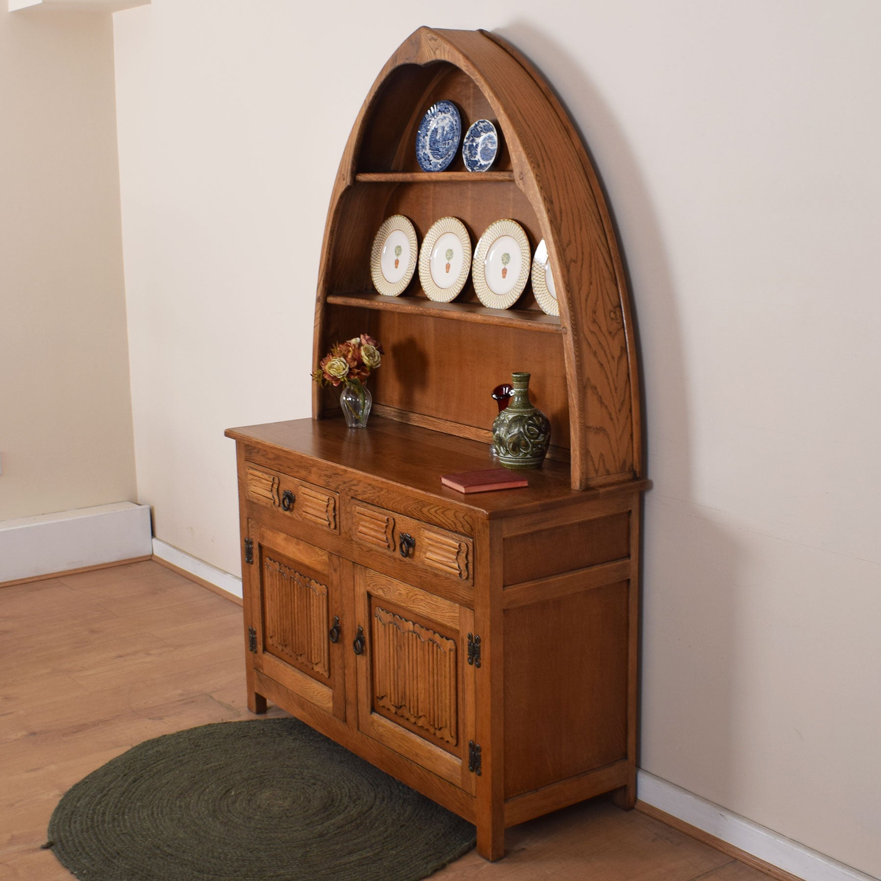 The boat-shaped top section features two display shelves, each with a groove to support decorative plates and plaques. This sits on the beautifully oak-grained worktop, which has space for a fruit bowl or a vase of fresh flowers, along with other treasured ornaments. The lower section then features two half-width drawers over a full-width, double-door cupboard with a single fixed shelf, offering a generous amount of storage for various items. This elegant dresser is a mix of solid oak with oak-veneered panels and plywood back and drawer bases.
