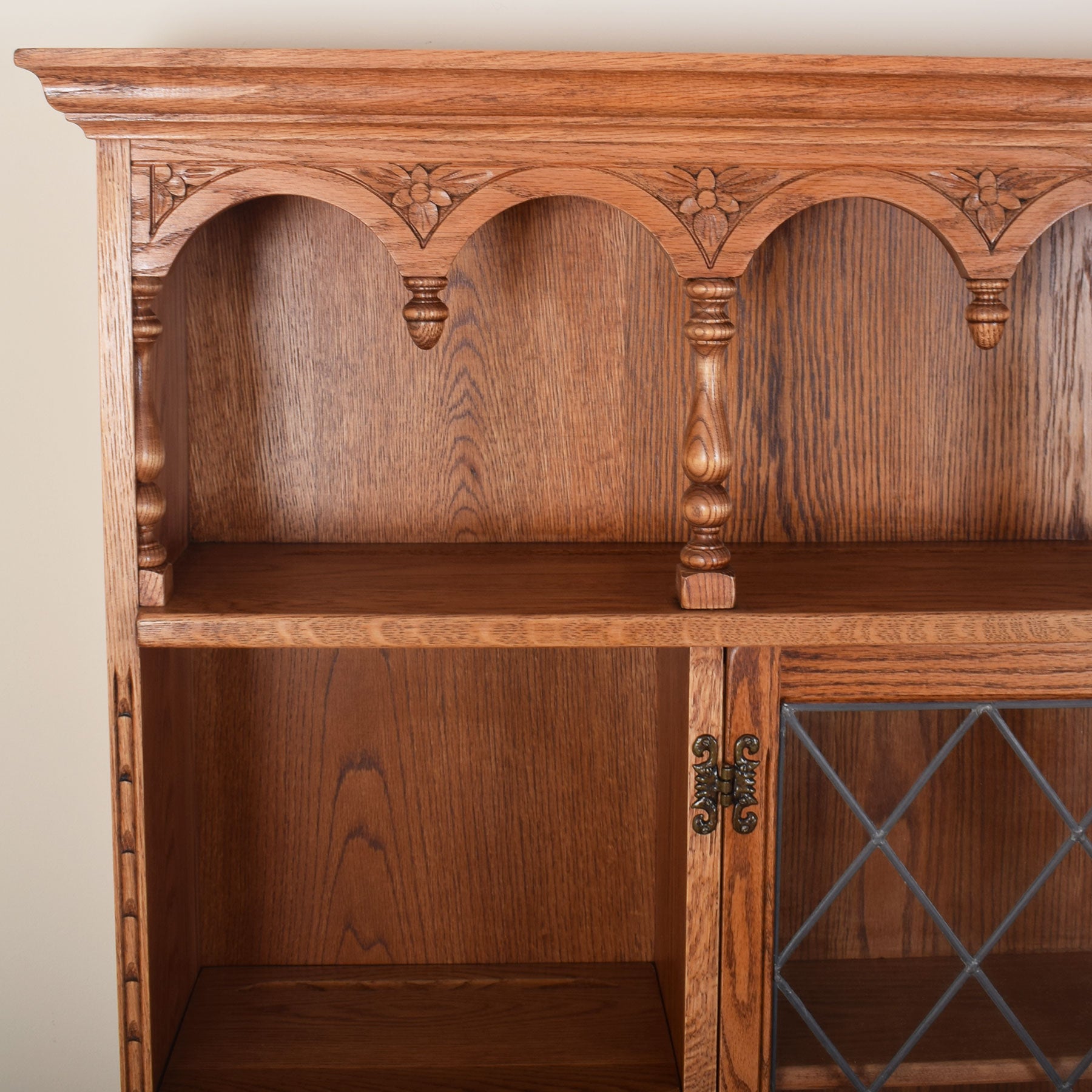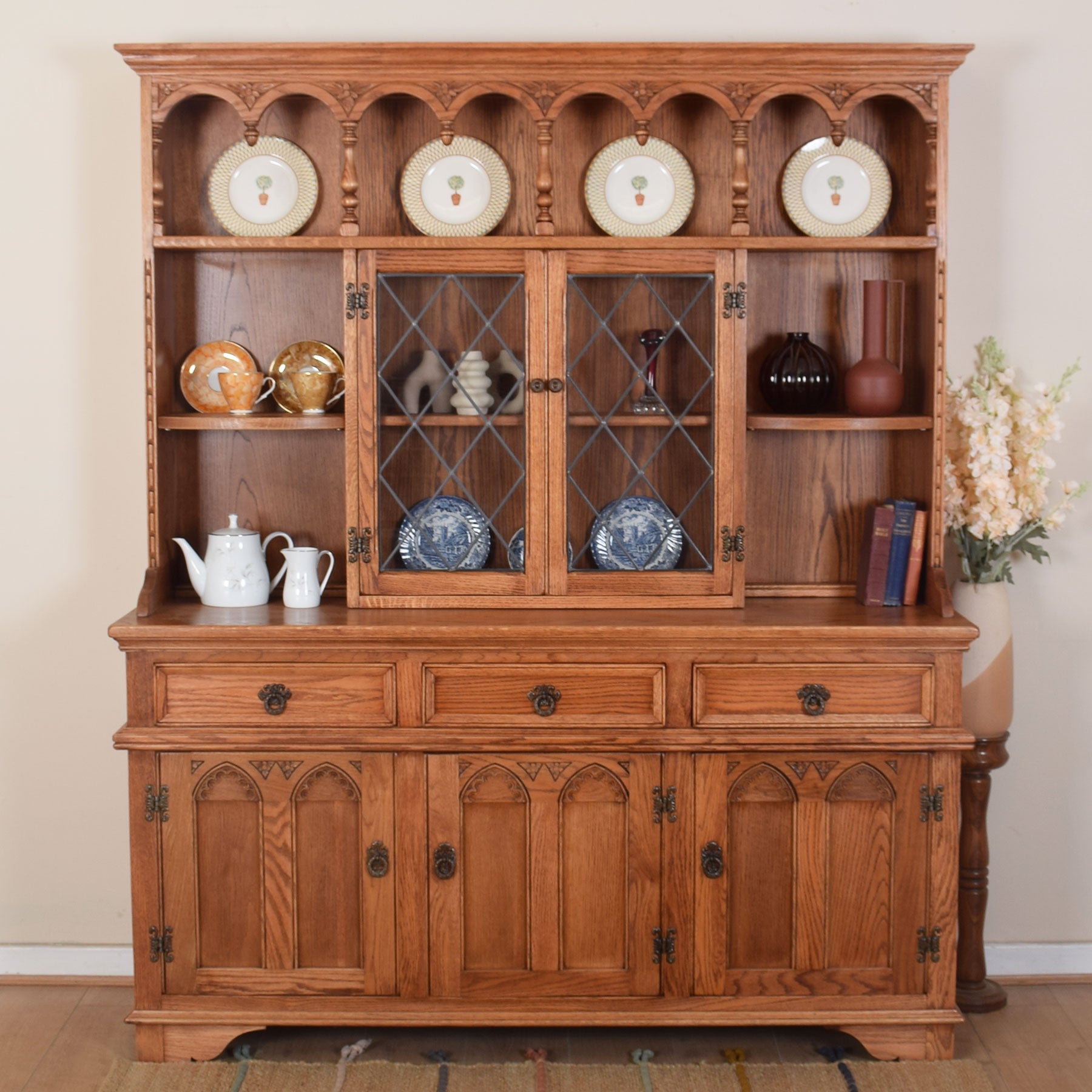The upper display section features a full-width shelf at the top, with a central leaded-glazed cupboard between two additional shelves, offering ample space for treasured ornaments and collectables. This sits on the lower storage unit, which features three useful drawers above three single-door shelved cupboards offering out-of-sight storage for various household items. This quality-made piece is largely oak with oak-veneered panels and plywood rear and internal sections.
