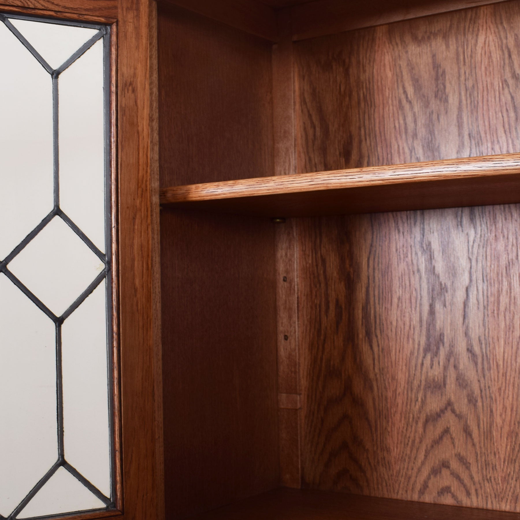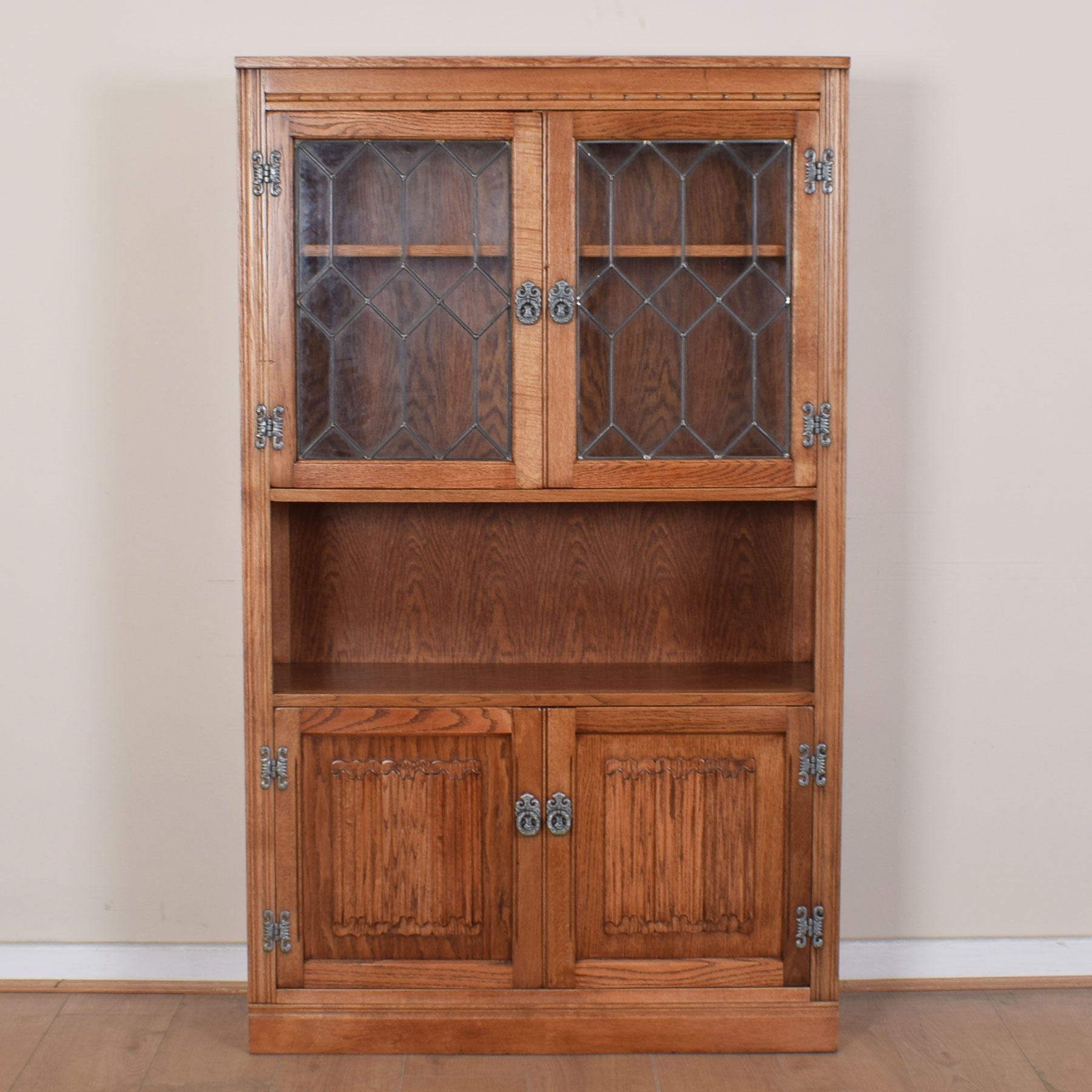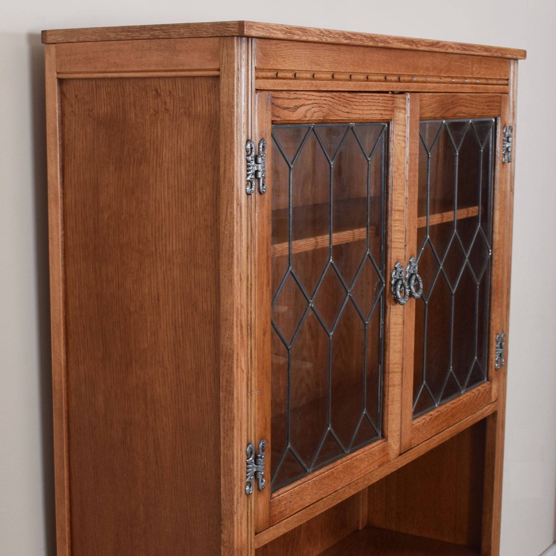 The upper leaded-glazed display cabinet features a single height-adjustable shelf, complementing the base shelf, to provide a generous amount of space for treasured ornaments and collectables. Below is an additional open display shelf above a two-door single-shelf cupboard. This quality-made cabinet comprises a mixture of solid oak with oak-veneered panels.
