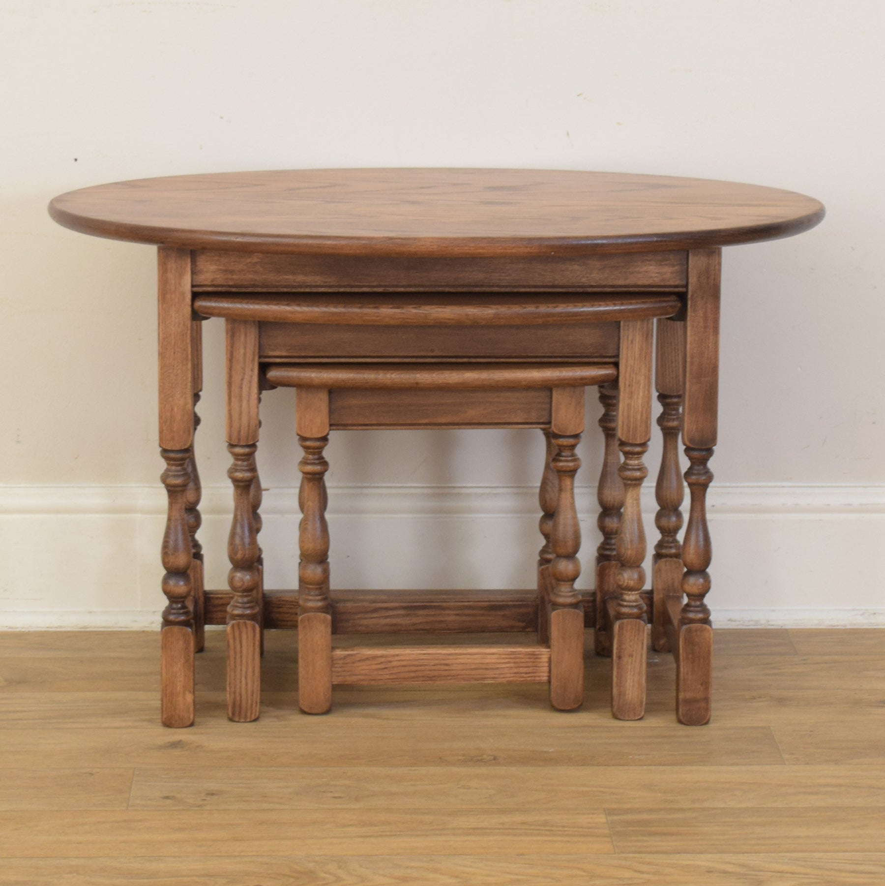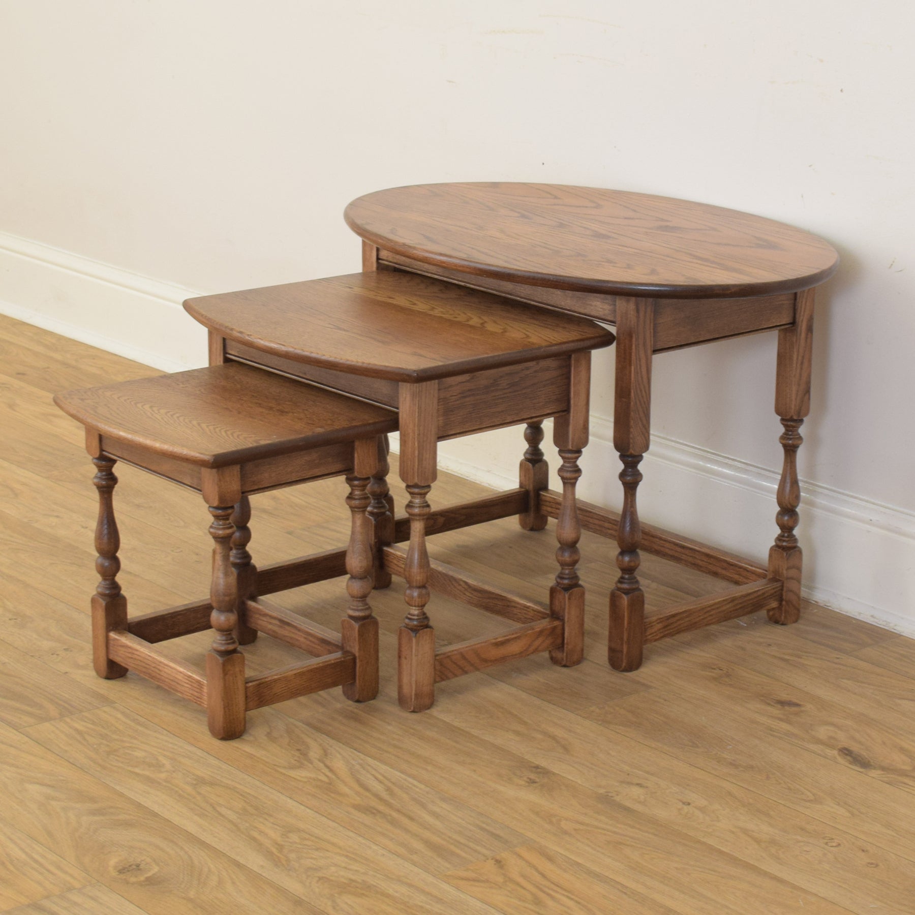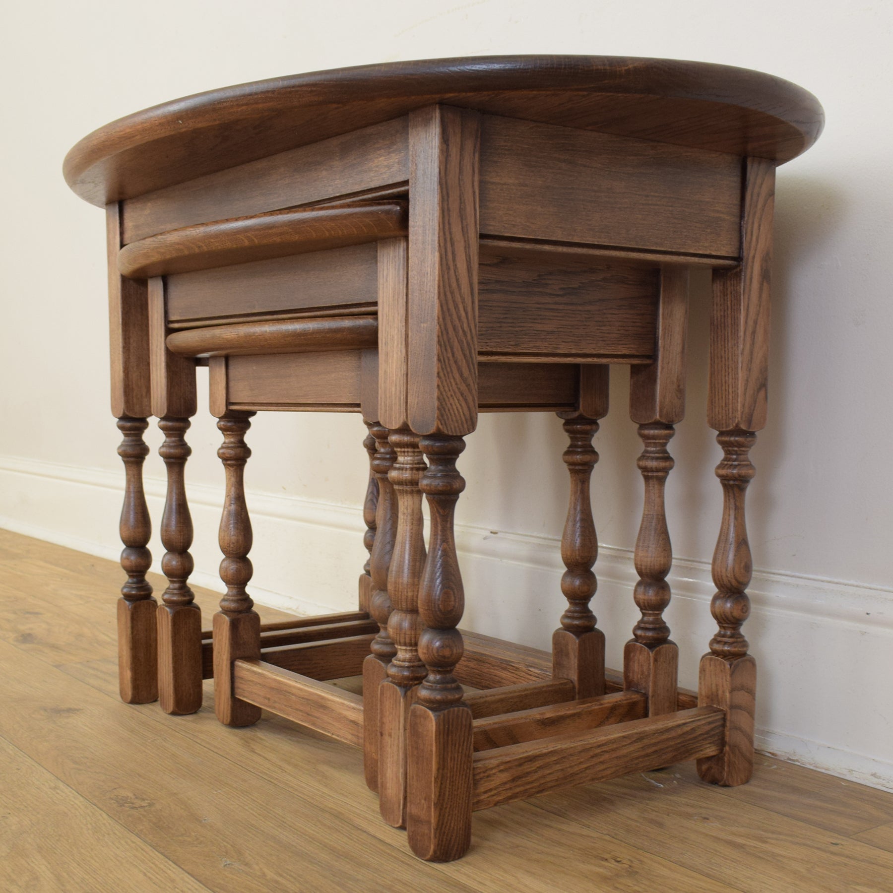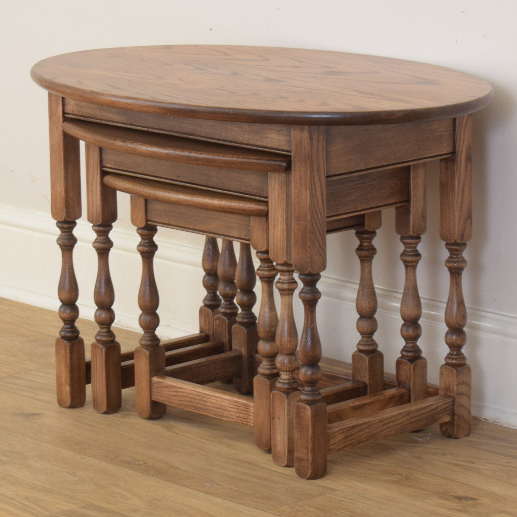 This classic three-piece nest is crafted from solid oak and features a traditional design with turned legs and stretcher supports. The largest table has a gently rounded oval top, while the smaller two feature rectangular tops with softly curved front edges. The proportions are well balanced, and each table fits snugly beneath the next, providing flexibility and convenience in everyday use.