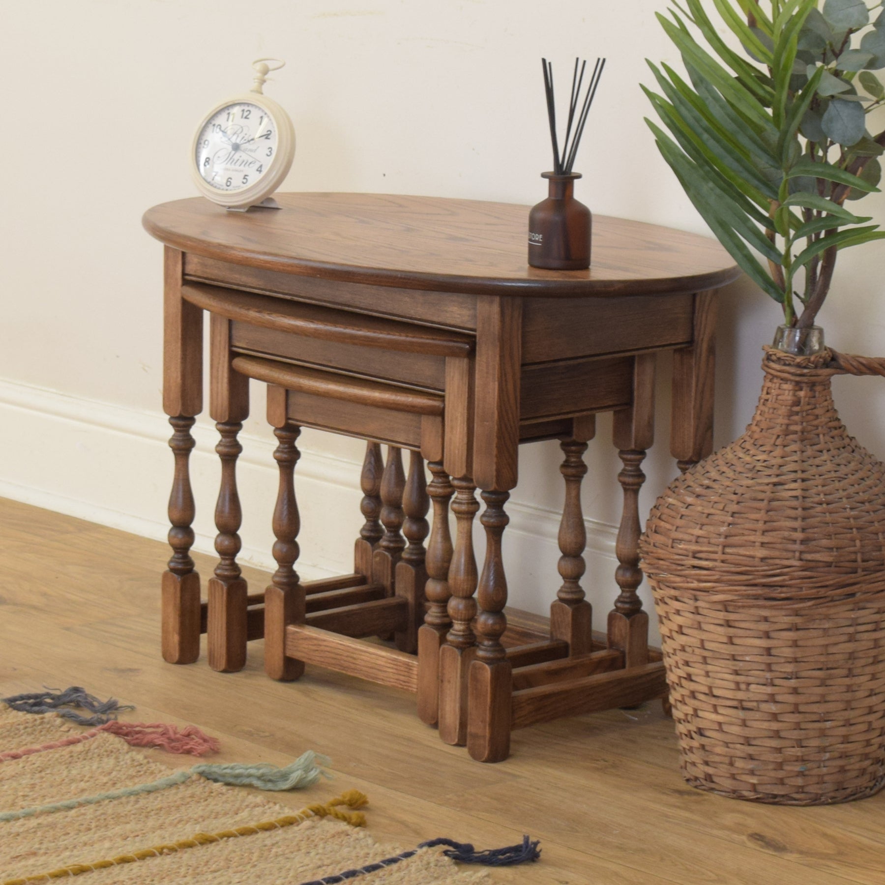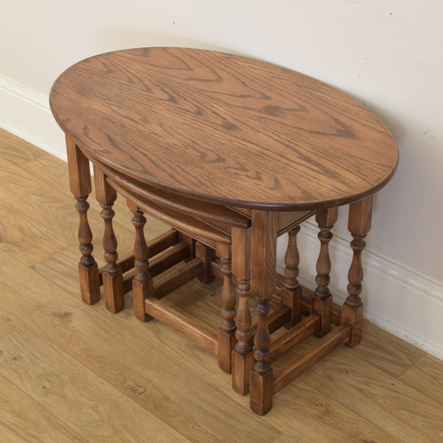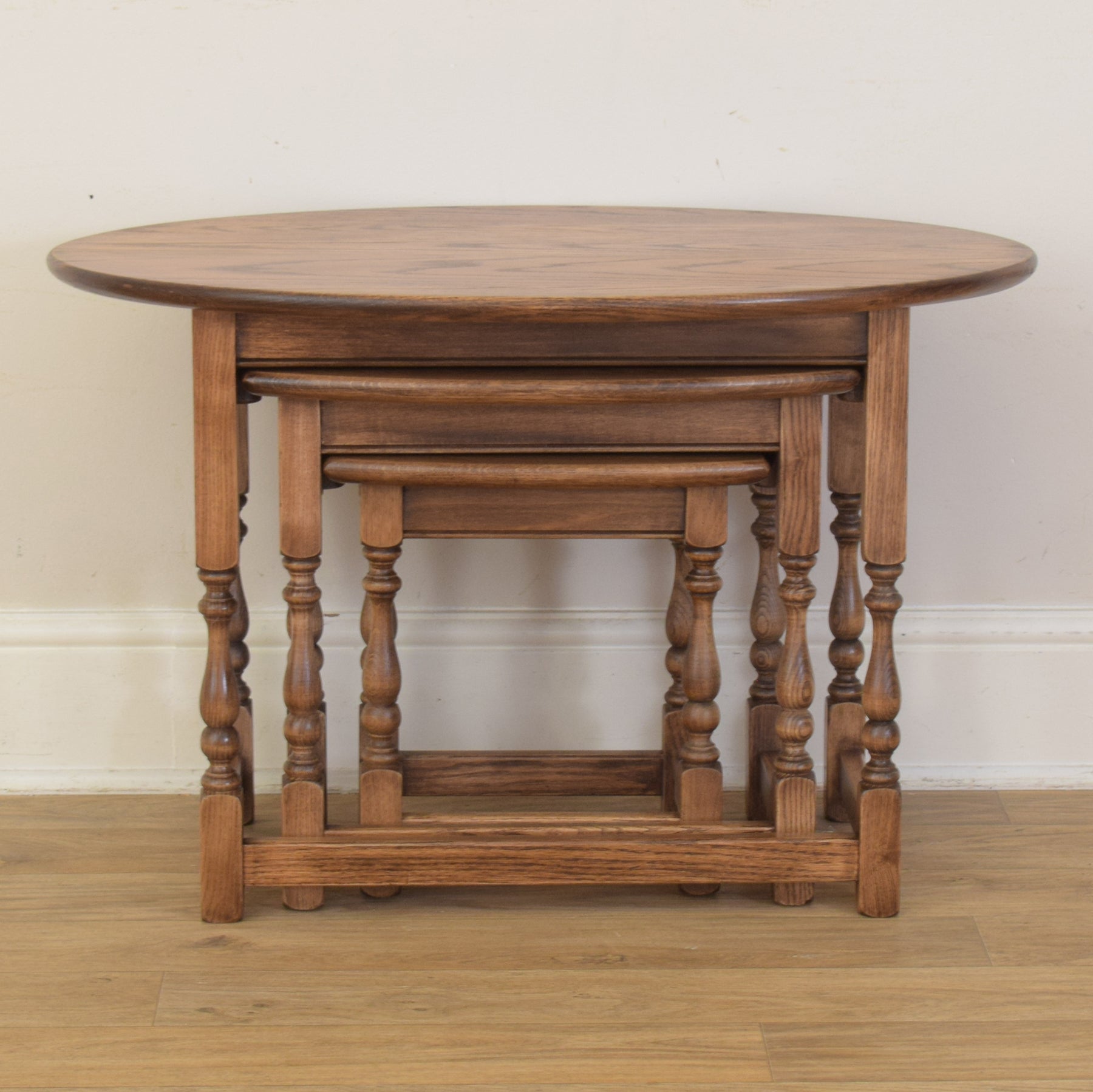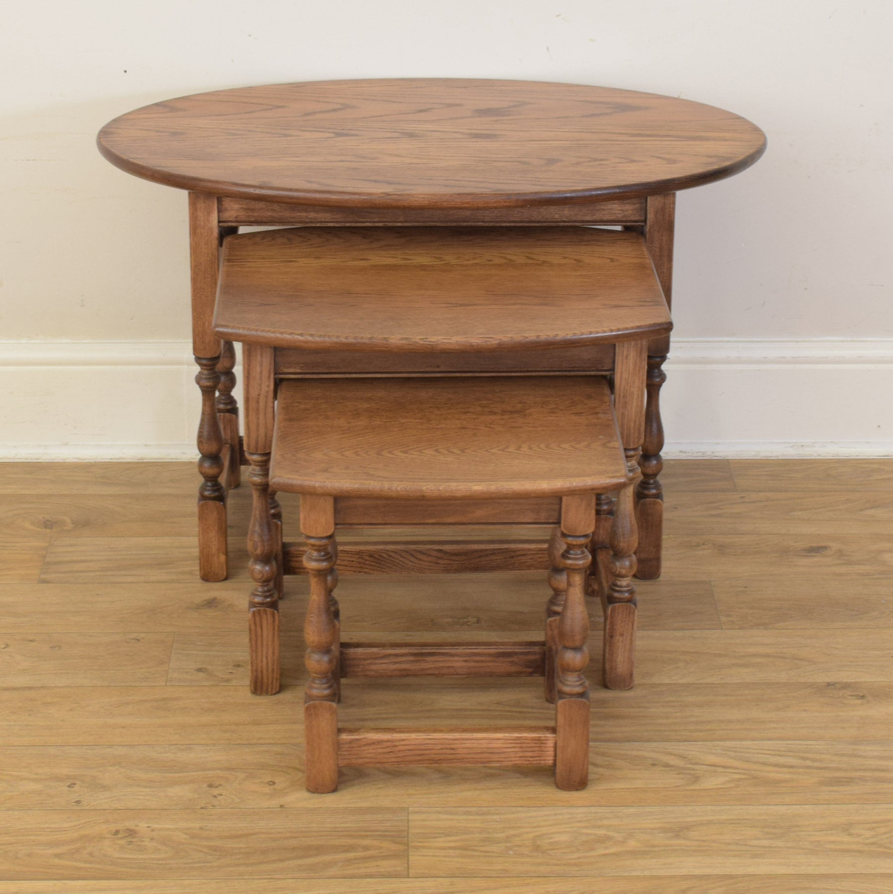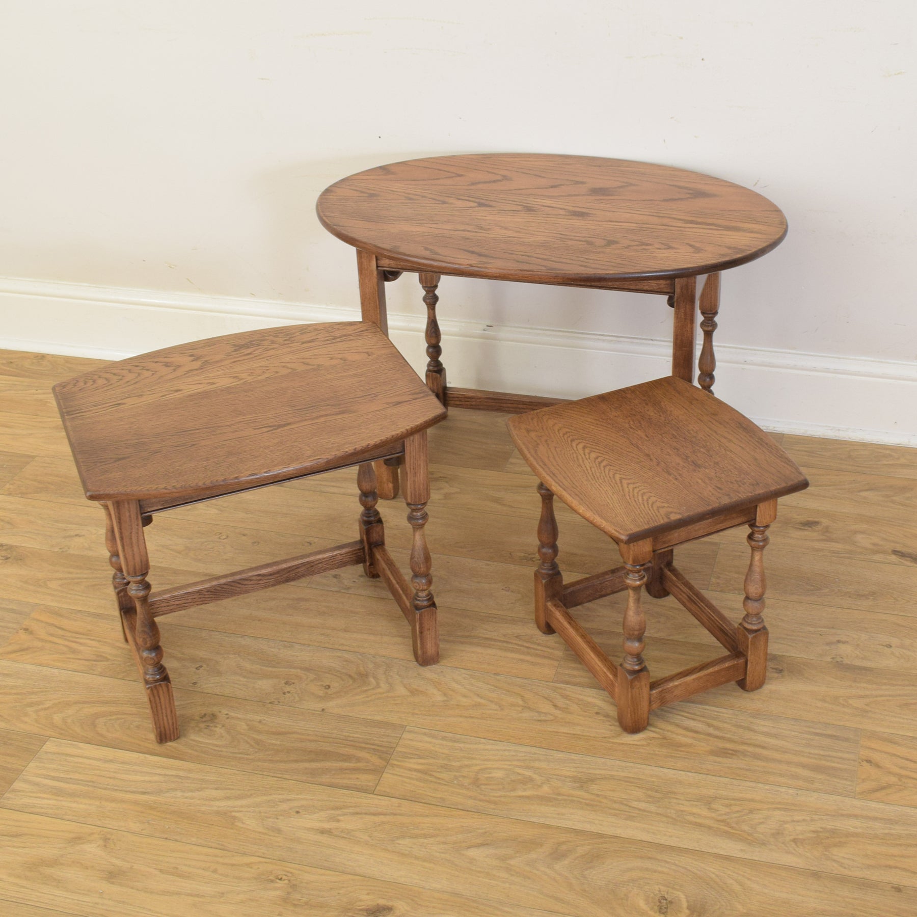 This classic three-piece nest is crafted from solid oak and features a traditional design with turned legs and stretcher supports. The largest table has a gently rounded oval top, while the smaller two feature rectangular tops with softly curved front edges. The proportions are well balanced, and each table fits snugly beneath the next, providing flexibility and convenience in everyday use.