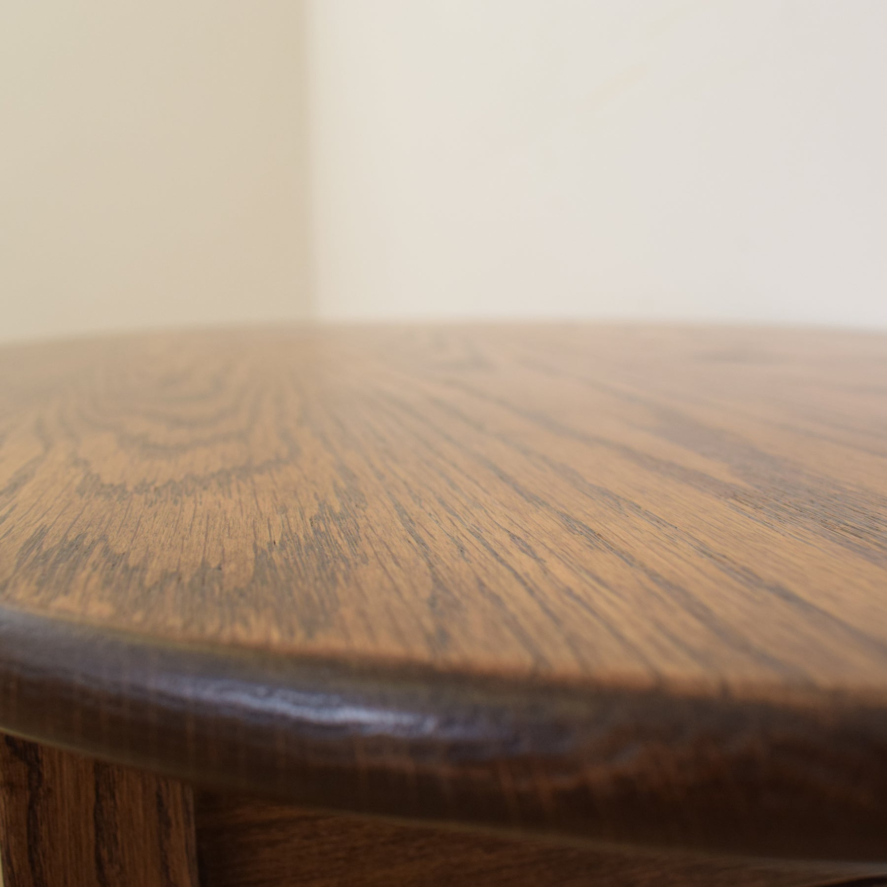 The set has been fully stripped of its previous finish and treated with several coats of durable matte lacquer. This process brings out the rich natural tones and attractive grain patterns of the oak, while offering a long-lasting, protective finish. These tables are made entirely from solid oak.