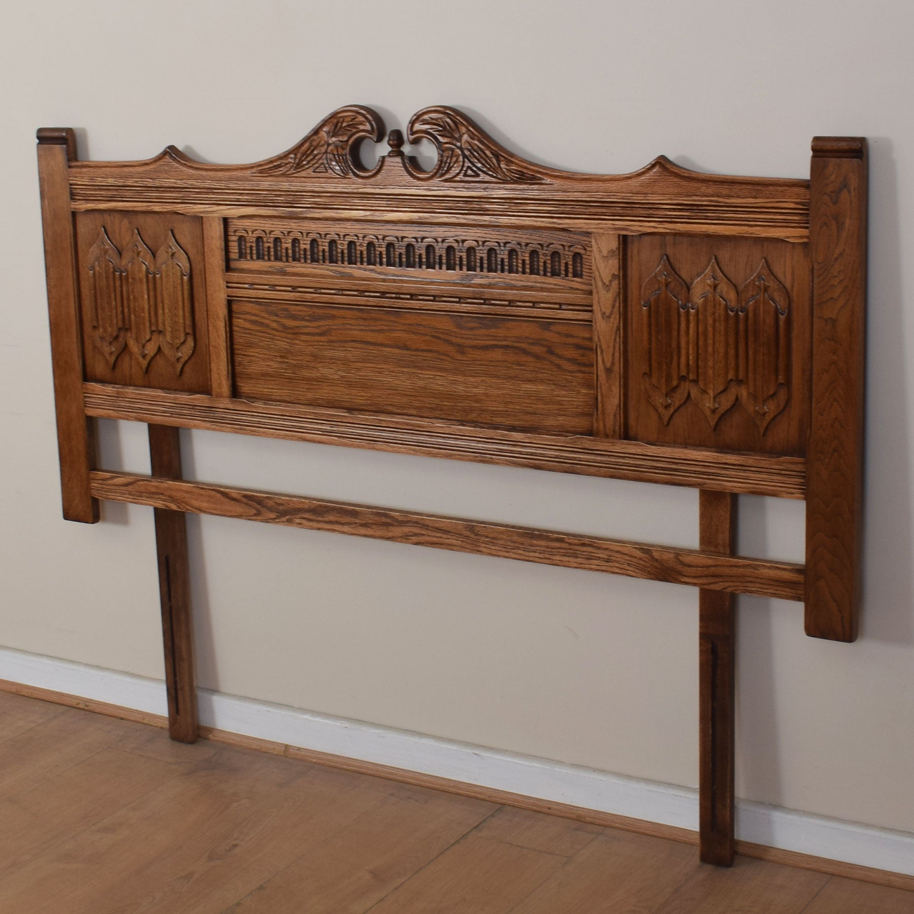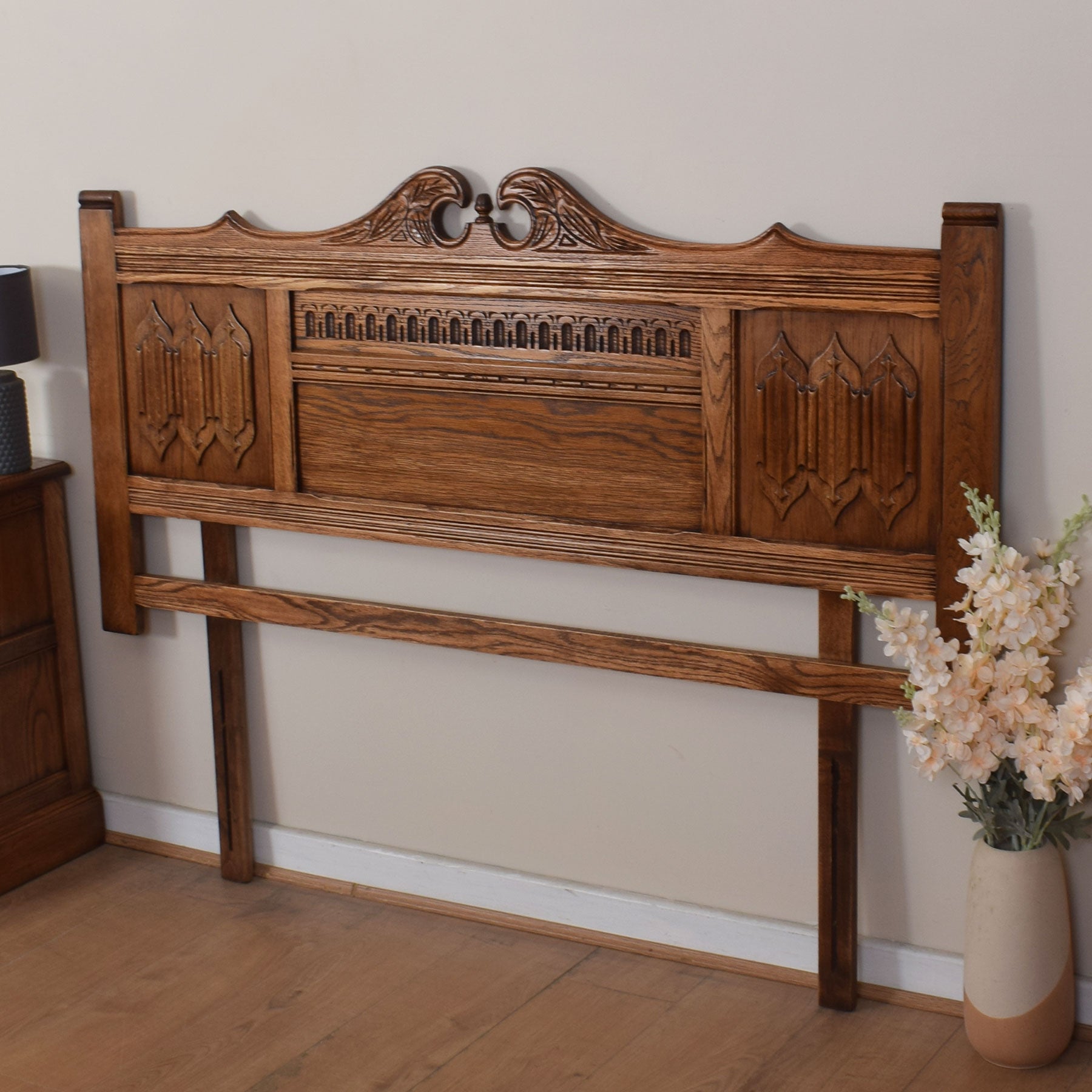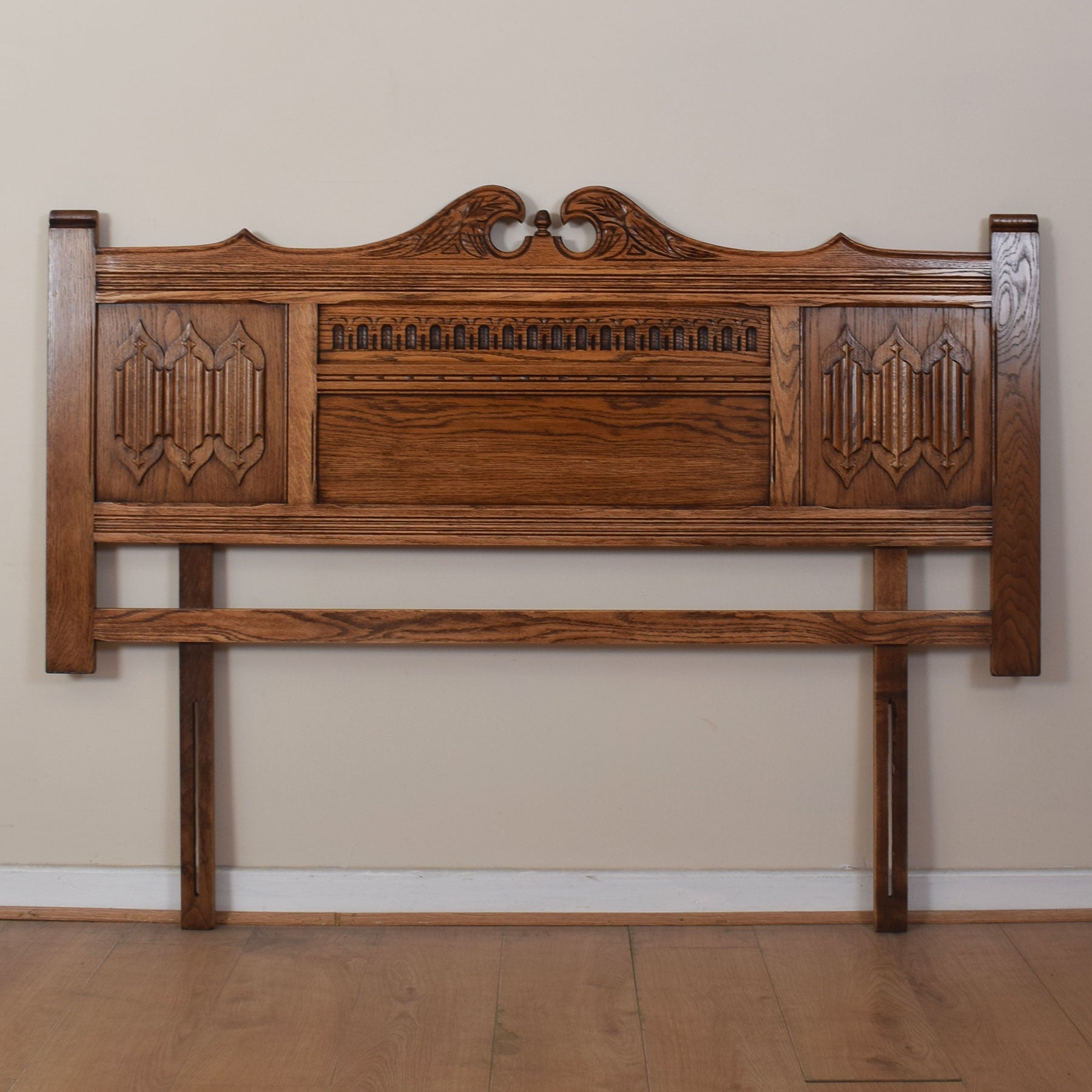 The panelled headboard features a beautifully carved top piece with traditional linen-fold and carved designs to the panels. The frame and carved sections of this item are oak, while the panels are oak veneer.