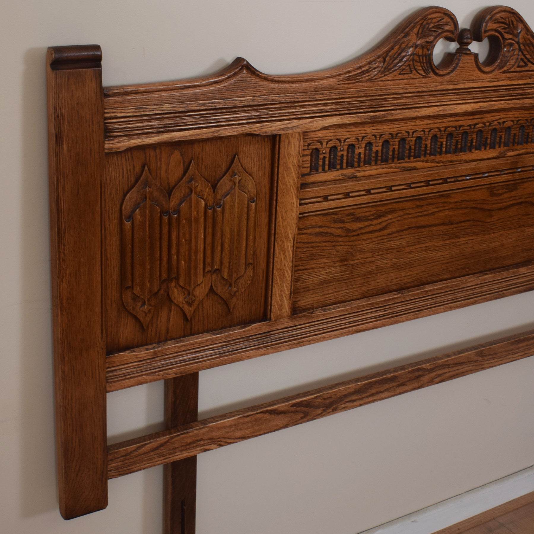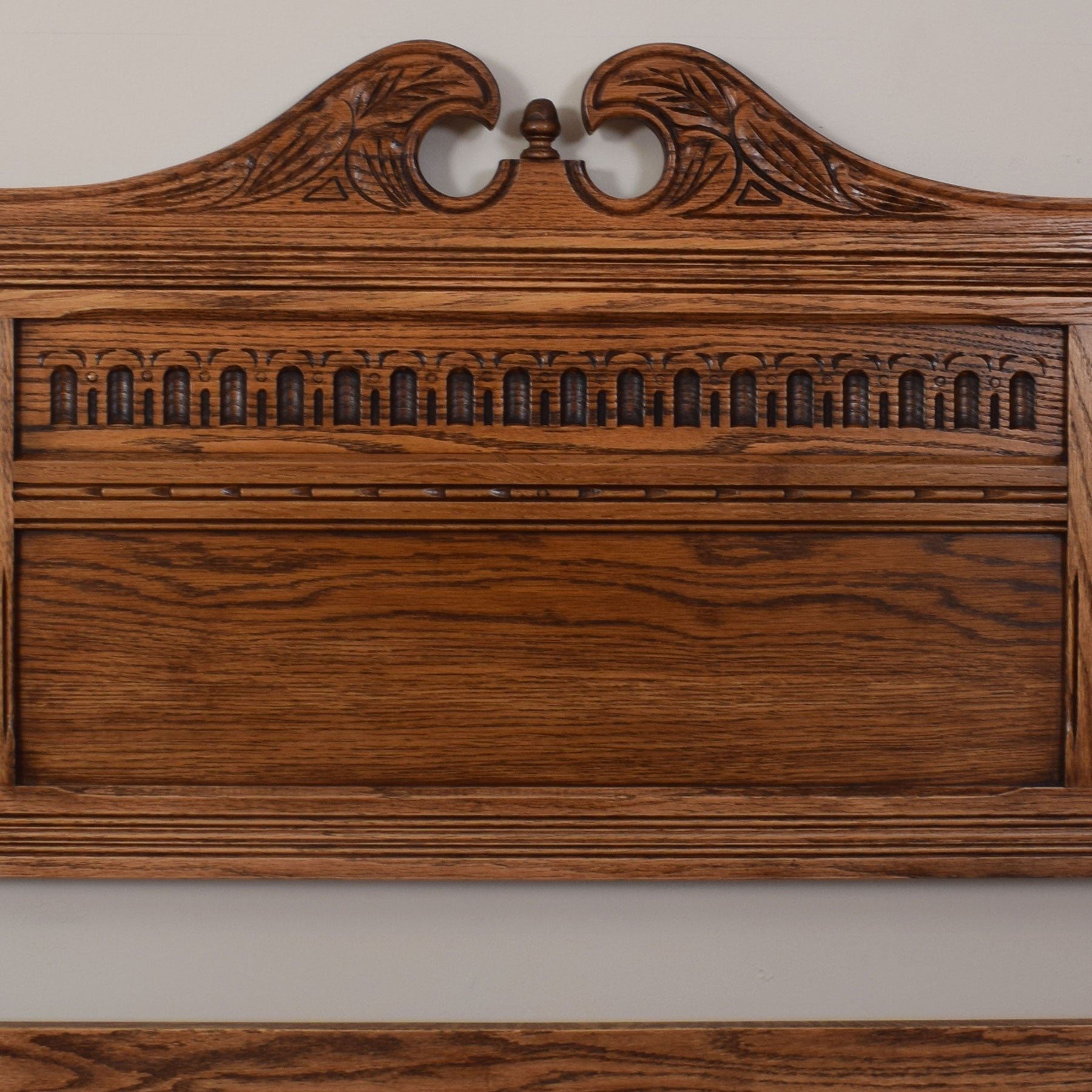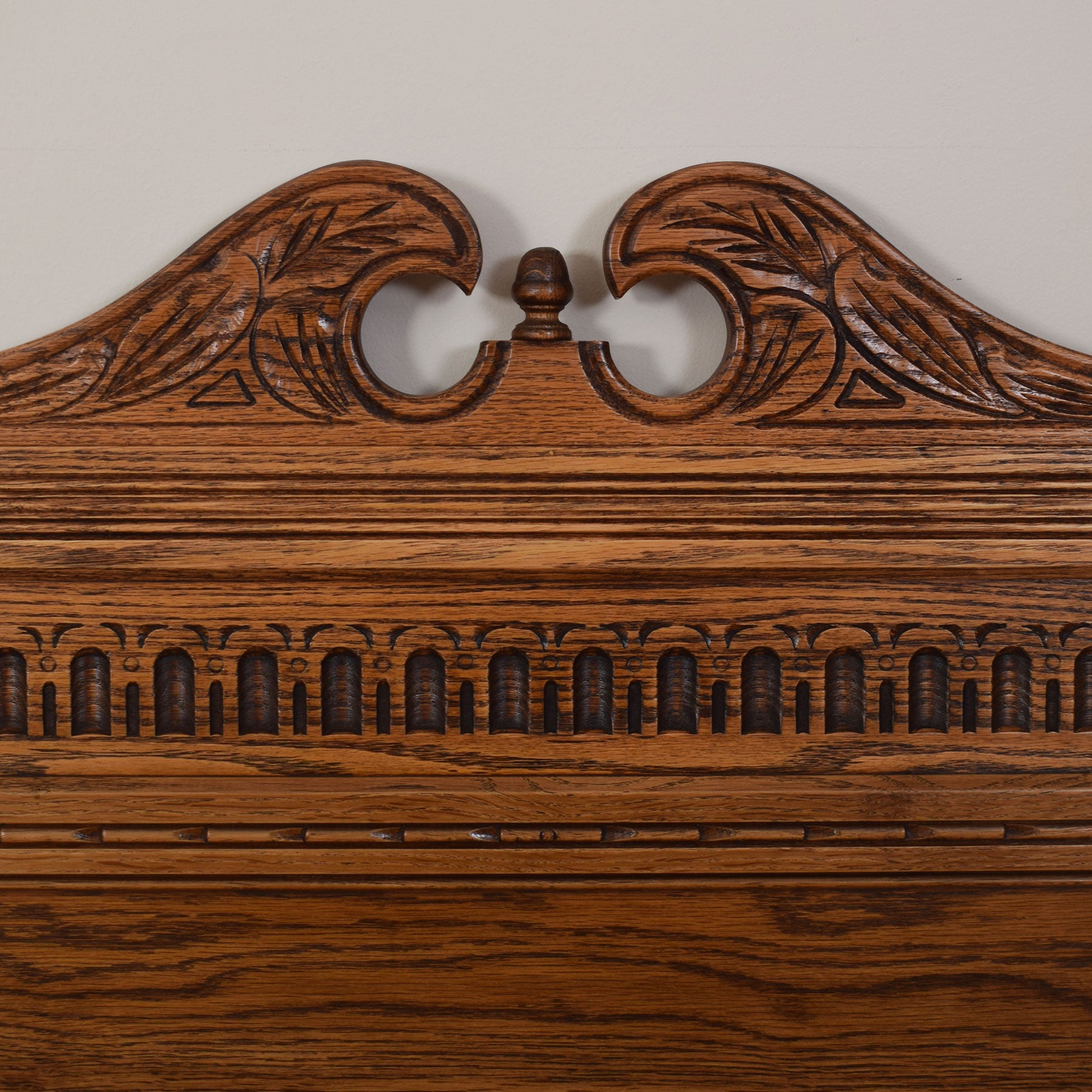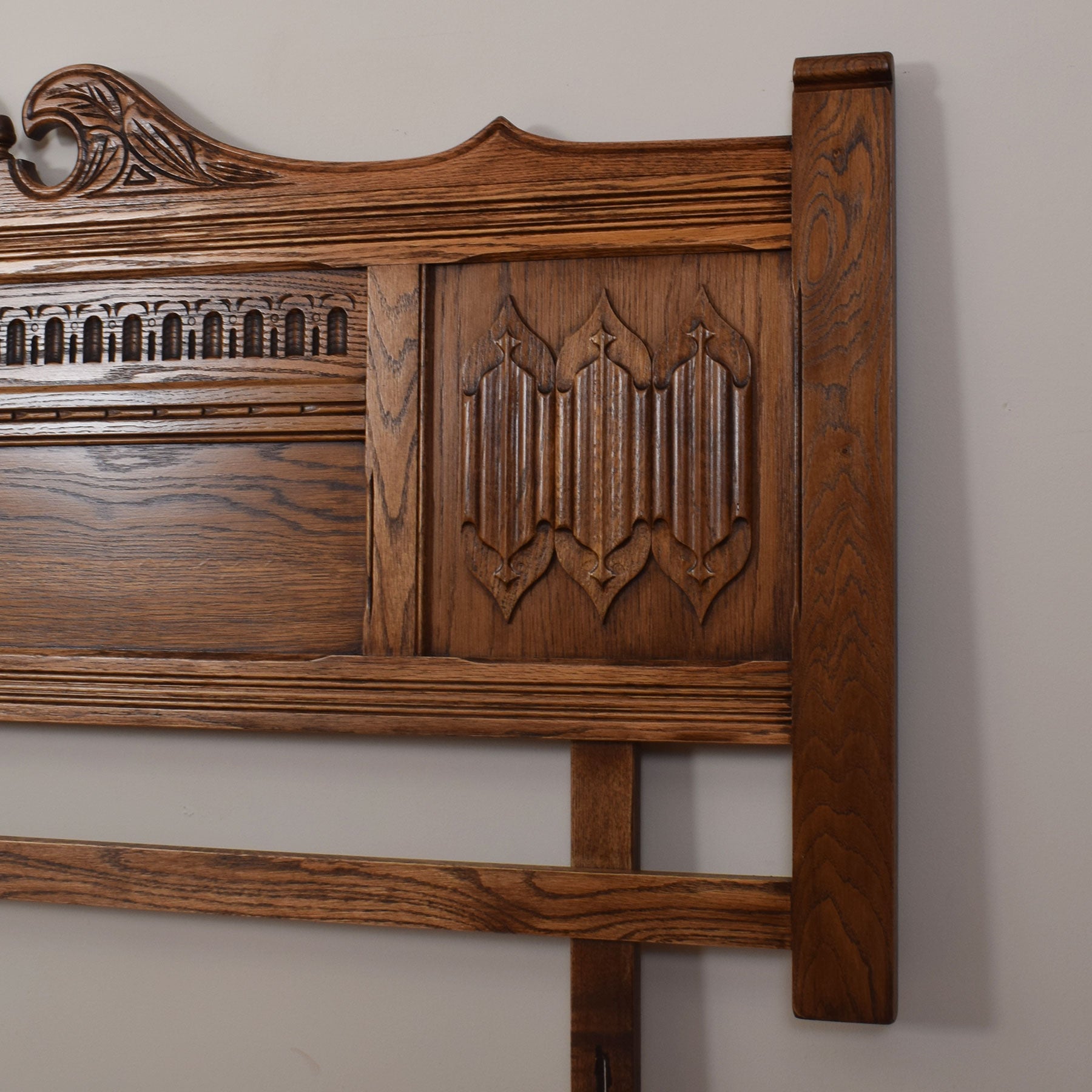 The panelled headboard features a beautifully carved top piece with traditional linen-fold and carved designs to the panels. The frame and carved sections of this item are oak, while the panels are oak veneer.