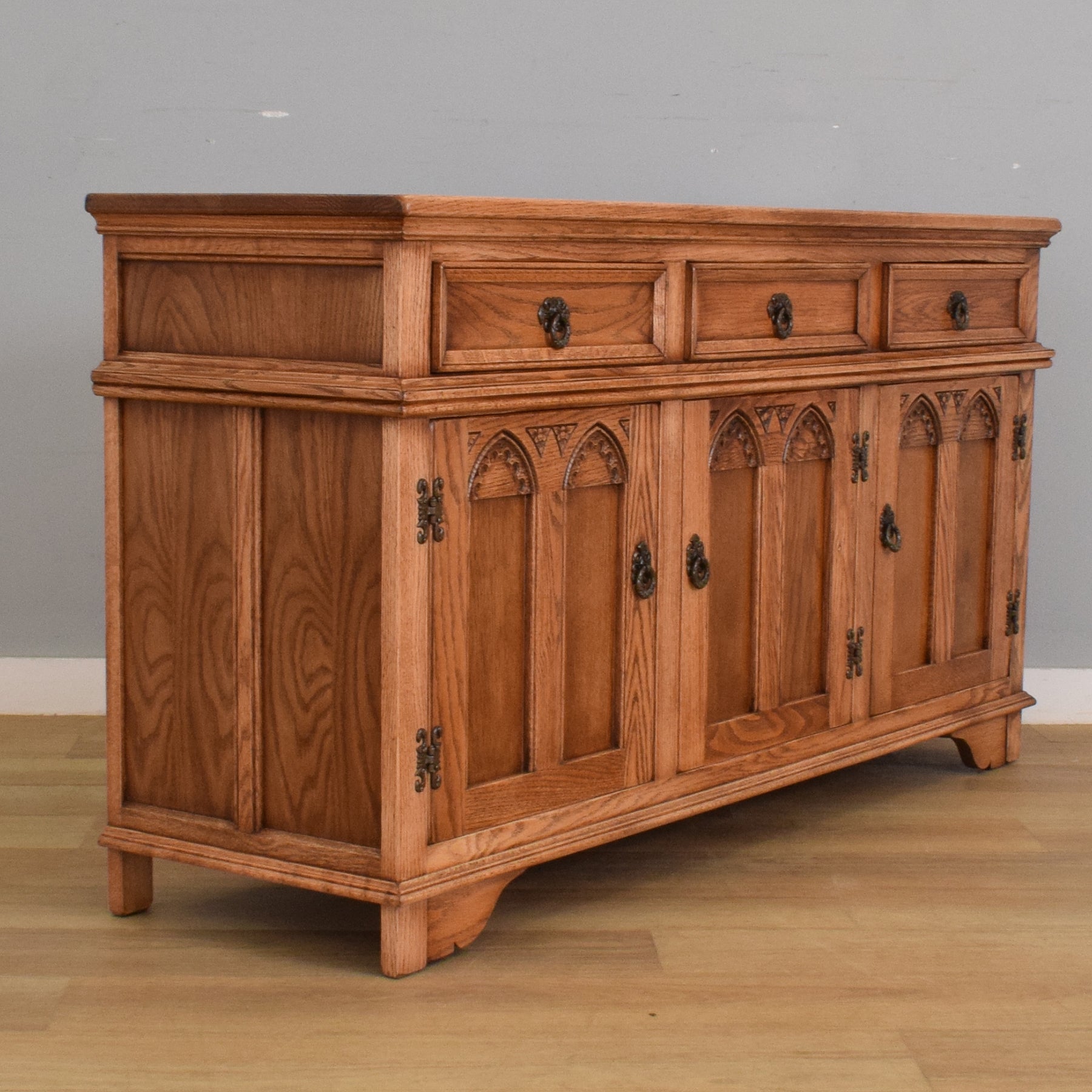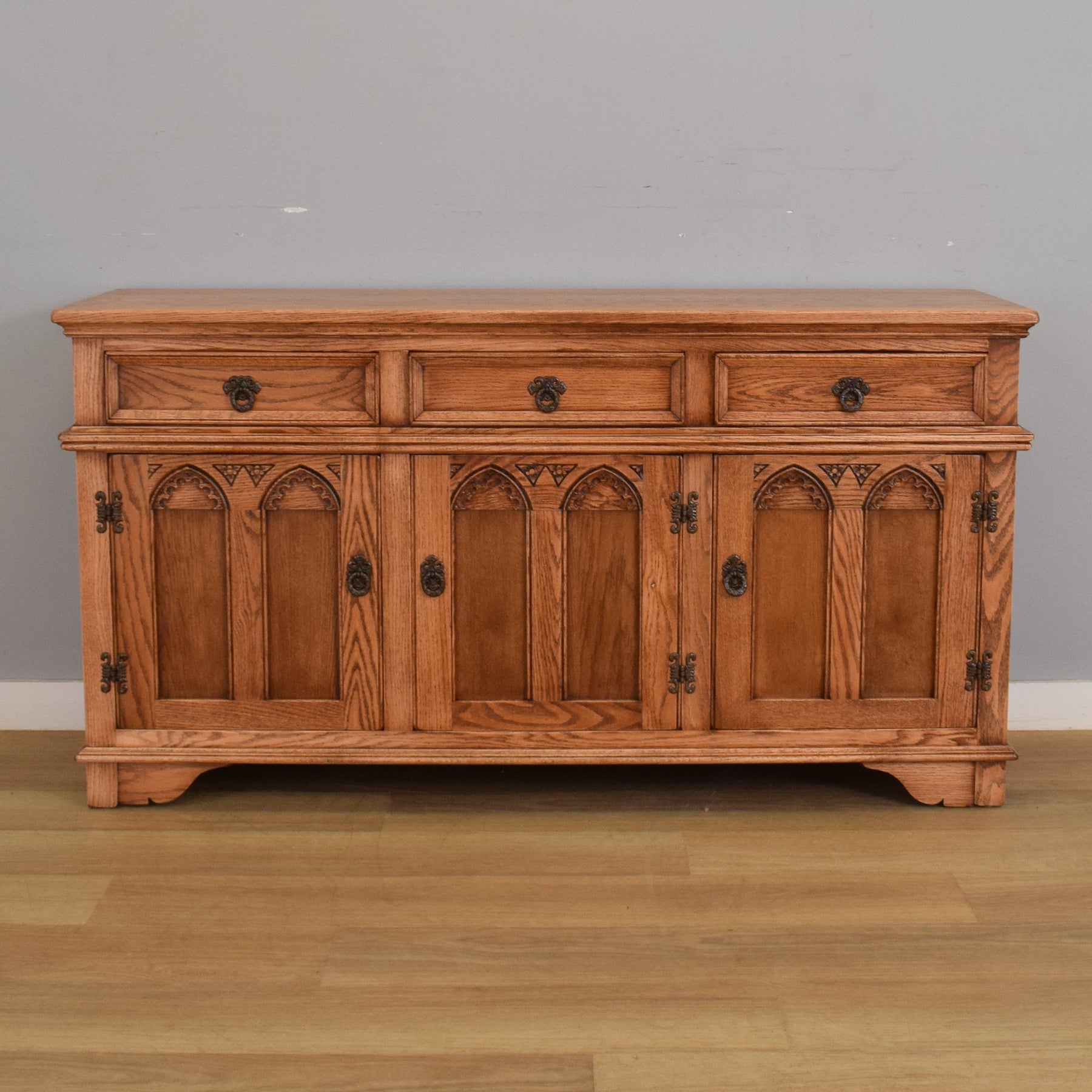 This piece features three drawers above three cupboard doors, providing a generous amount of storage for tableware, linens, or household items. The doors are detailed with carved Gothic-style arched panels and floral motifs, a hallmark of the Old Charm range, while traditional metal ring handles and decorative hinges complete the look. The moulded edges and bracket feet lend a balanced and substantial appearance, while the warm oak grain runs consistently across the top and drawer fronts.