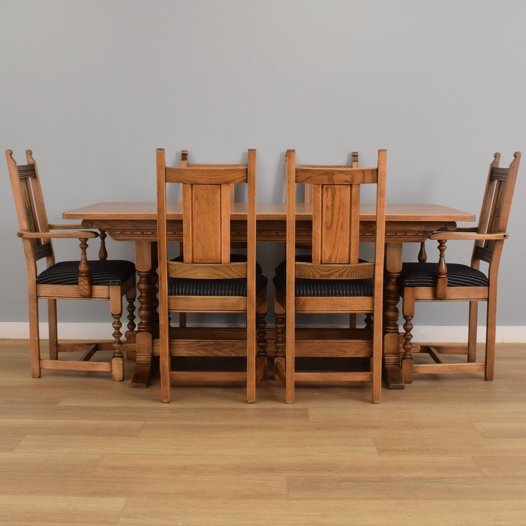This is an Old Charm oak dining set, comprising a generously proportioned refectory-style table and six matching chairs, including two carvers. The chairs feature carved back panels with a distinctive floral motif, complemented by turned front legs and stretcher supports for added stability. Upholstered in a dark striped fabric, the seats offer a comfortable contrast to the lighter oak tones. The table showcases a thick rectangular top with gently softened edges, supported by ornately turned legs and twin carved pedestal bases joined by a stretcher. Decorative Gothic-style cutouts on the pedestals give the set a sense of character and heritage.