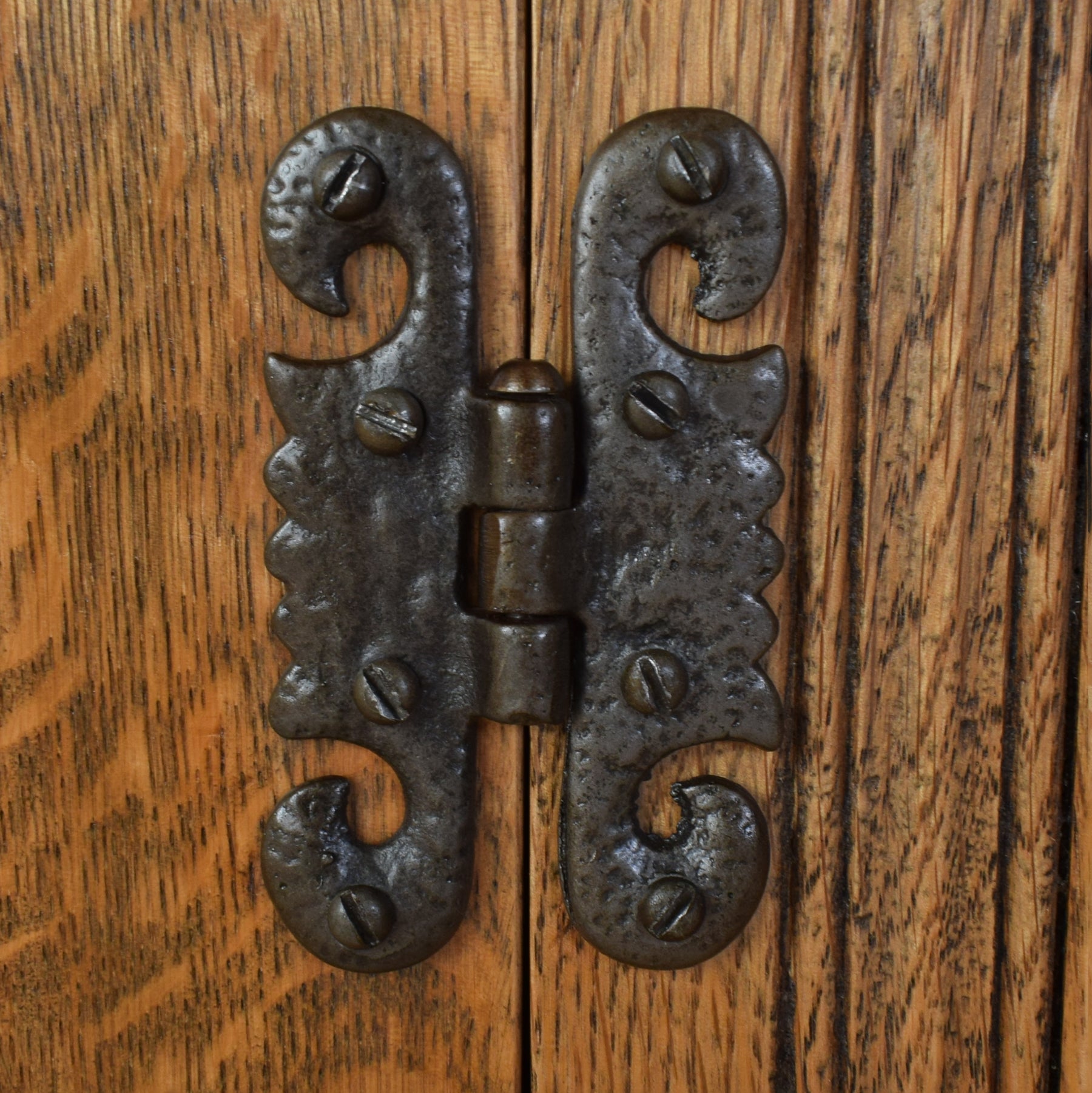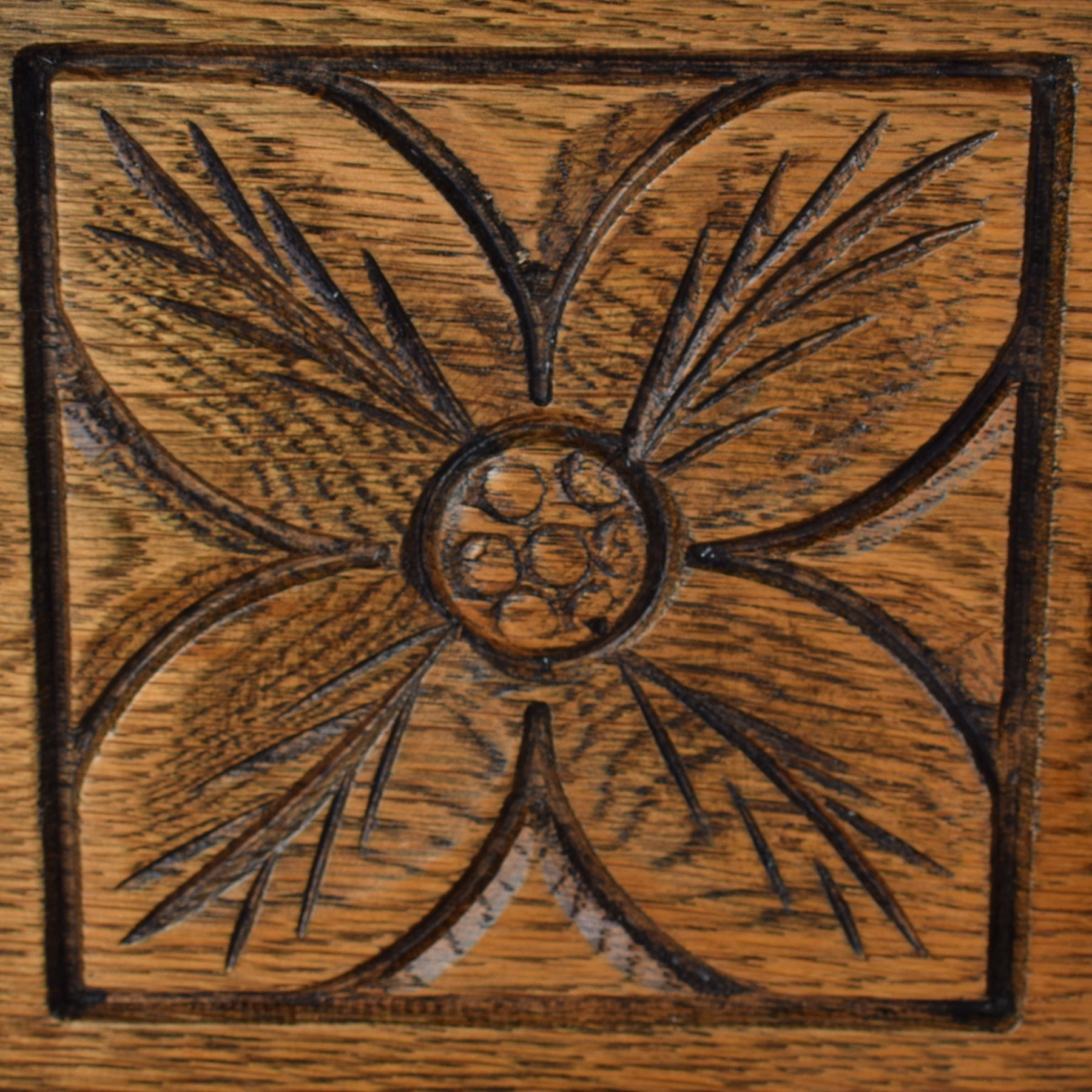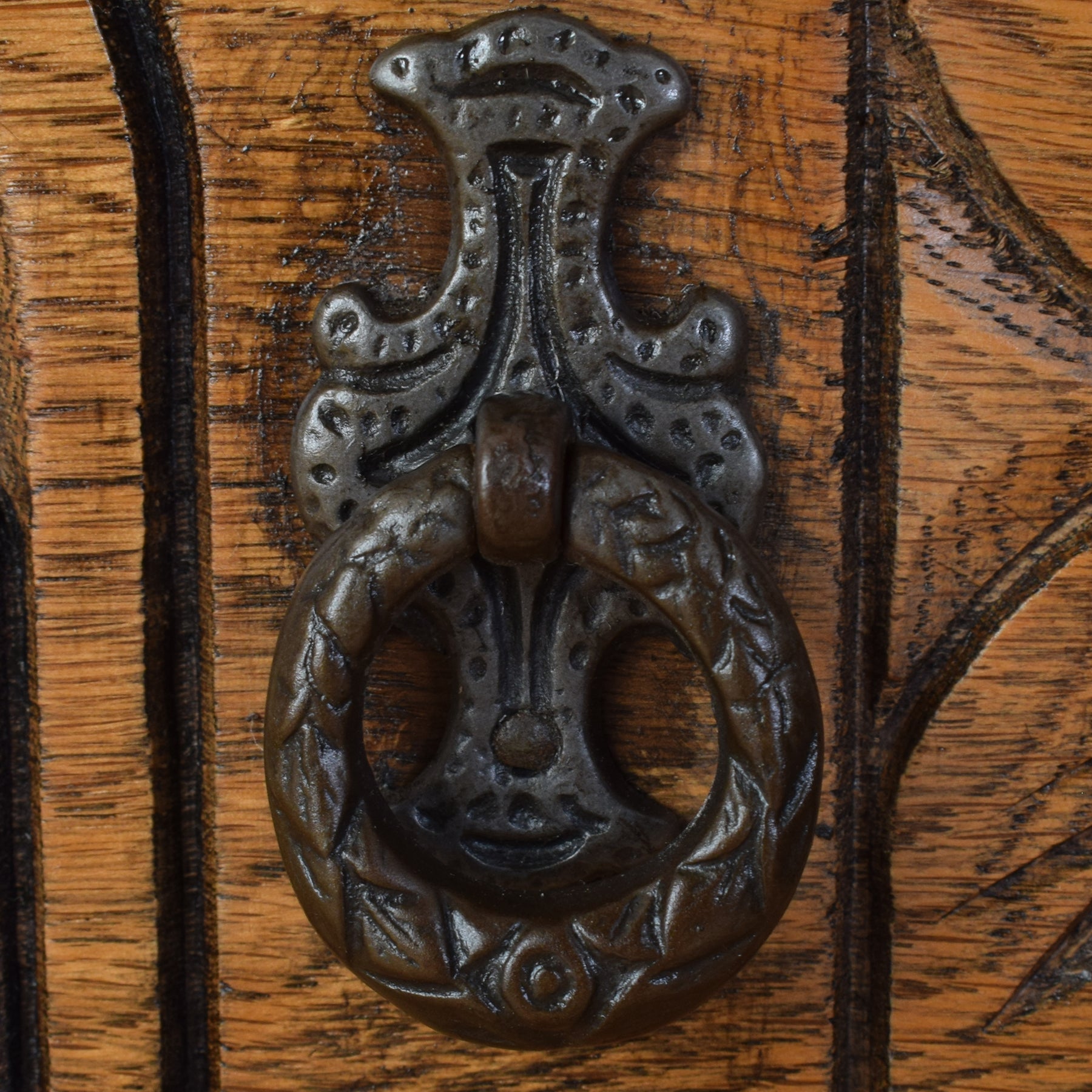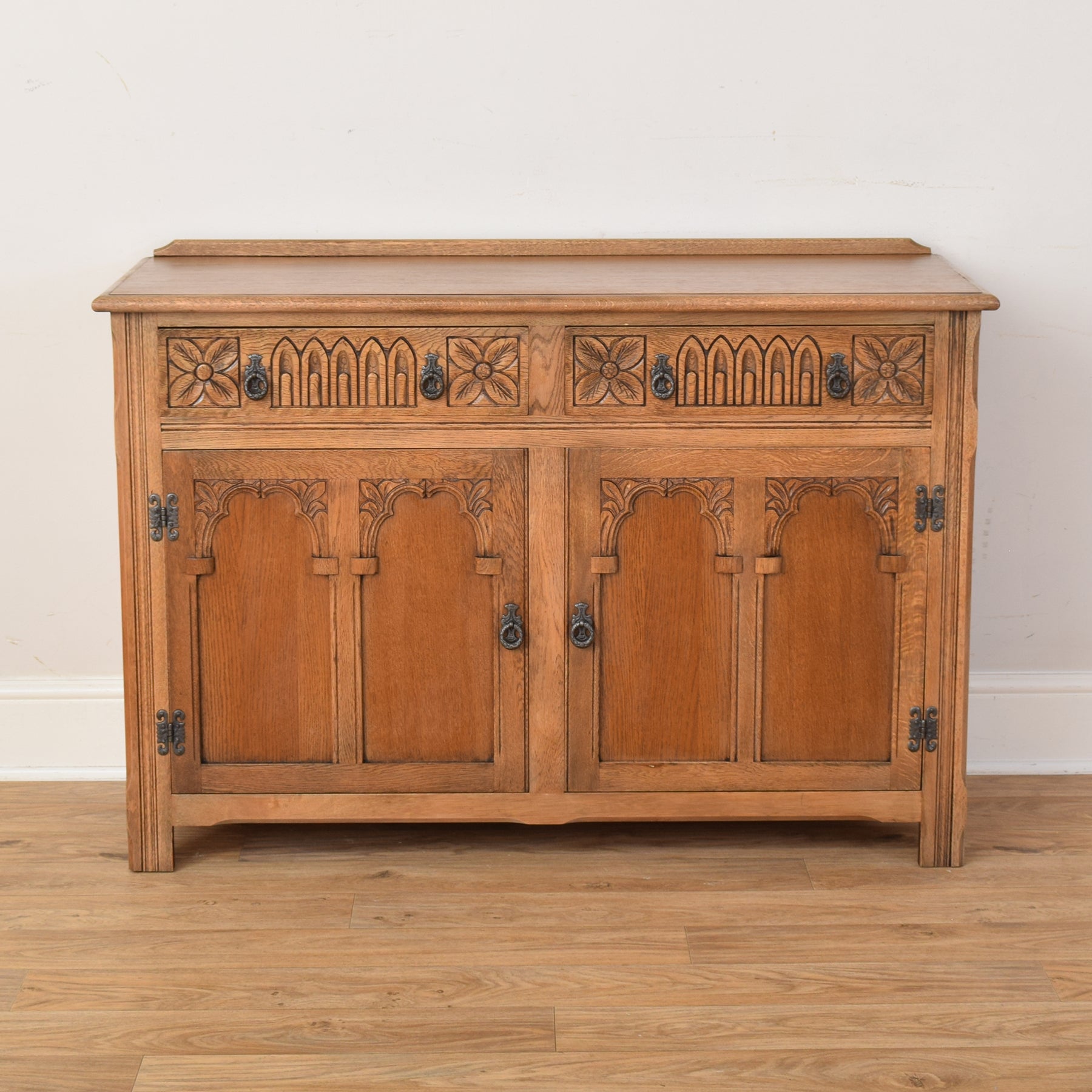 This ‘Old Charm’ sideboard showcases classic craftsmanship, featuring two upper drawers and a pair of lower cupboard doors. The front is beautifully adorned with hand-carved details, including floral motifs and gothic-style arches, adding depth and texture to its design. The iron drop handles and hinges provide an attractive contrast, highlighting its vintage appeal while maintaining practicality.