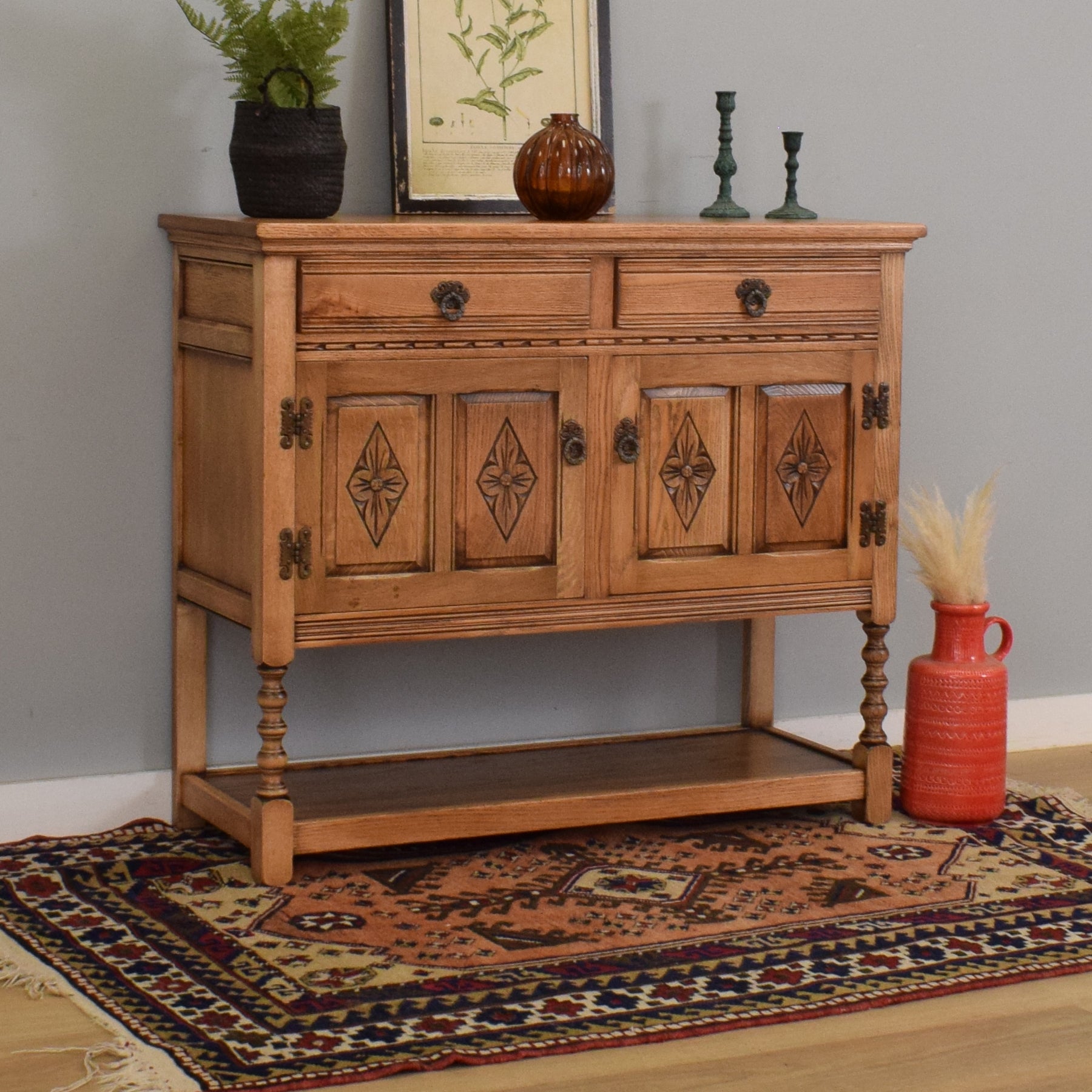 The piece features two upper drawers with decorative drop handles, sitting above a pair of carved cupboard doors with stylised floral diamond motifs. Twisted baluster legs and a full-width lower shelf give it a distinct character, while the top provides ample surface space for serving, display, or daily essentials. Inside, the cabinet is divided into two open sections for flexible storage, making it both charming and highly functional.