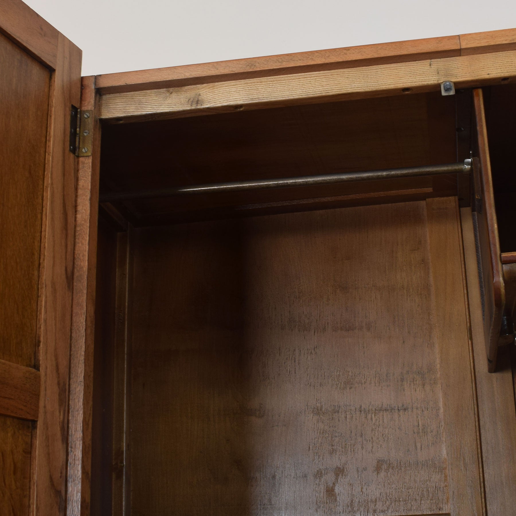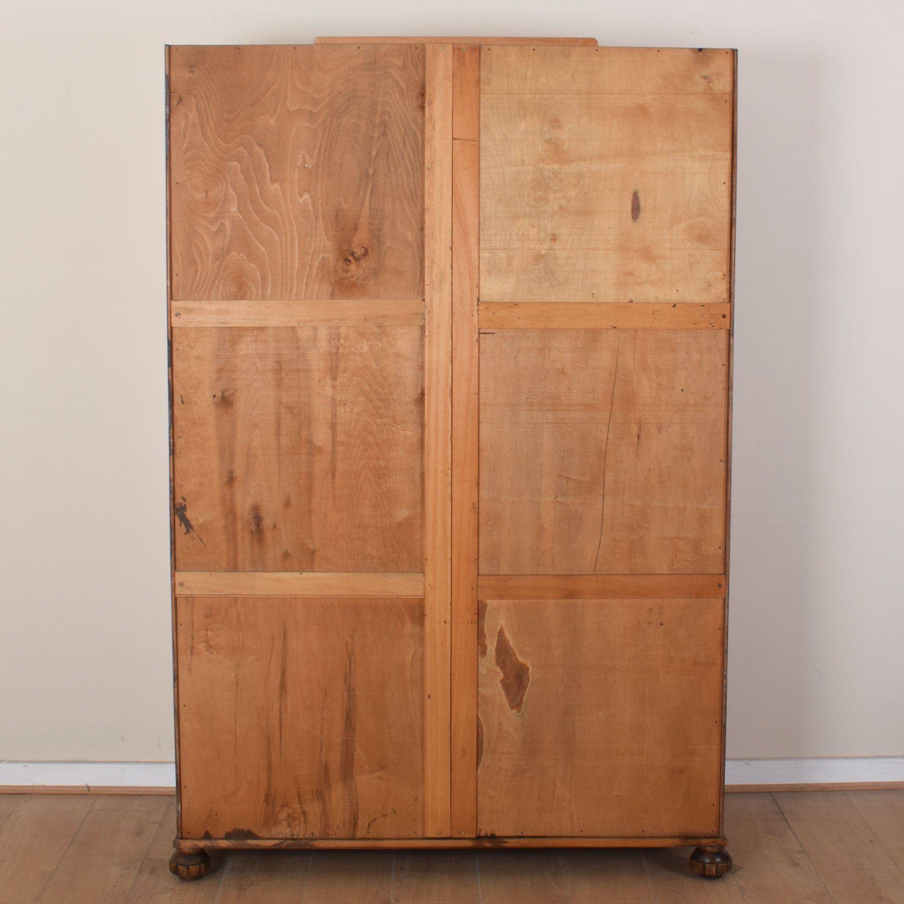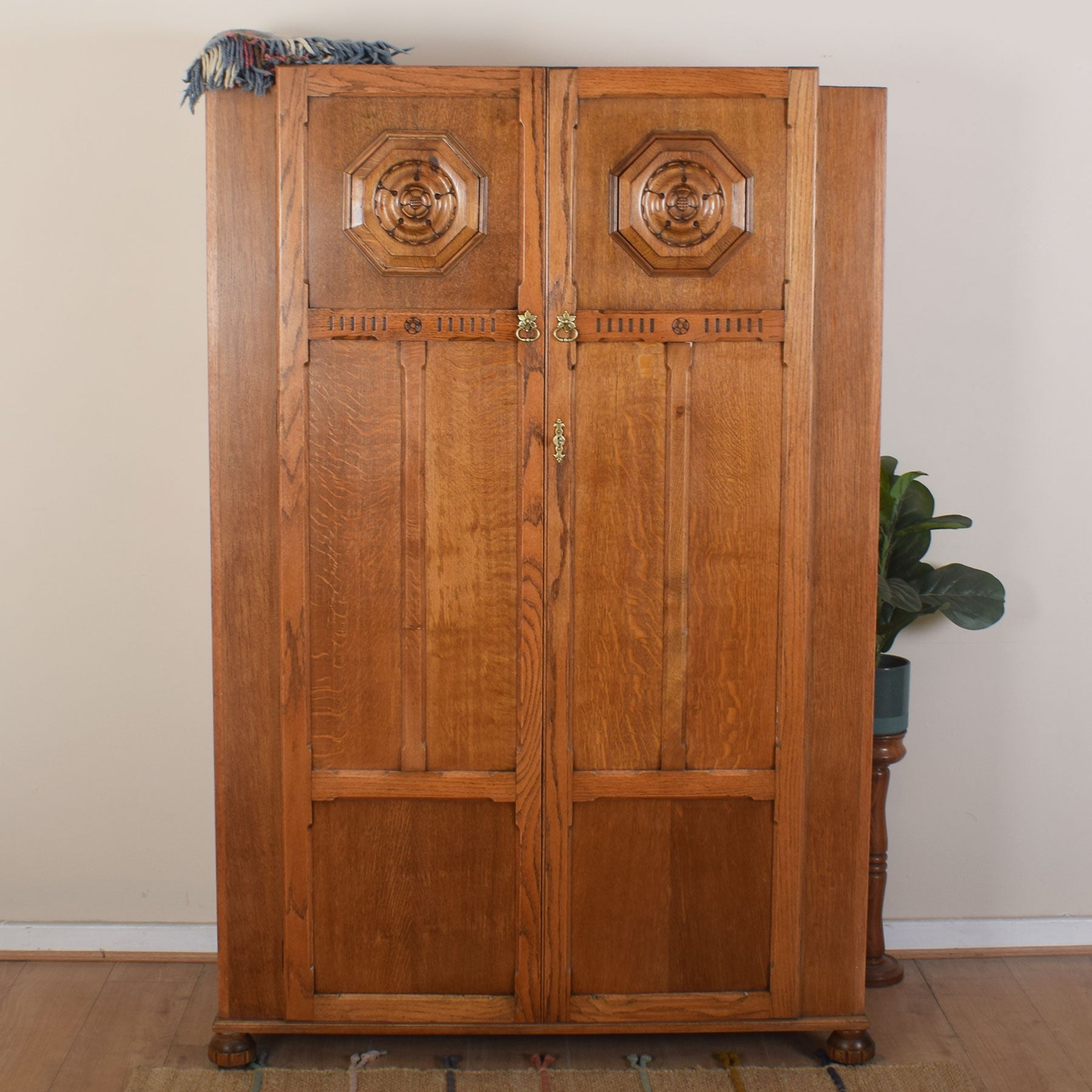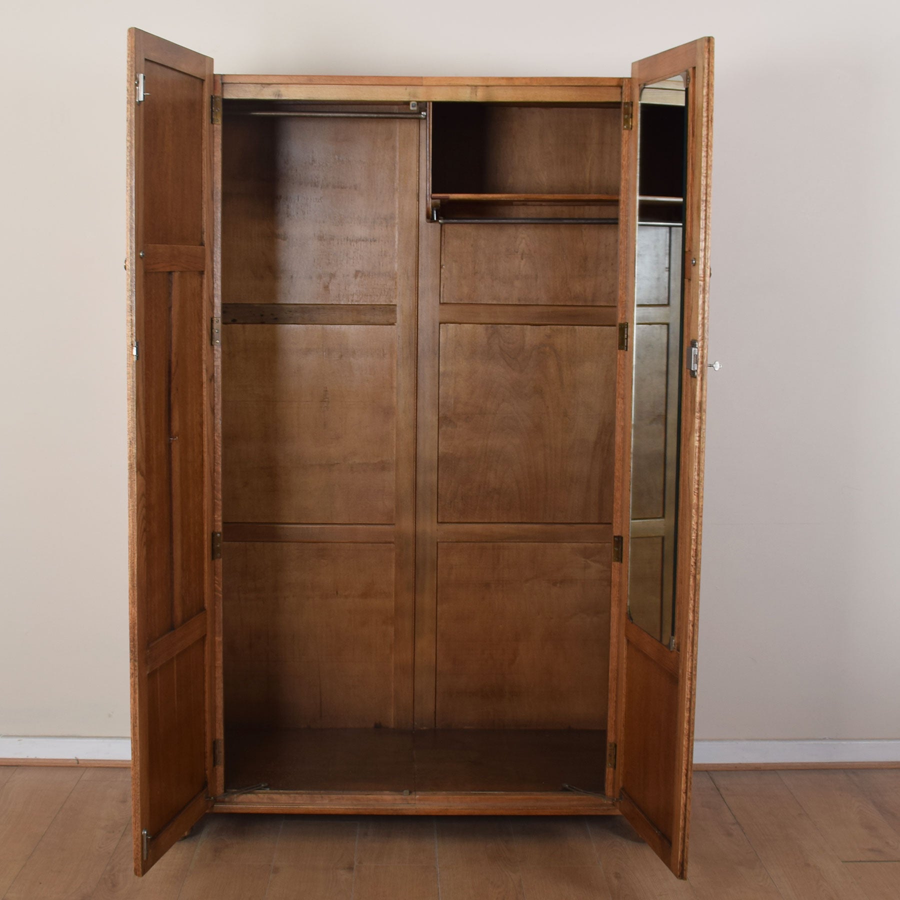 The full-height, centrally positioned double doors open to a full-height hanging section on the left with a useful upper shelf above a further hanging section on the right. The base of the wardrobe offers ample floor space for shoes and a variety of boxed items. This beautifully crafted wardrobe is oak with oak-veneered panels and plywood rear sections.