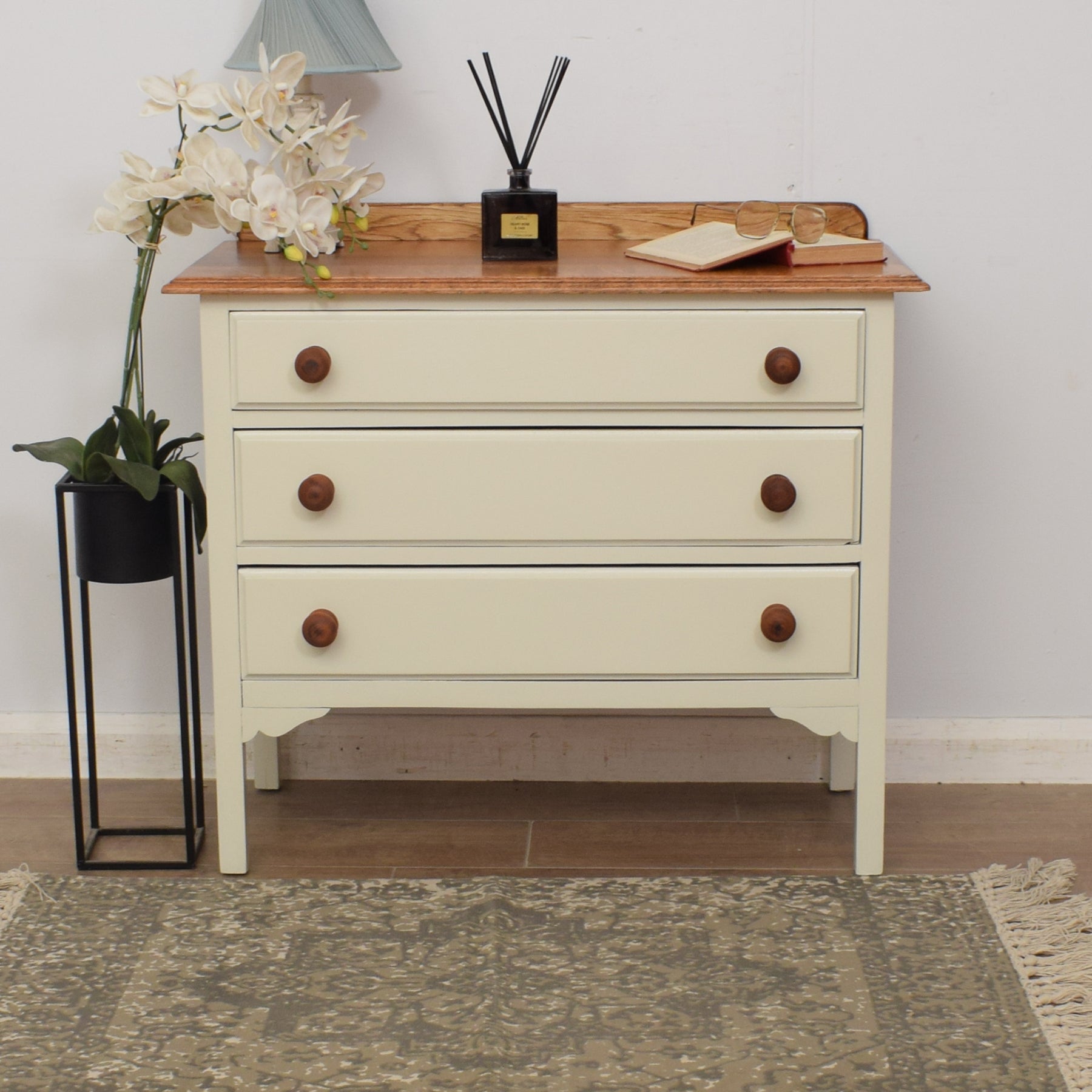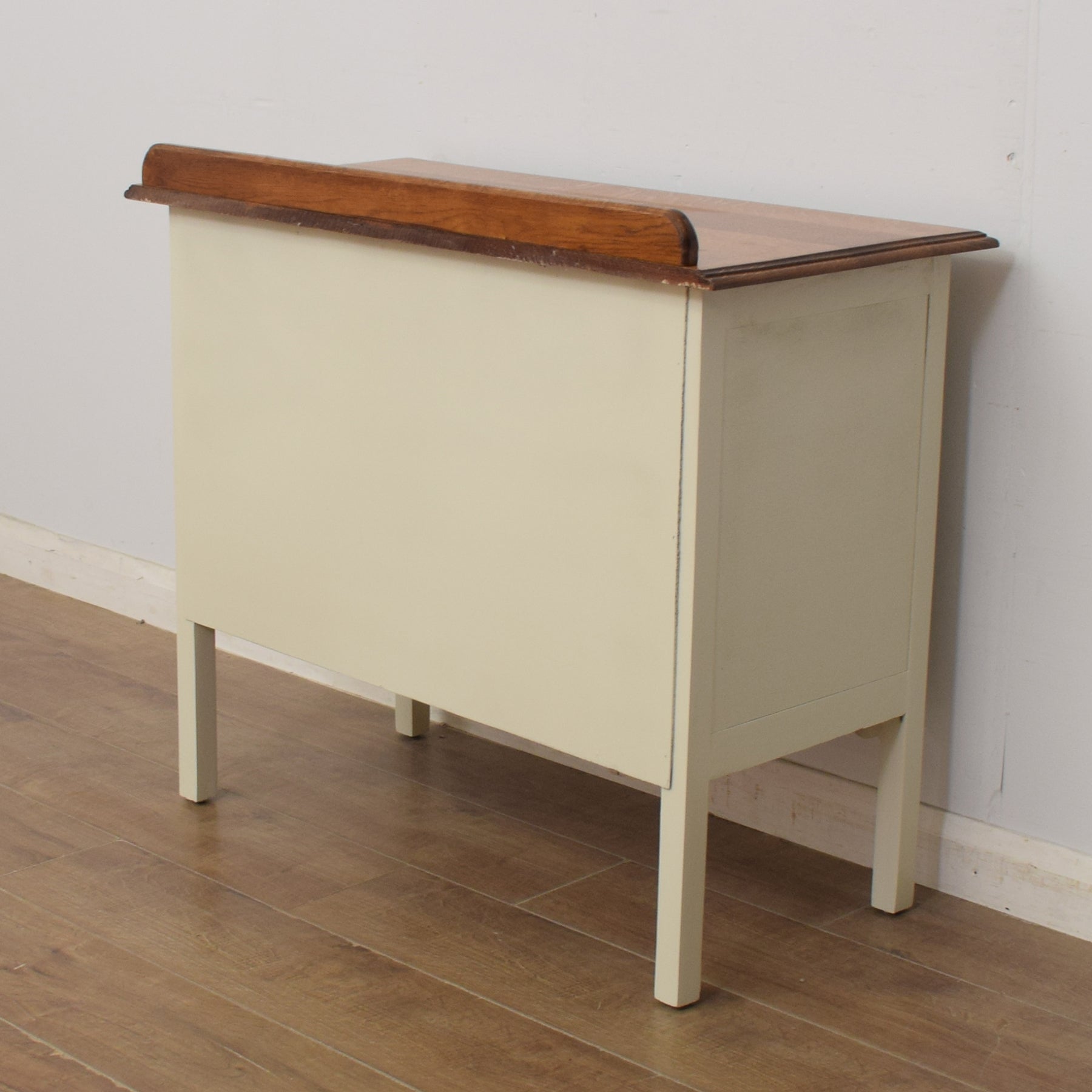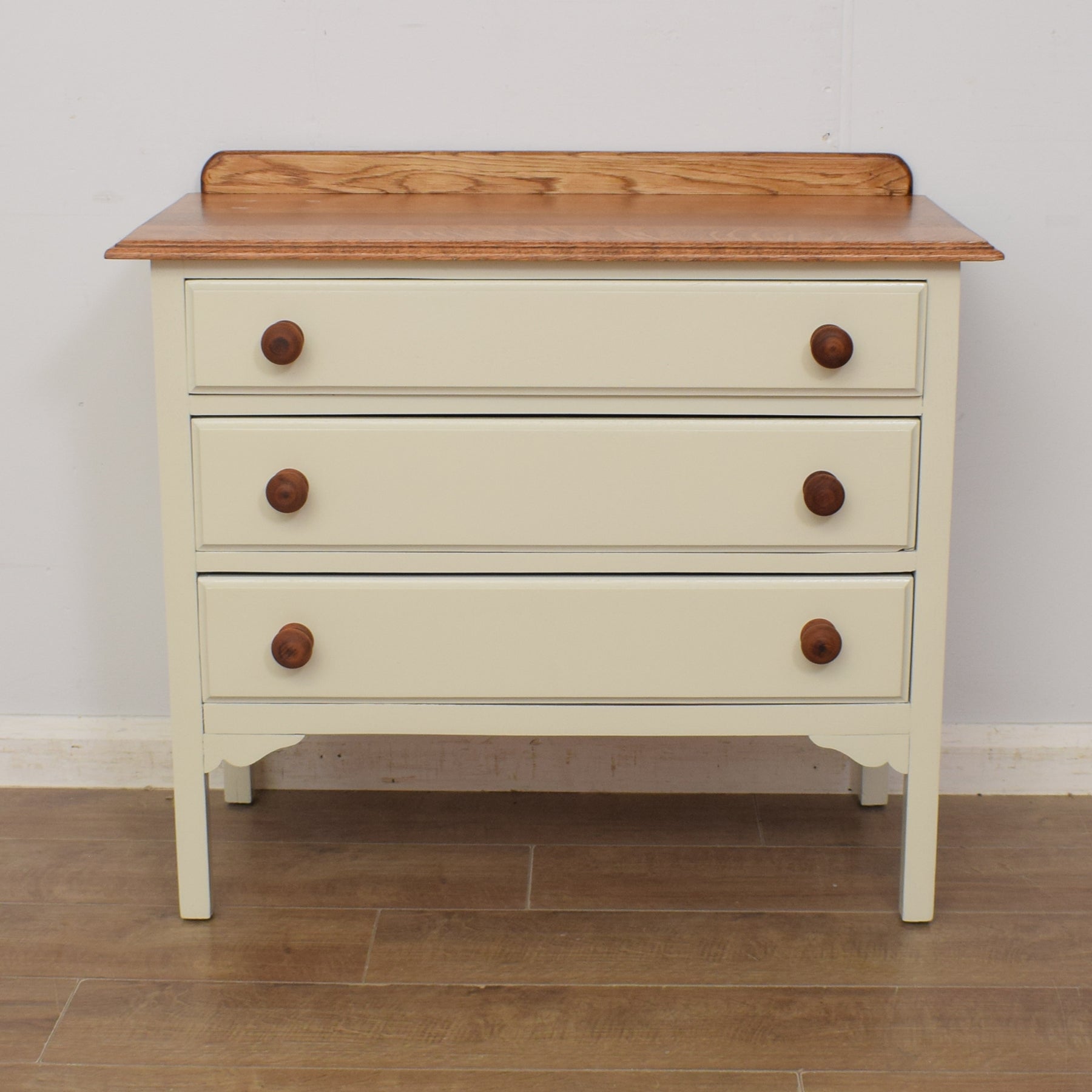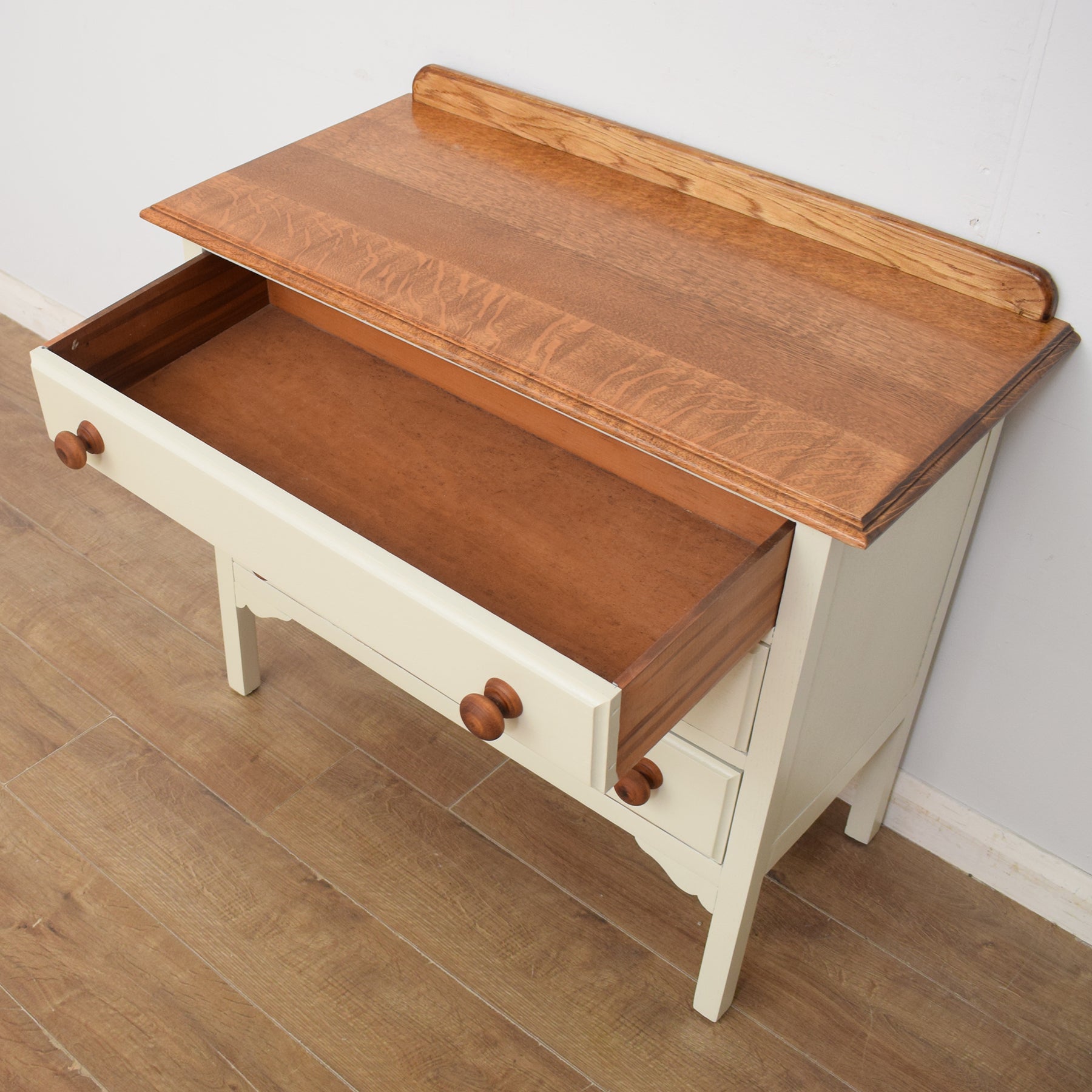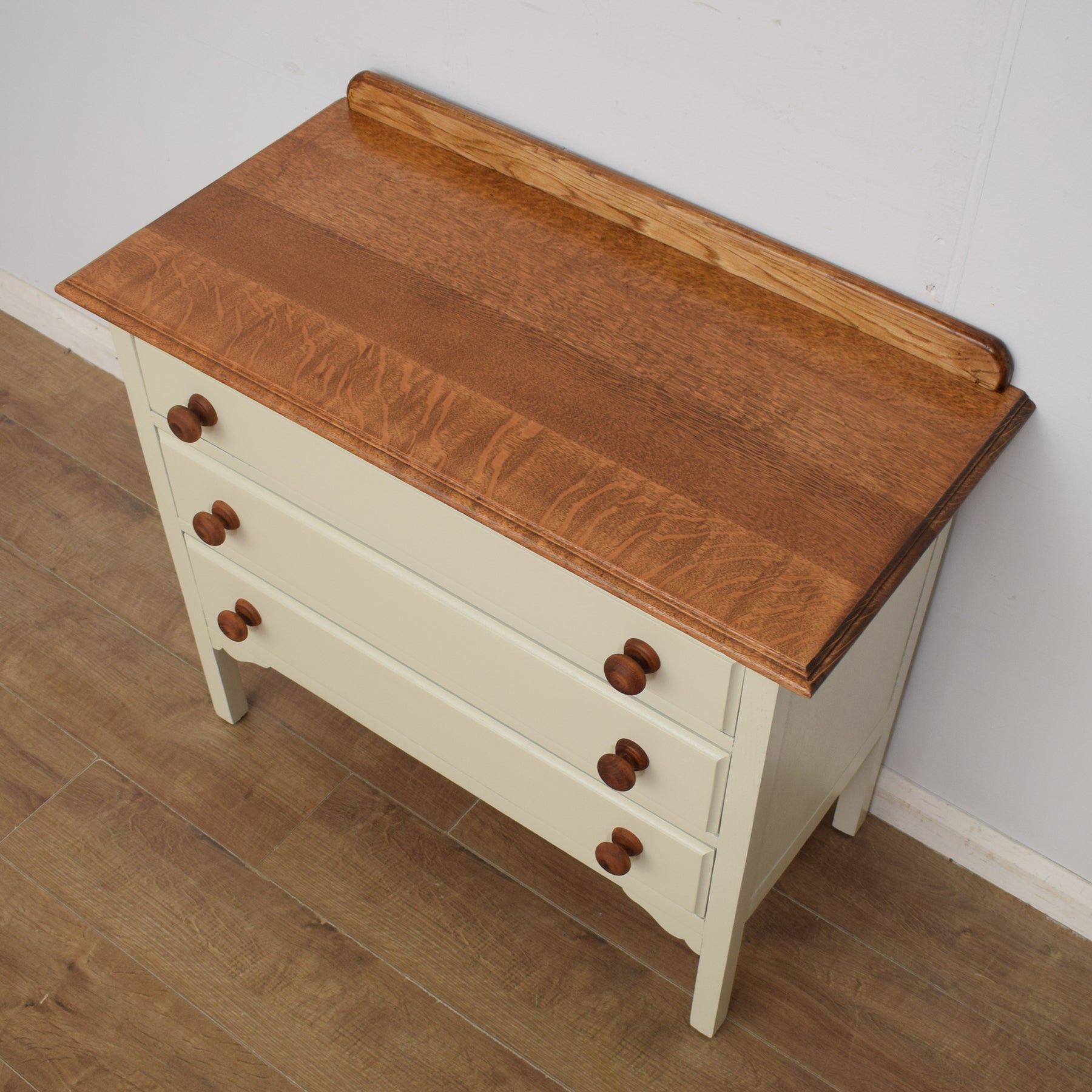 We have restored this lovely piece by stripping away the old finish before applying a clear lacquer to the top to accentuate the beauty of the oak grain and provide protection. The rest has been painted in 'old white', which contrasts well with the natural wooden top and is a neutral colour that will fit with a variety of interiors. This chest of drawers is constructed from a mixture of solid oak and plywood.