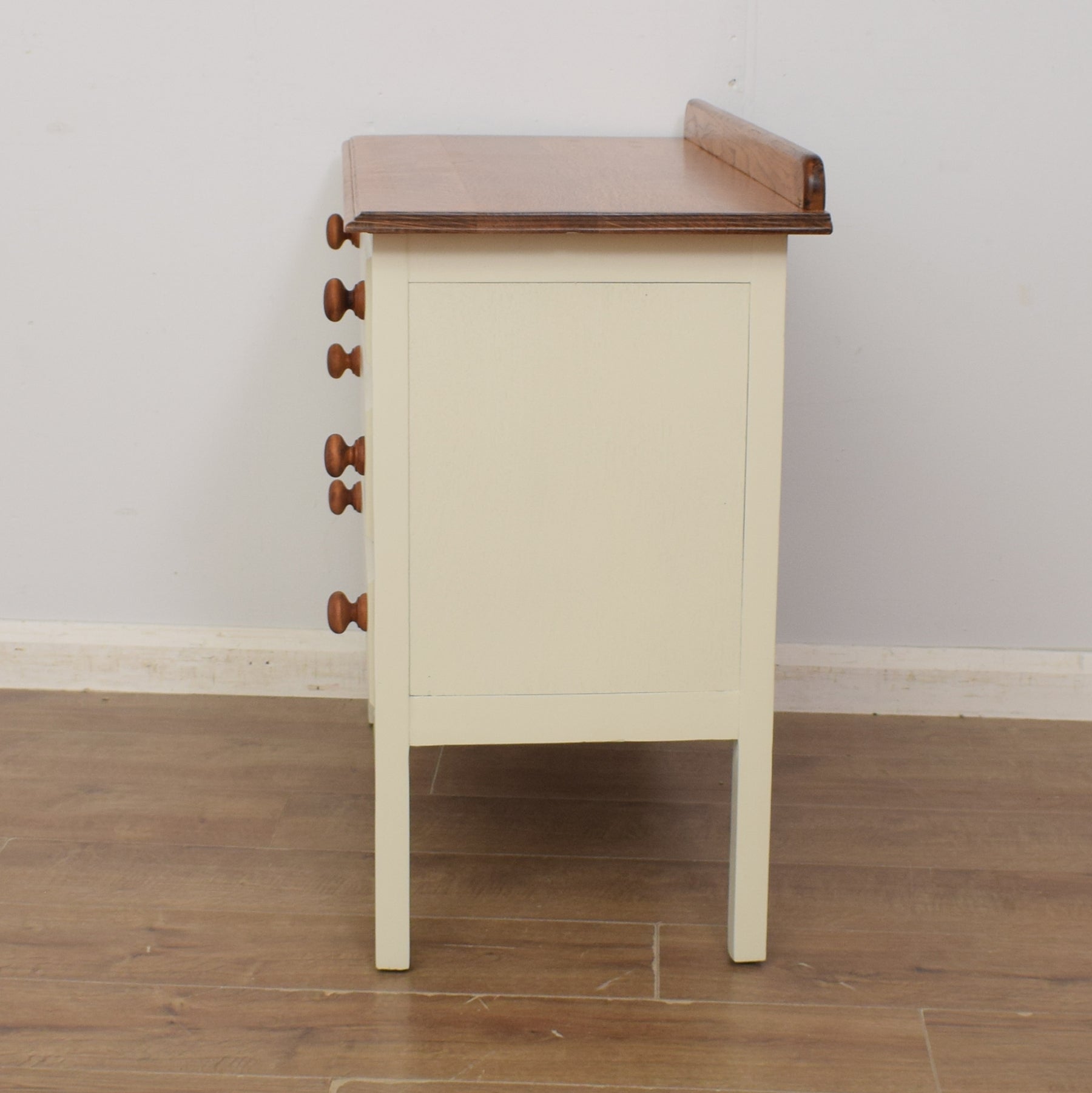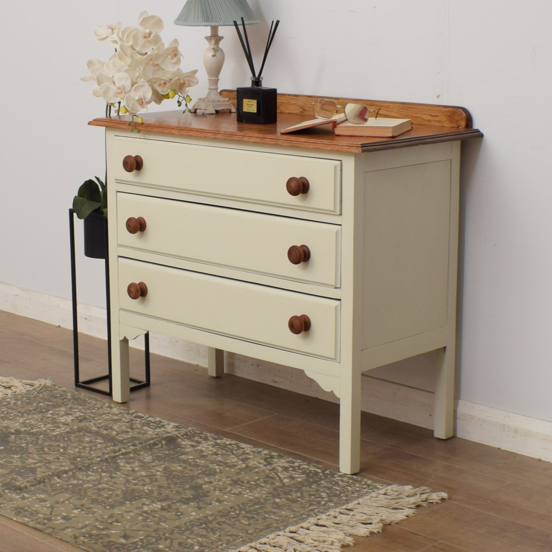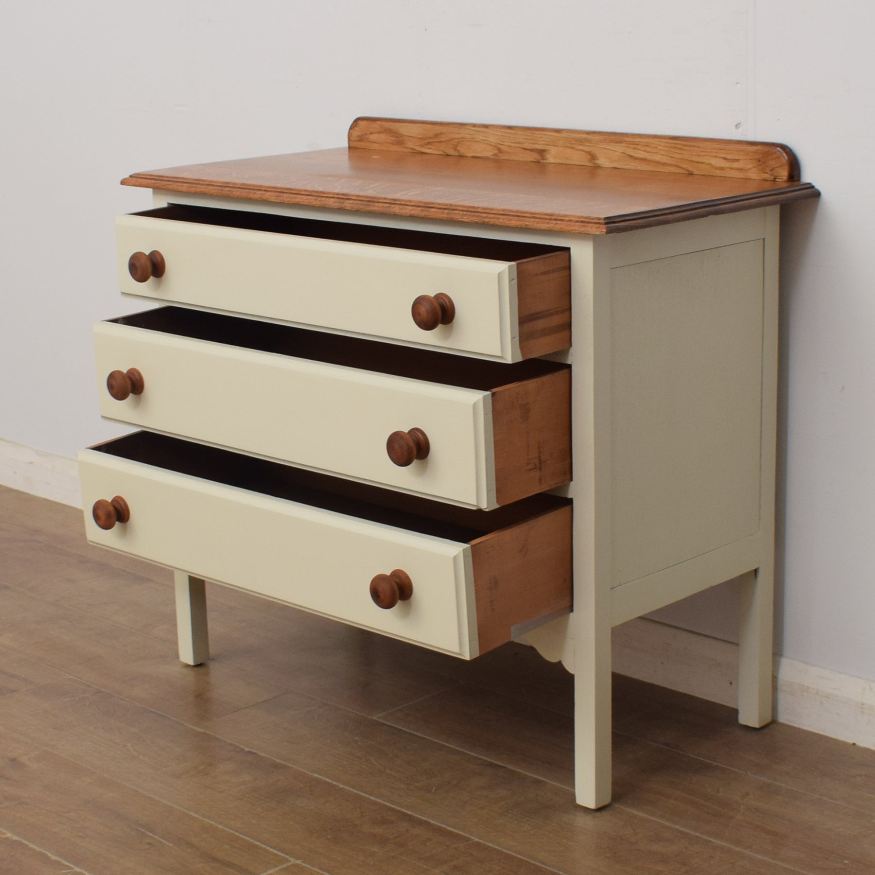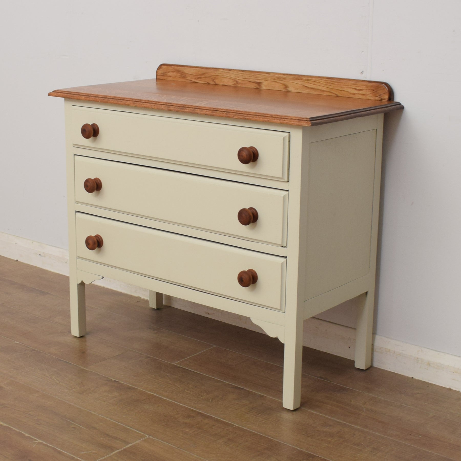 The oak top is the perfect place for displaying favourite family photographs or a vase of freshly picked flowers. There is a good amount of storage for clothes, spare bedding or towels in the three full-width drawers below, which we have fronted with oak-stained, pine handles.