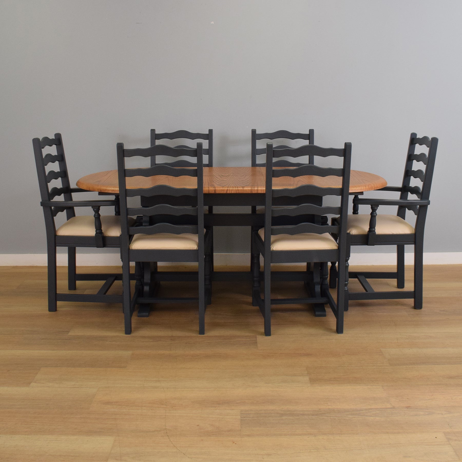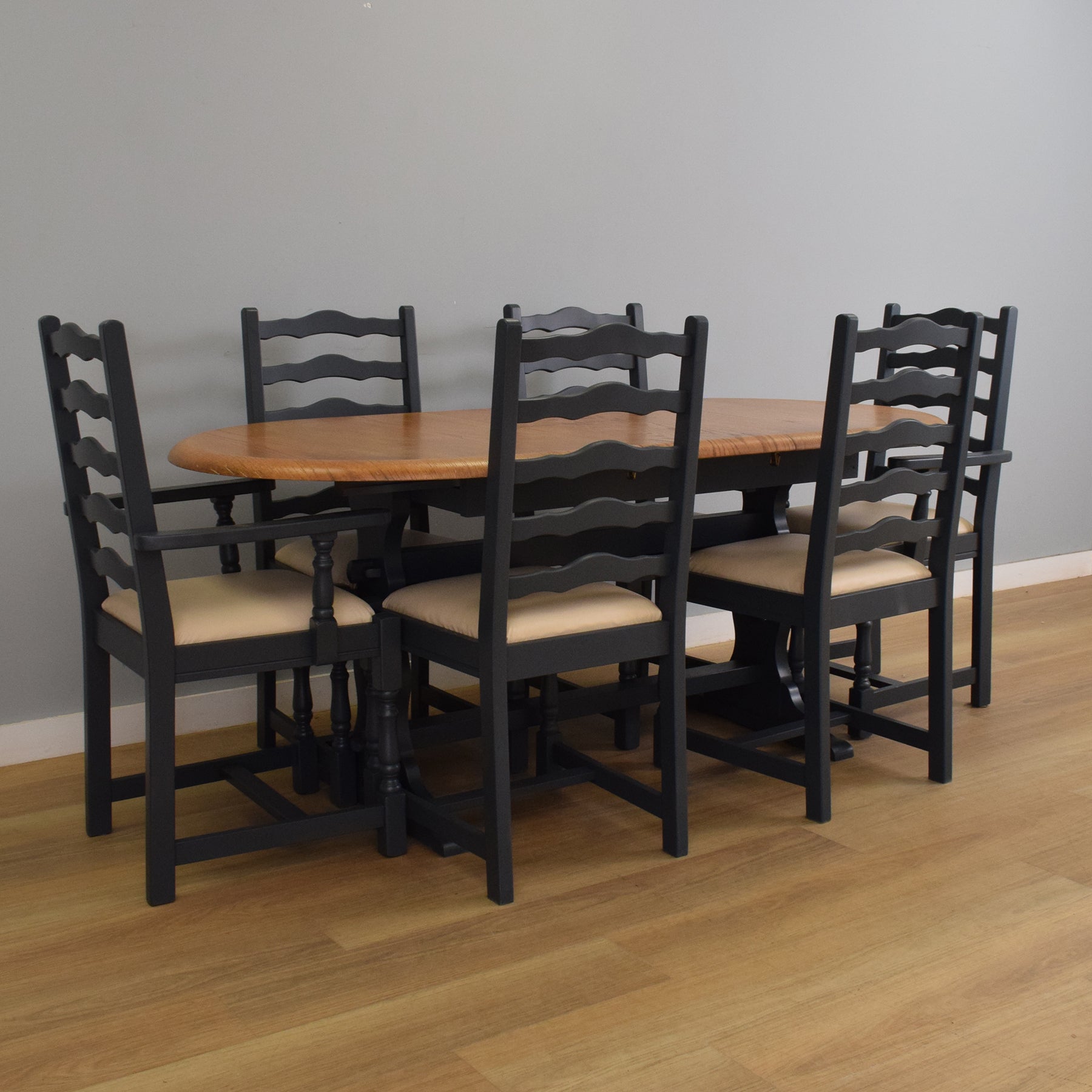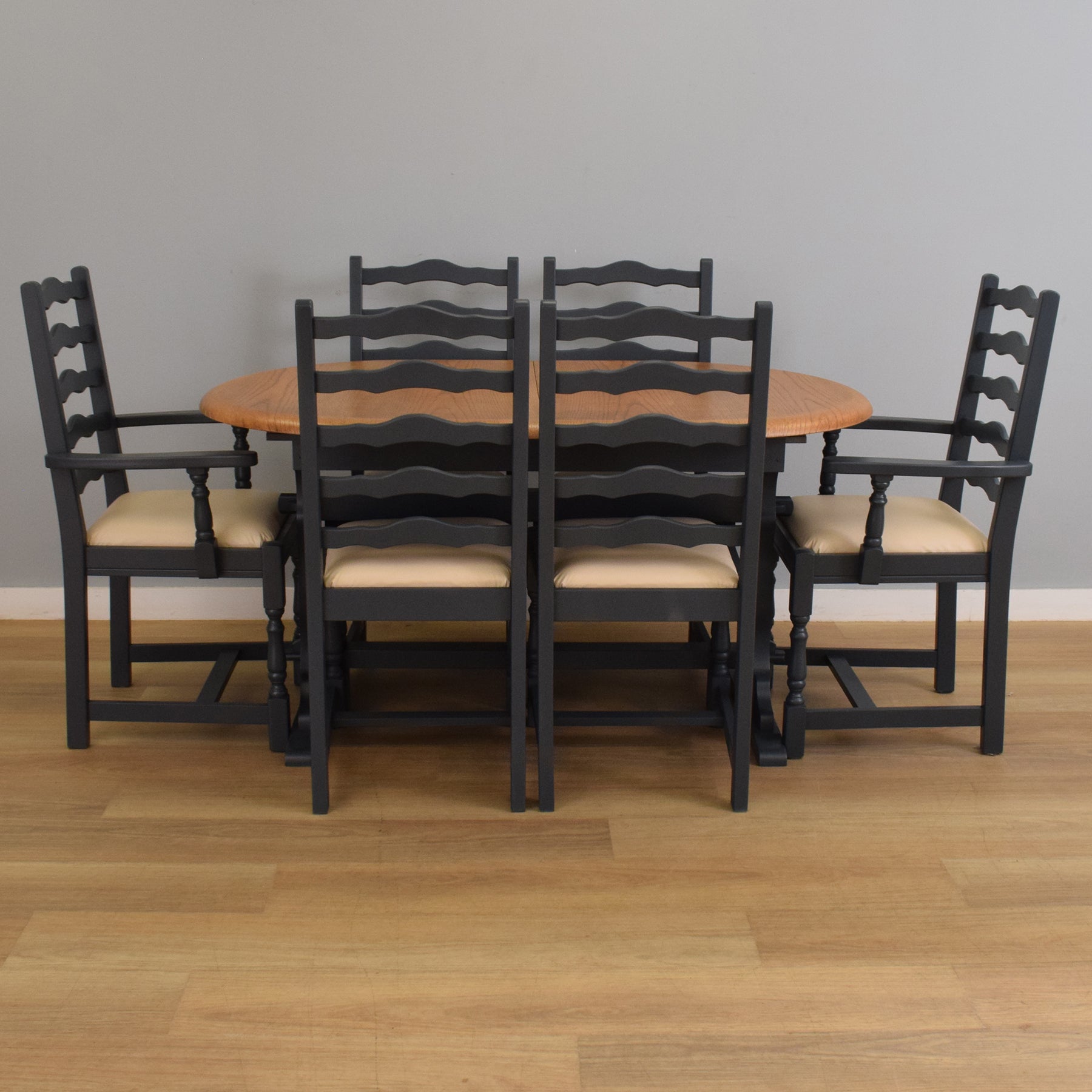 This set includes an oval dining table with a central extension leaf and six matching ladder-back chairs, two of which feature armrests for added comfort. The table’s warm oak top contrasts elegantly with the painted dark-grey base, which features shaped pedestal legs and a robust stretcher for added stability. The chairs mirror this two-tone aesthetic, with painted frames and padded seats upholstered in a cream-coloured leatherette for easy cleaning and a smooth, comfortable feel. The design blends country charm with contemporary tones for a striking, yet understated look.