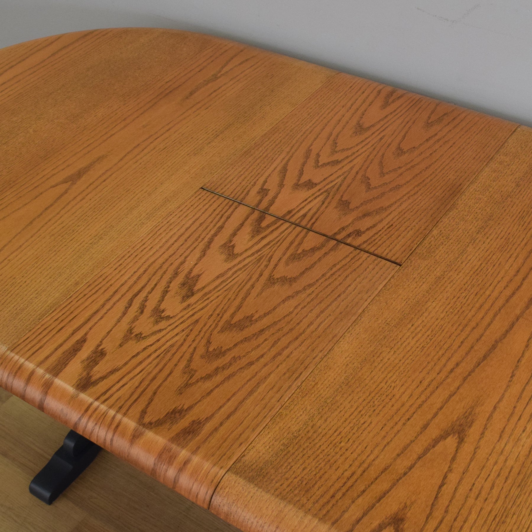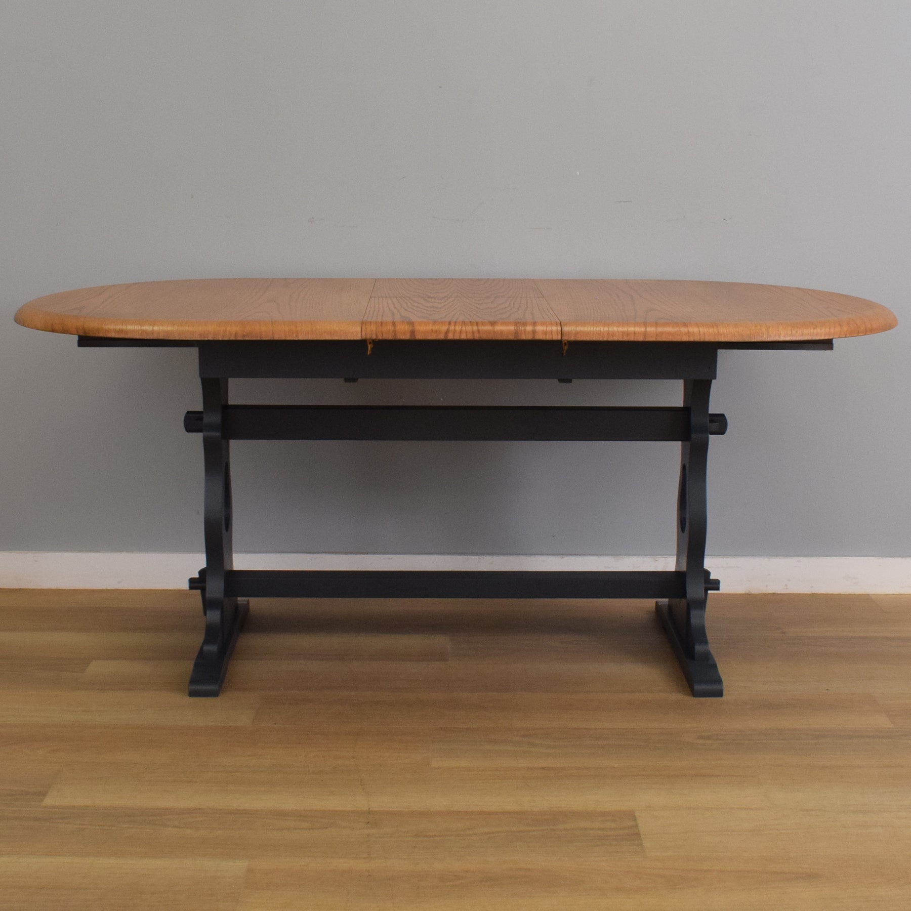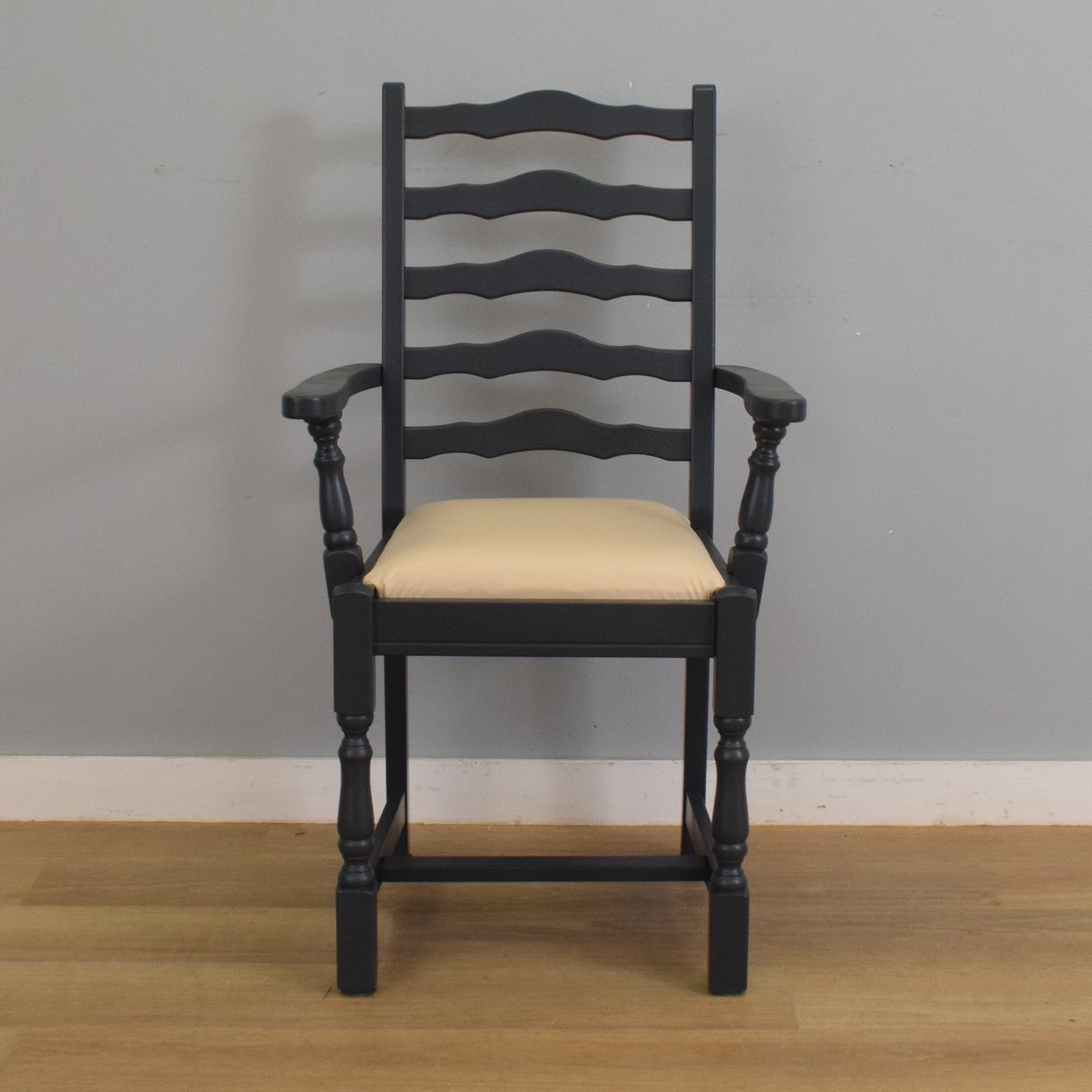 This set includes an oval dining table with a central extension leaf and six matching ladder-back chairs, two of which feature armrests for added comfort. The table’s warm oak top contrasts elegantly with the painted dark-grey base, which features shaped pedestal legs and a robust stretcher for added stability. The chairs mirror this two-tone aesthetic, with painted frames and padded seats upholstered in a cream-coloured leatherette for easy cleaning and a smooth, comfortable feel. The design blends country charm with contemporary tones for a striking, yet understated look.