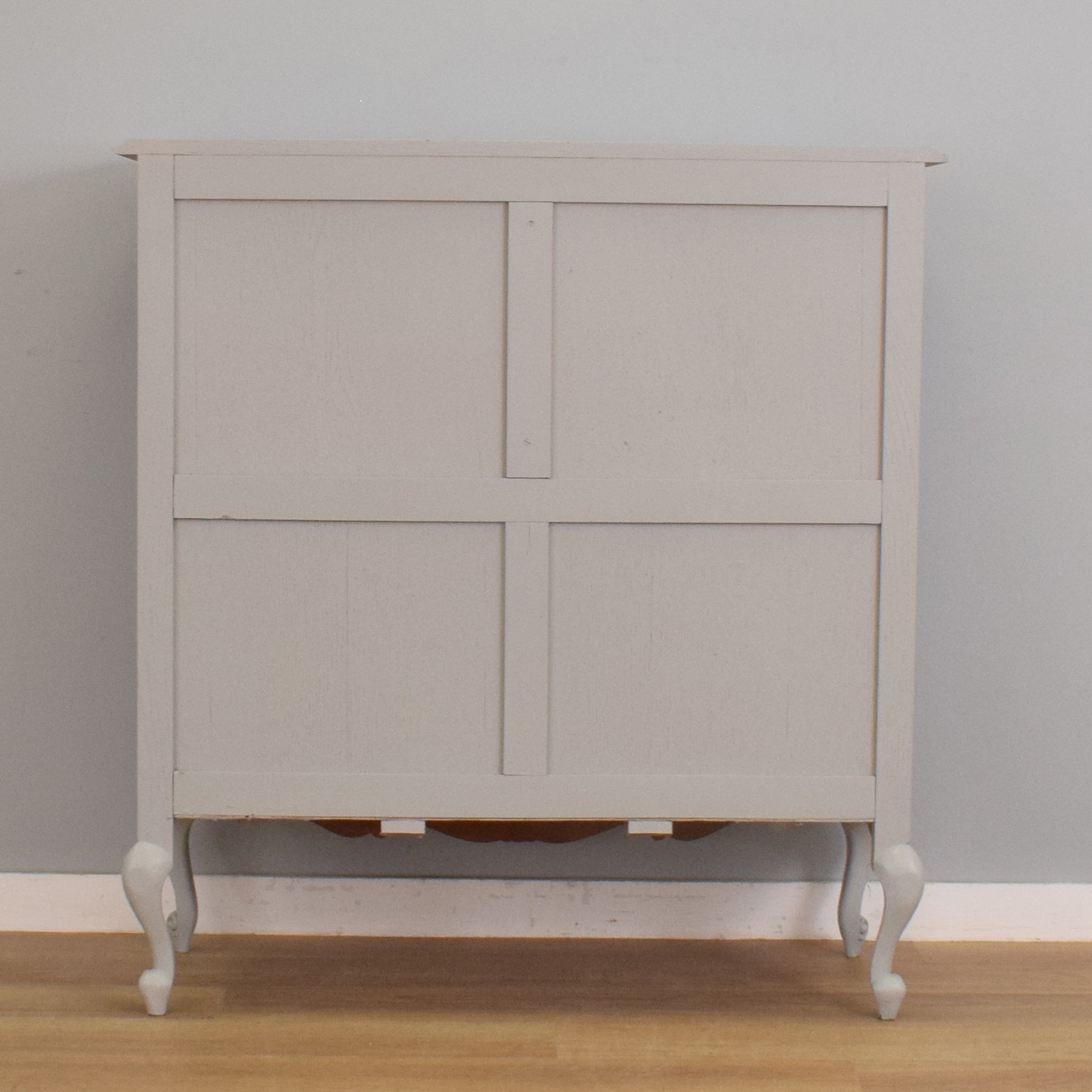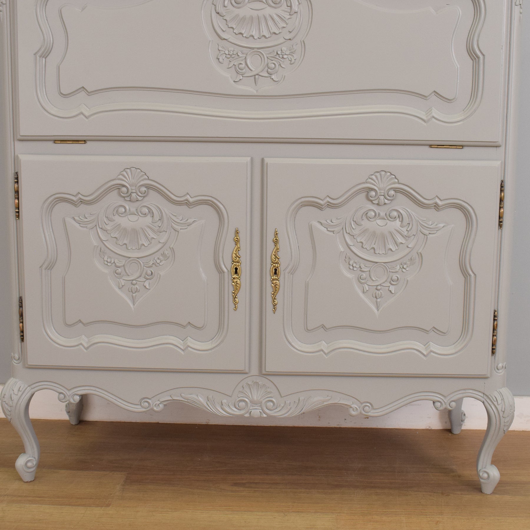 The item has been hand-sanded, cleaned, and multiple spray coats of a soft grey paint have been applied, creating a smooth and elegant finish that highlights the ornate carving while giving the piece a fresh, updated feel. This cabinet is constructed from a combination of solid oak and oak veneer, with a plywood panelled back.