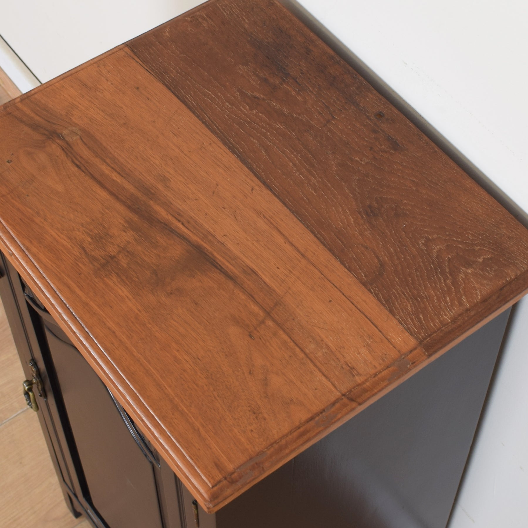 Our restoration workshop has carefully stripped this bedside before applying a matte lacquer finish to the surface, which enhances the colour and grain of the mahogany while providing protection. The remaining parts have been painted black, creating a striking contrast with the natural wood.