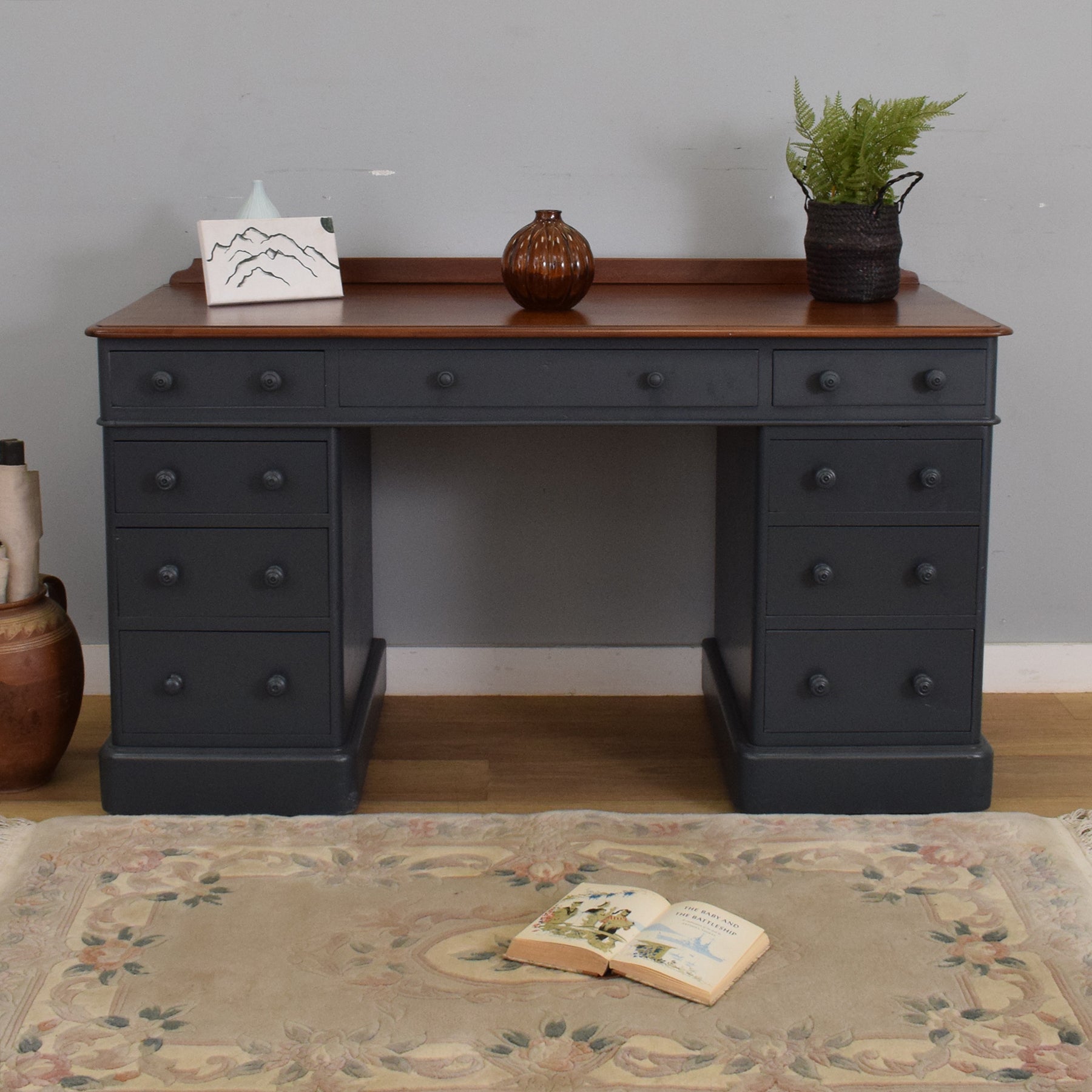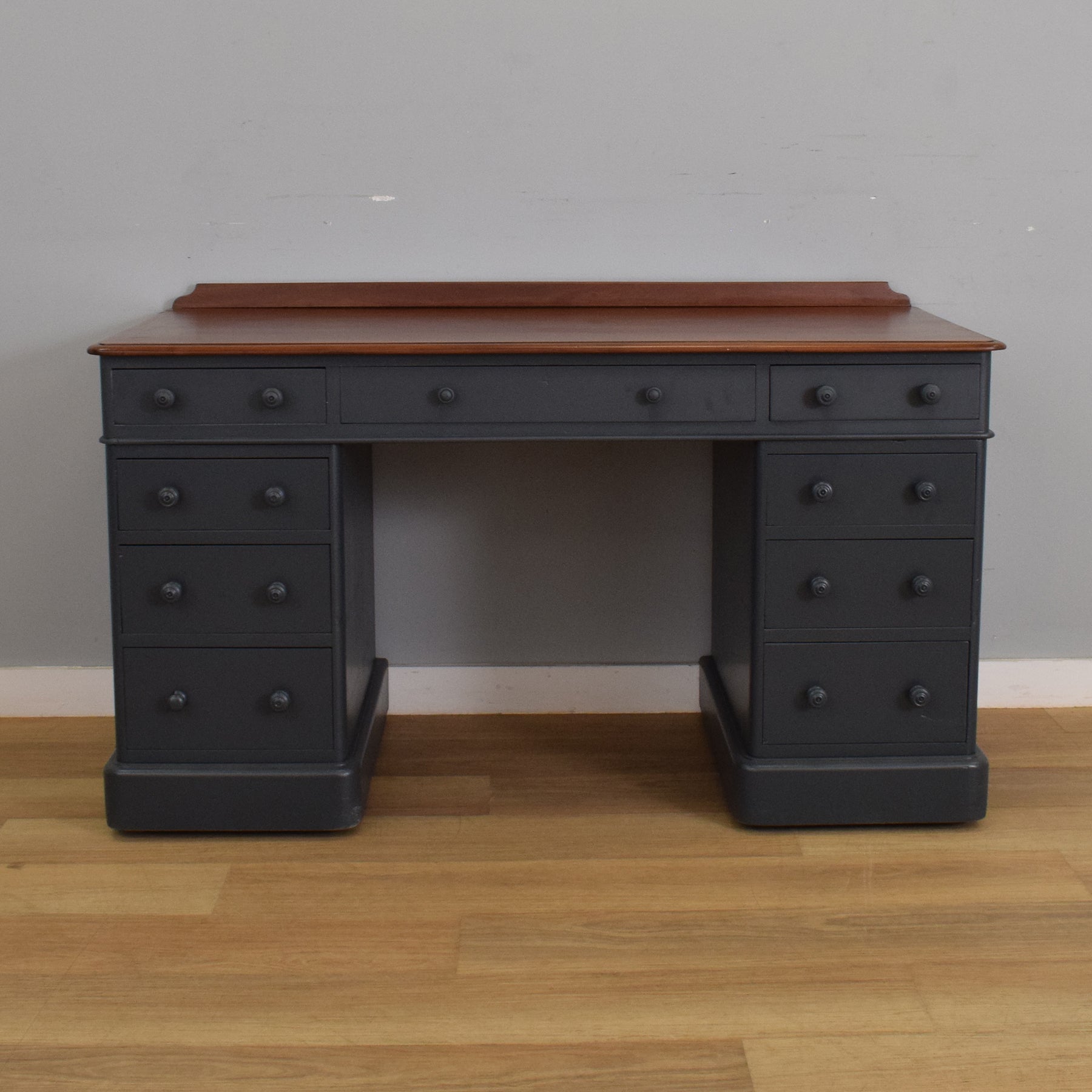 This is a solid mahogany twin pedestal desk featuring a total of nine drawers, including a wide central drawer and four on either side. The design is both practical and balanced, with original turned handles and rounded corners that soften the overall appearance. The plinth bases lend the piece a grounded, substantial presence, while the deep grey finish on the base contrasts elegantly with the rich tones of the natural mahogany top.