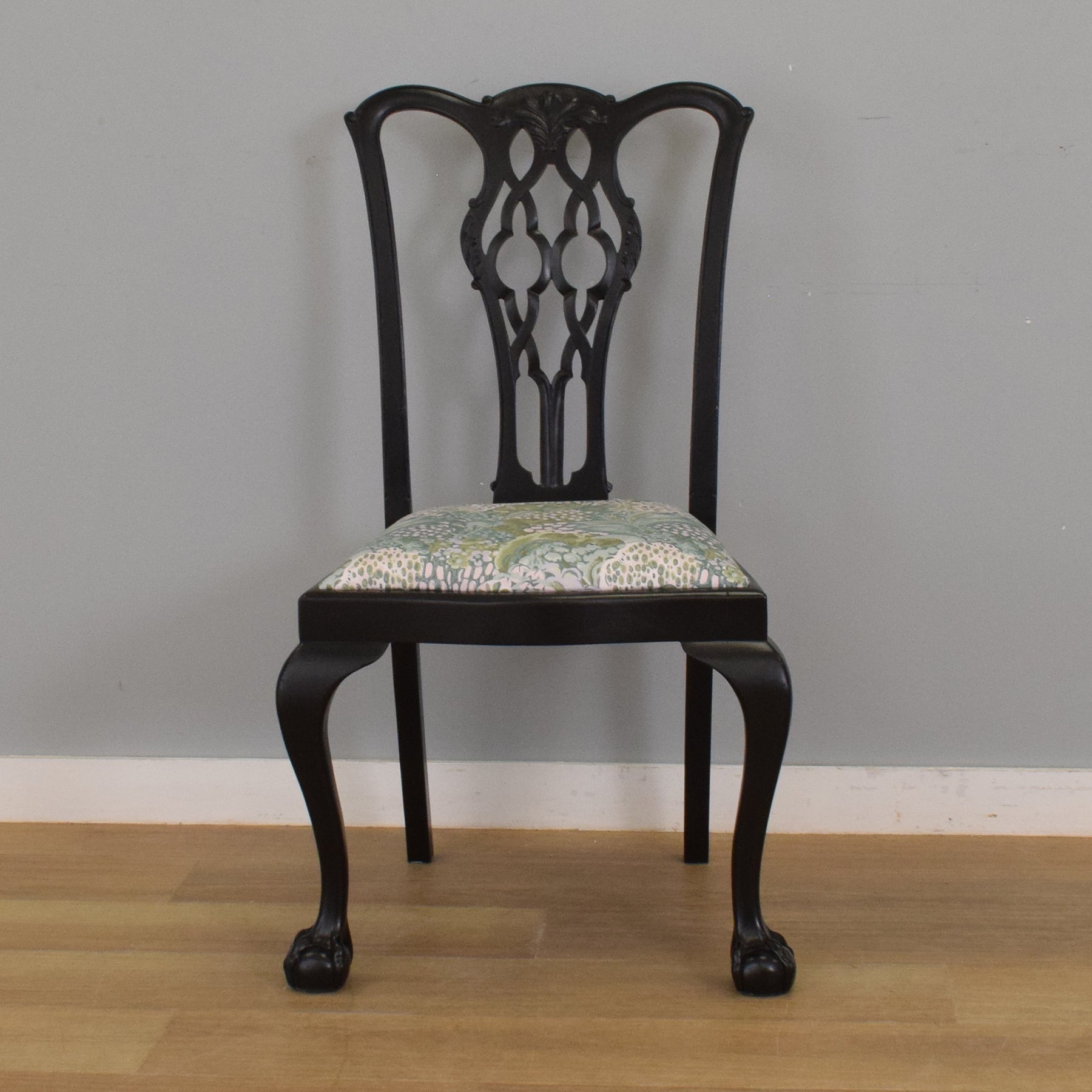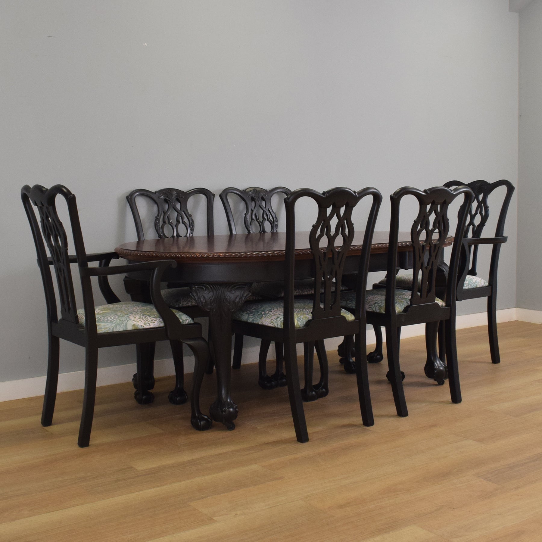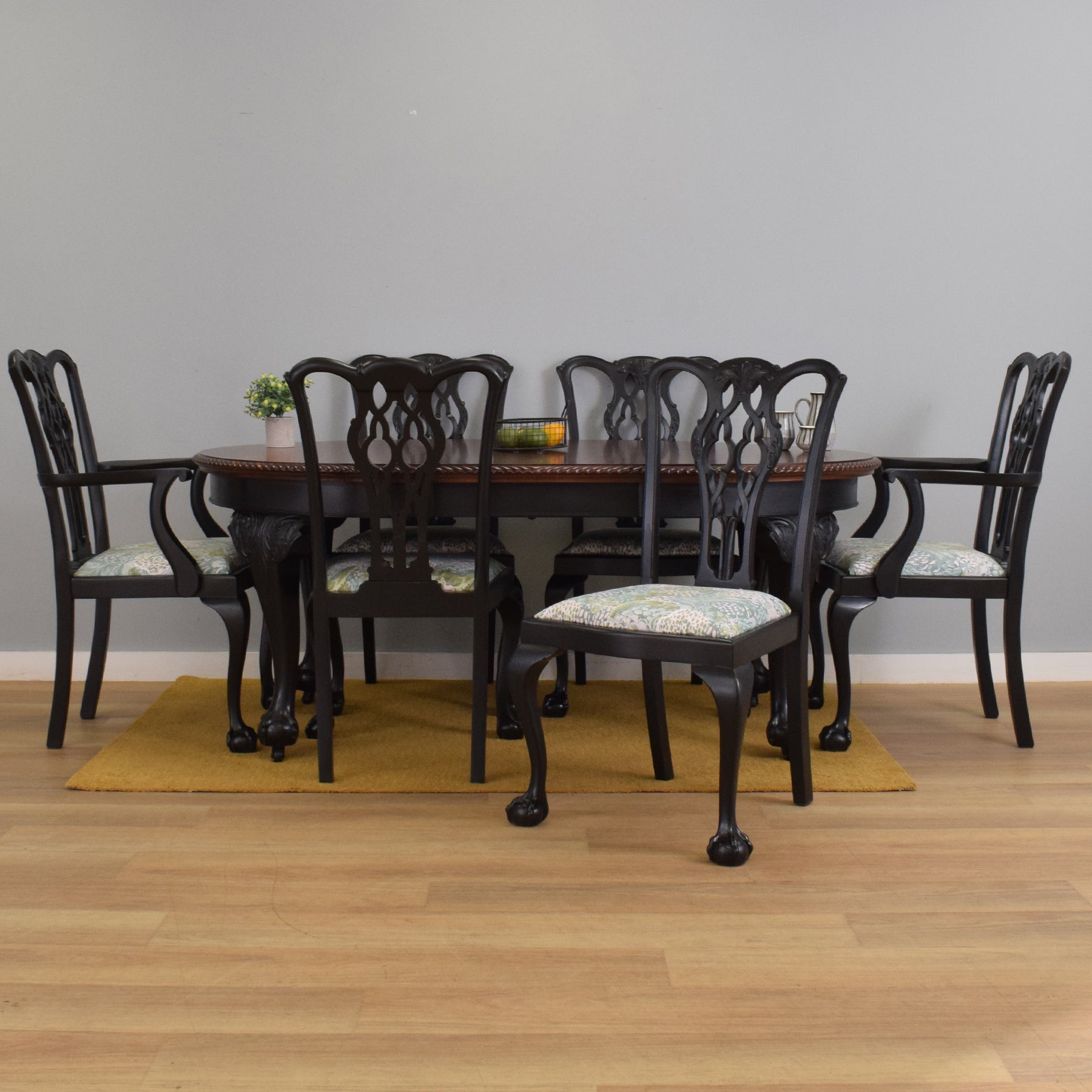 This painted dining set includes a solid mahogany table and six matching chairs, two of which are carvers. The table features a beautifully carved edge and finely detailed cabriole legs with claw-and-ball feet, echoing the carved motifs on the chair backs. The chairs have been reupholstered in a soft patterned fabric, lending a gentle touch of colour and comfort. Originally a crank-extension table, the leaves have now been fastened together, converting it into a fixed-top table that remains sturdy and practical for everyday use.