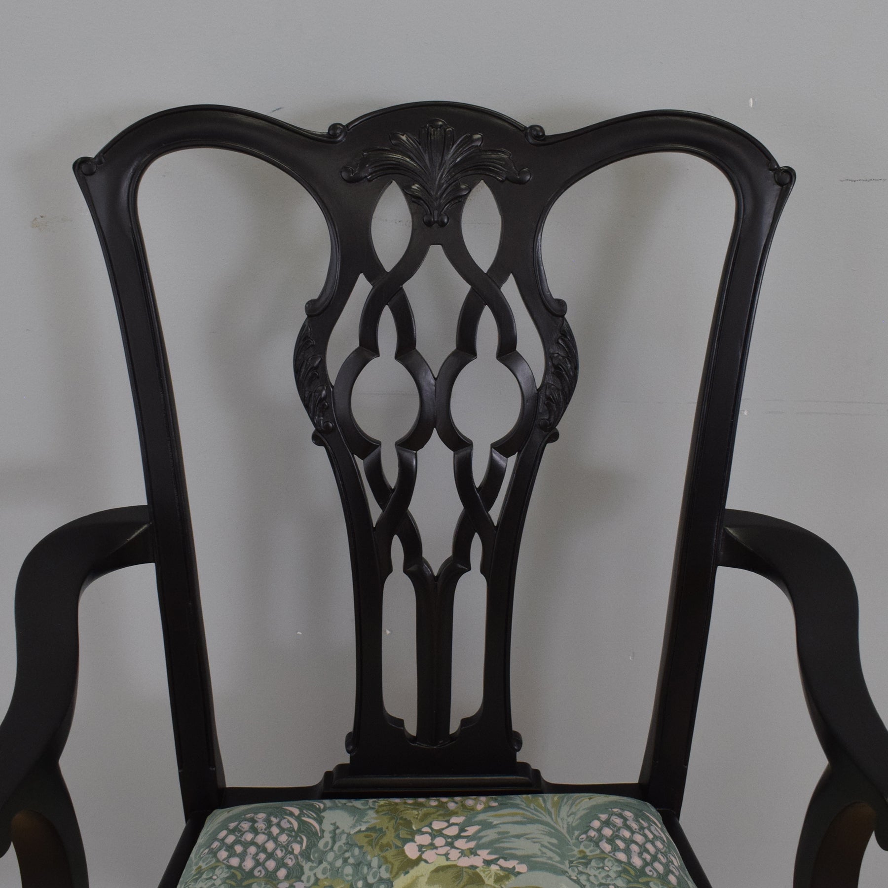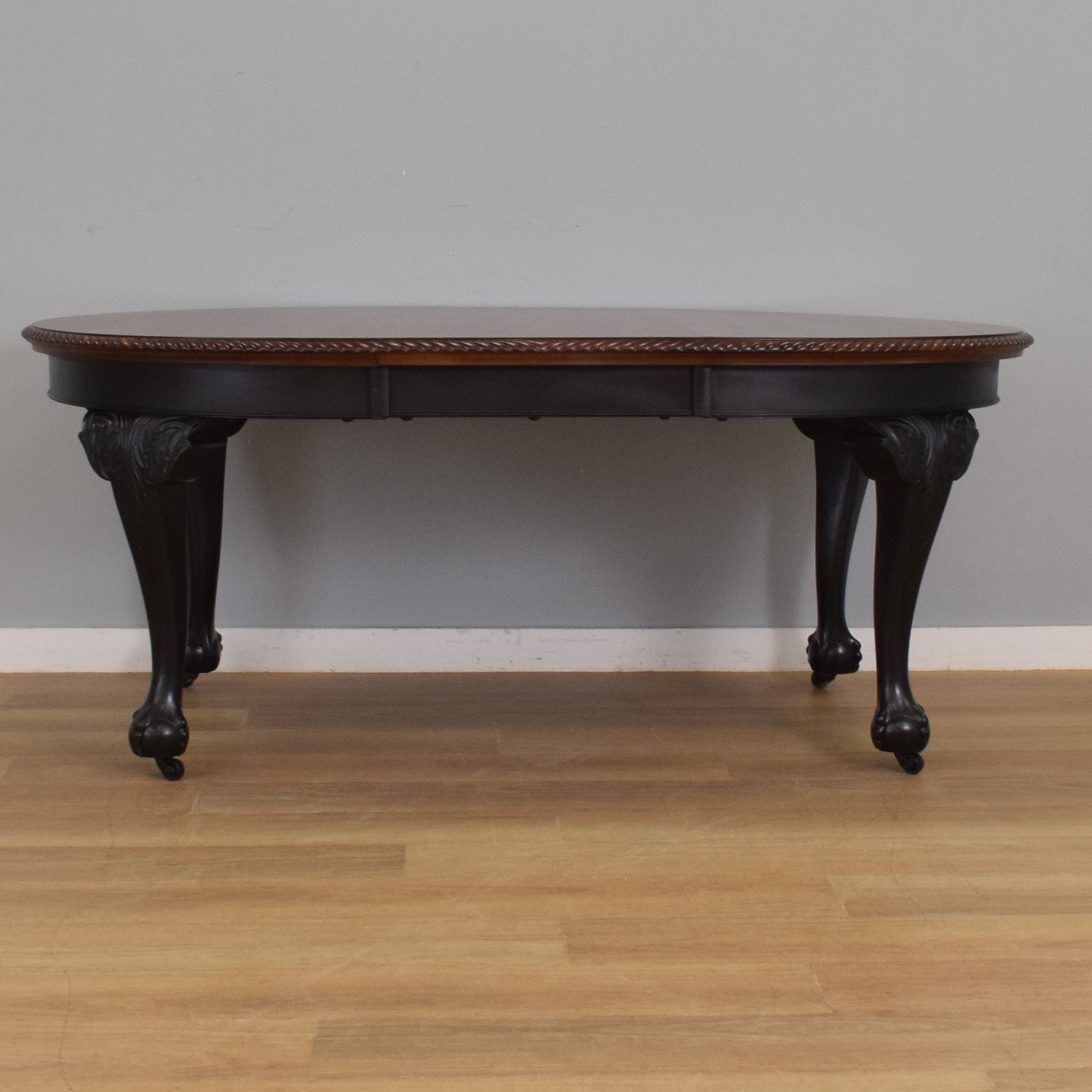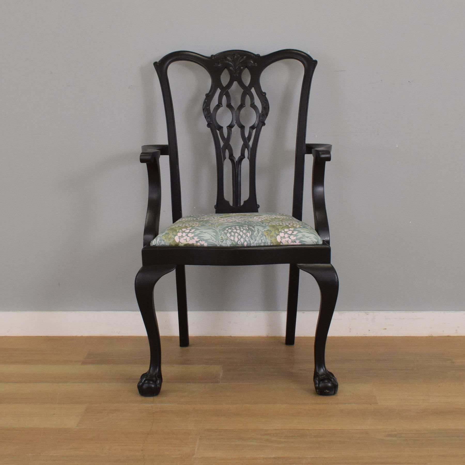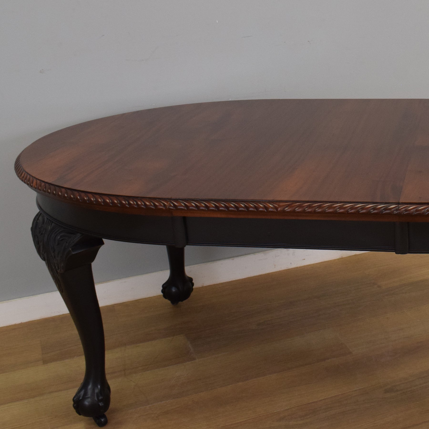 This painted dining set includes a solid mahogany table and six matching chairs, two of which are carvers. The table features a beautifully carved edge and finely detailed cabriole legs with claw-and-ball feet, echoing the carved motifs on the chair backs. The chairs have been reupholstered in a soft patterned fabric, lending a gentle touch of colour and comfort. Originally a crank-extension table, the leaves have now been fastened together, converting it into a fixed-top table that remains sturdy and practical for everyday use.
