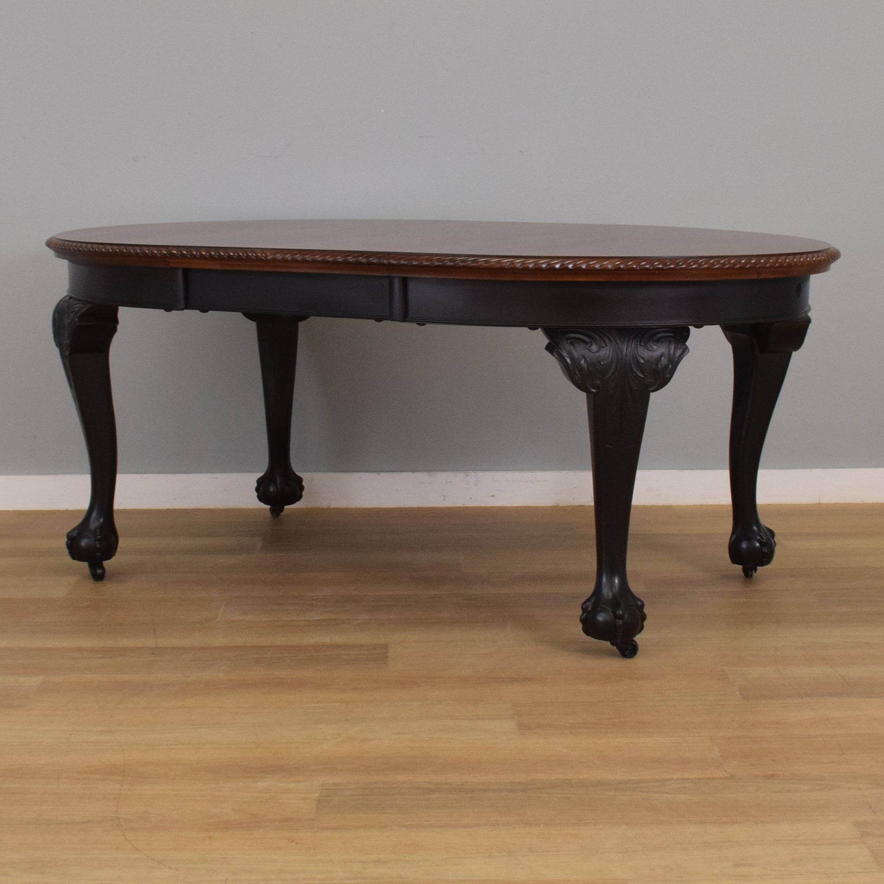 The entire set has been hand-prepared, with the base and chairs painted in a deep satin black for a striking yet refined look. The mahogany top has been stripped and refinished to highlight its natural grain, offering a warm contrast to the darker base. This item is made entirely from solid mahogany, ensuring long-lasting strength and durability.