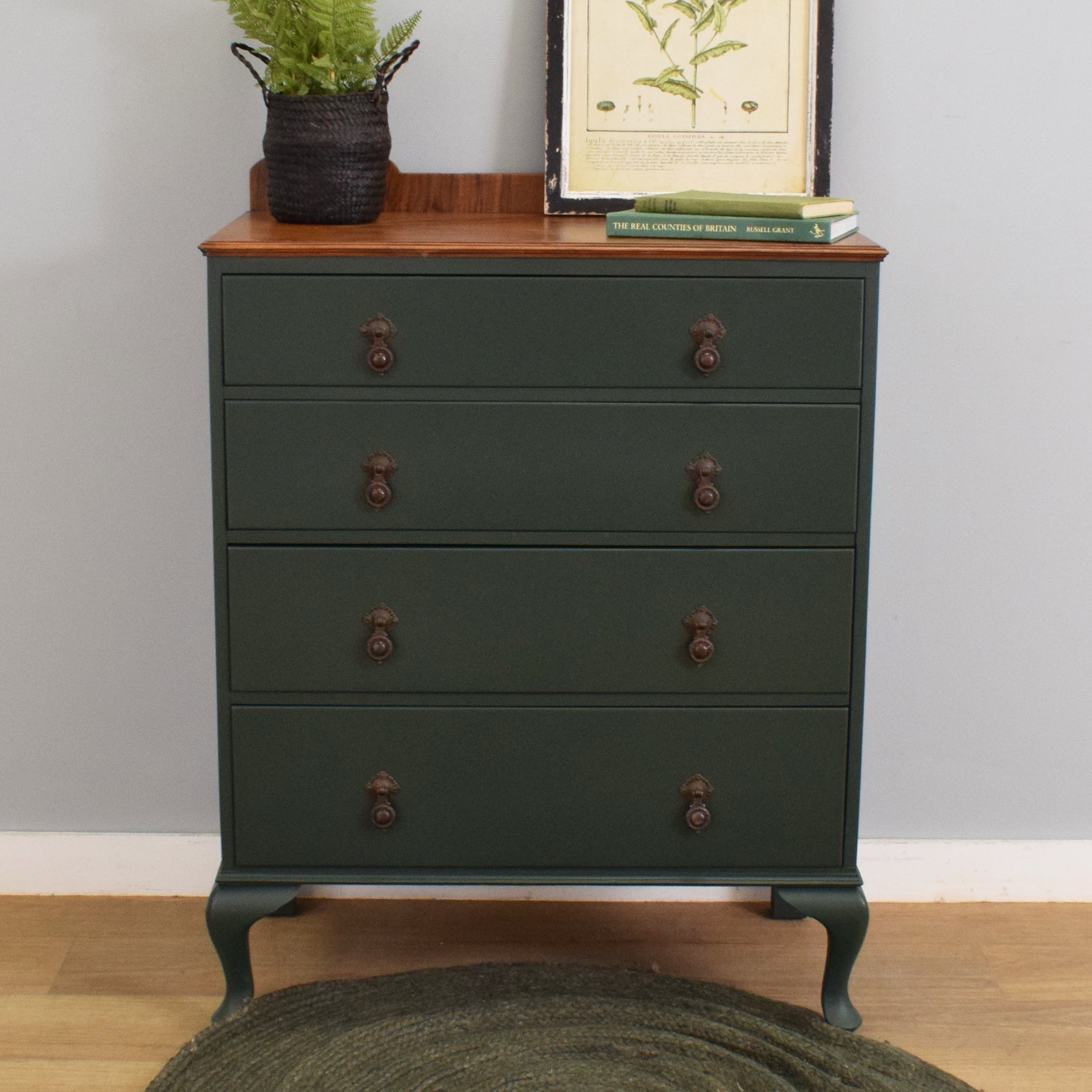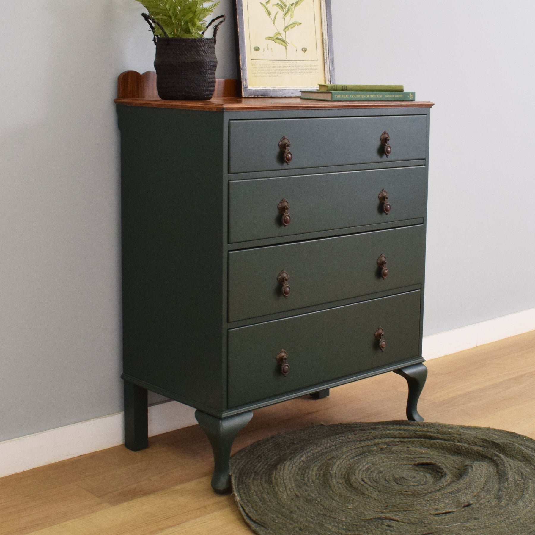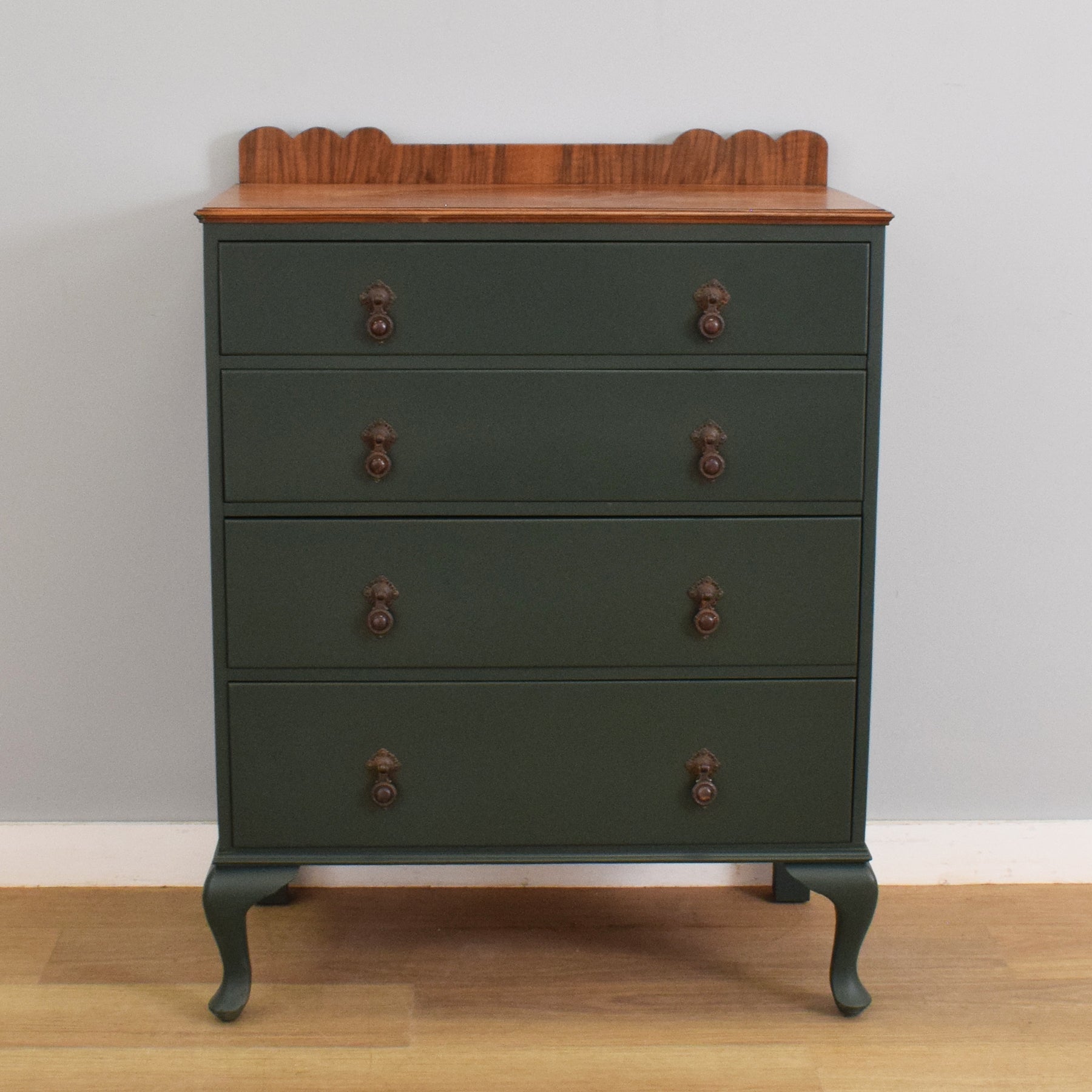 This four-drawer chest features a simple, elegant shape with gently curving cabriole legs and a shaped gallery back. The drawer fronts have been painted in a deep green tone, which contrasts attractively with the warm mahogany-veneered top, showcasing its rich natural grain. Each drawer is fitted with ornate drop handles, adding a touch of period character while remaining functional. With four spacious drawers, the chest provides plenty of room for clothing, linens, or household essentials.