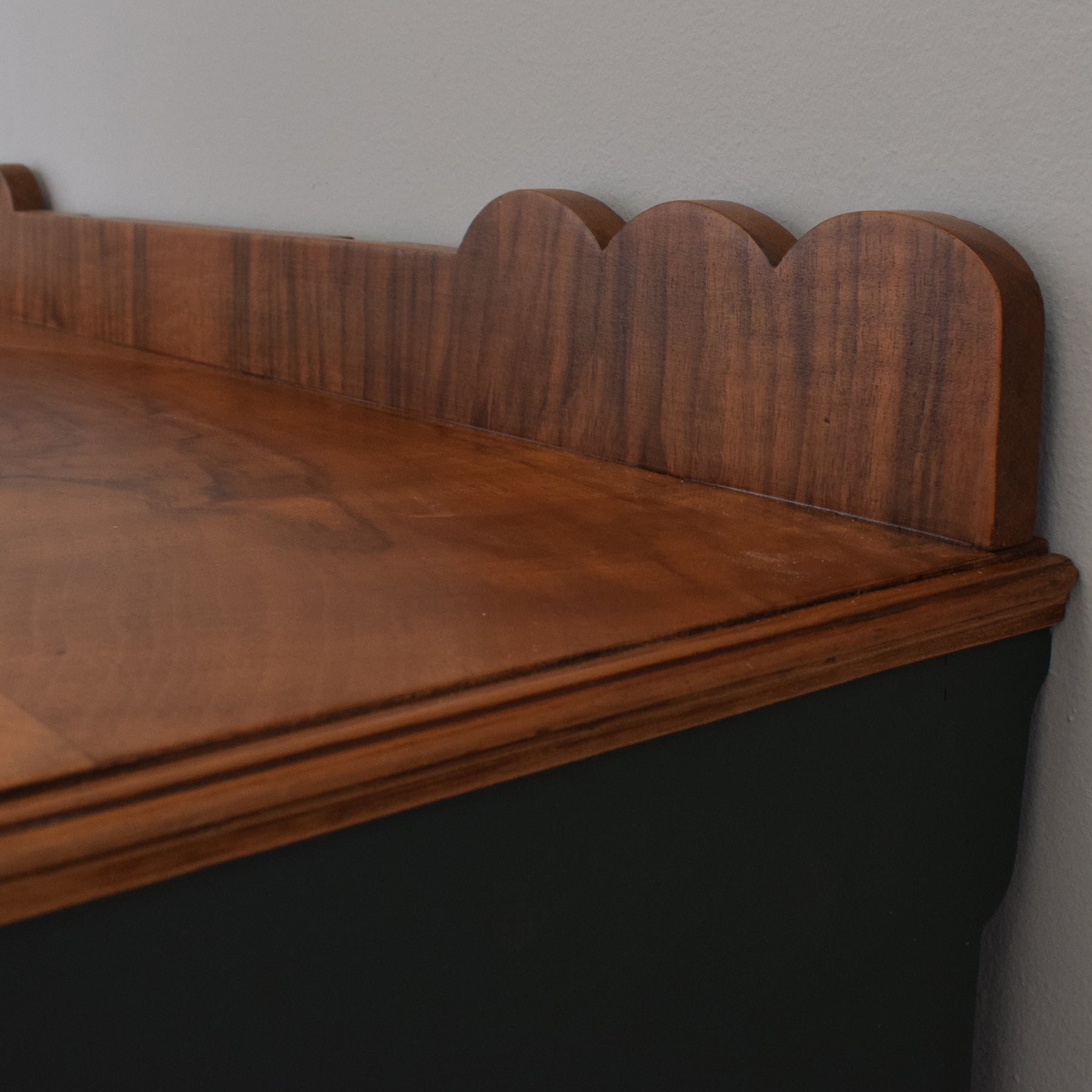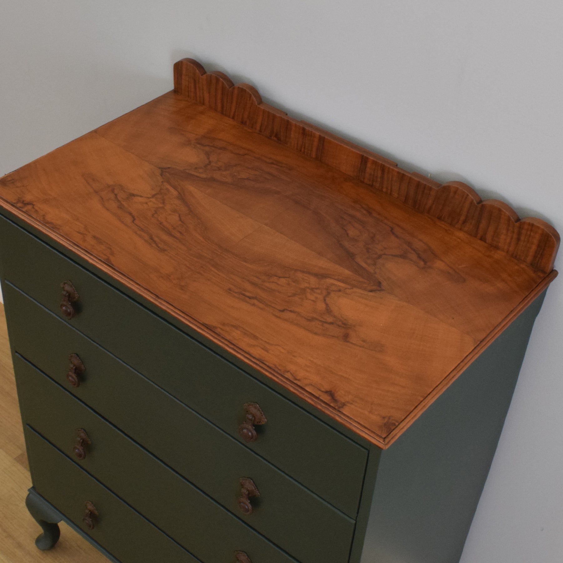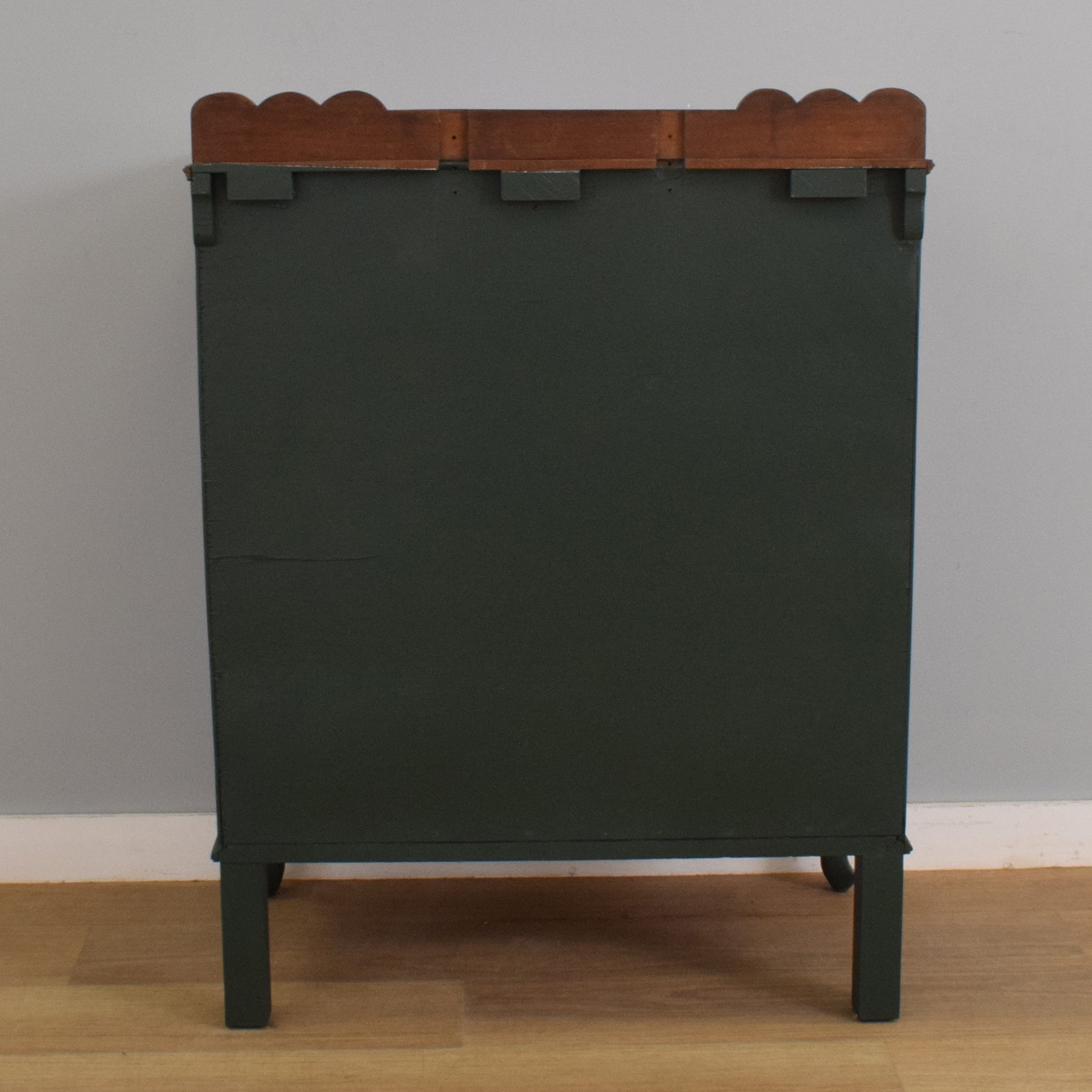 This four-drawer chest features a simple, elegant shape with gently curving cabriole legs and a shaped gallery back. The drawer fronts have been painted in a deep green tone, which contrasts attractively with the warm mahogany-veneered top, showcasing its rich natural grain. Each drawer is fitted with ornate drop handles, adding a touch of period character while remaining functional. With four spacious drawers, the chest provides plenty of room for clothing, linens, or household essentials.