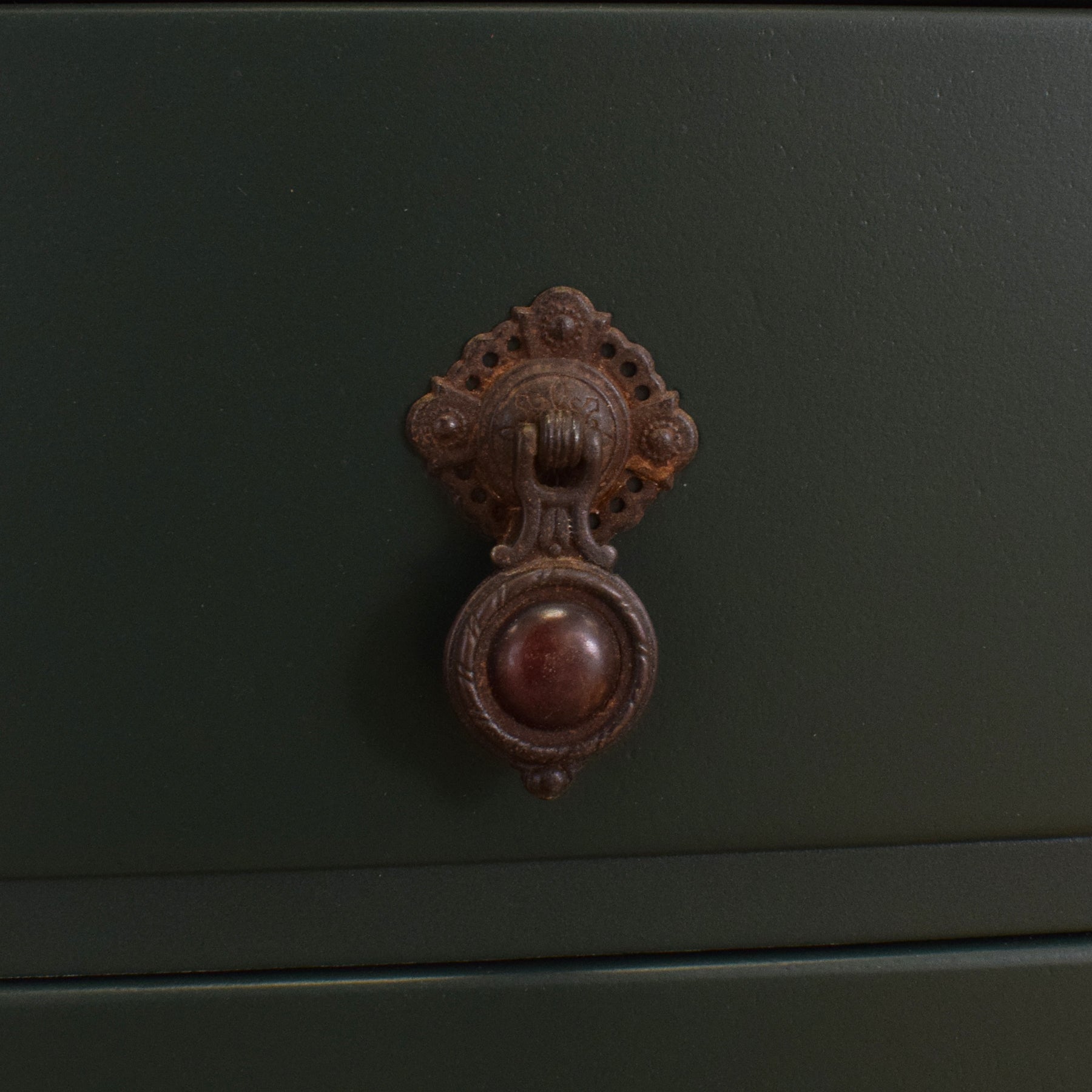 The piece has been carefully hand-prepared, with the surfaces sanded, cleaned, and repainted in a smooth green finish. The top has been stripped and treated with lacquer, bringing out the depth of the mahogany veneer and offering a durable surface. This chest is constructed from mahogany veneer, with plywood used for the back and drawer bases.
