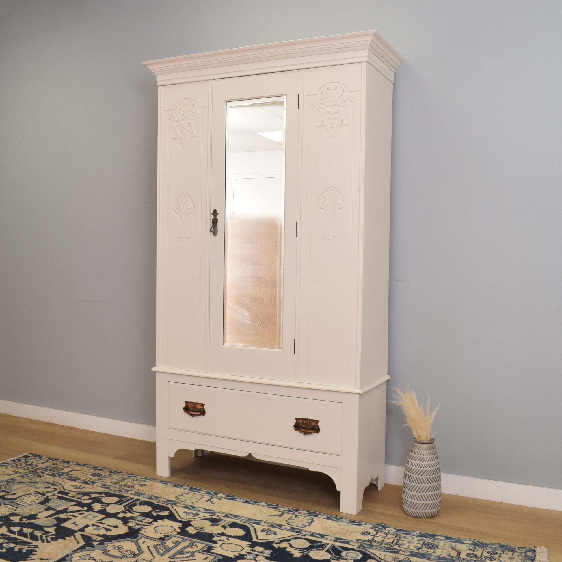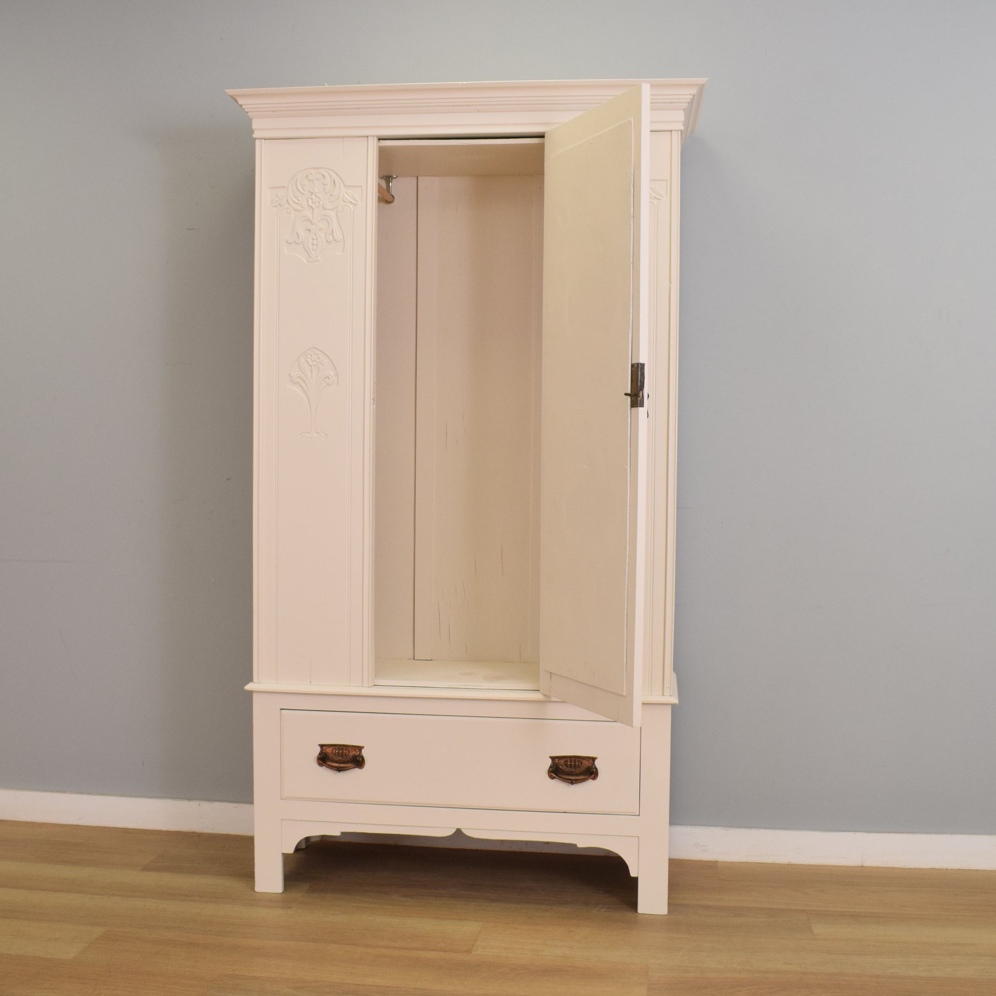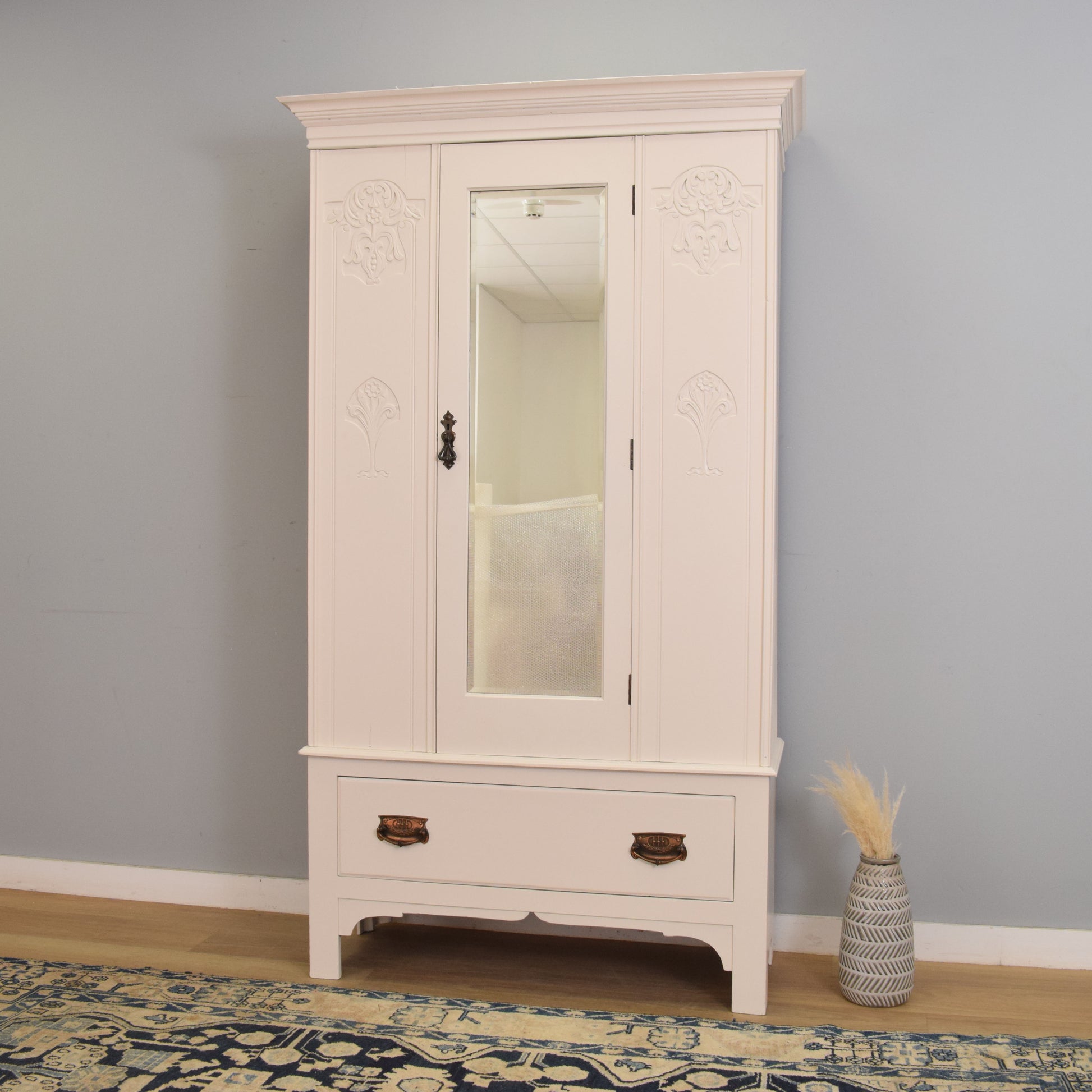 The tall single-door design features a full-length bevel-edged mirror to the centre, flanked by carved floral and Art Nouveau-style motifs on either side. The door opens to reveal a hanging rail on either side, making it ideal for coats or longer garments, and below sits a generous full-width drawer with beautifully aged copper-tone handles, offering additional concealed storage.