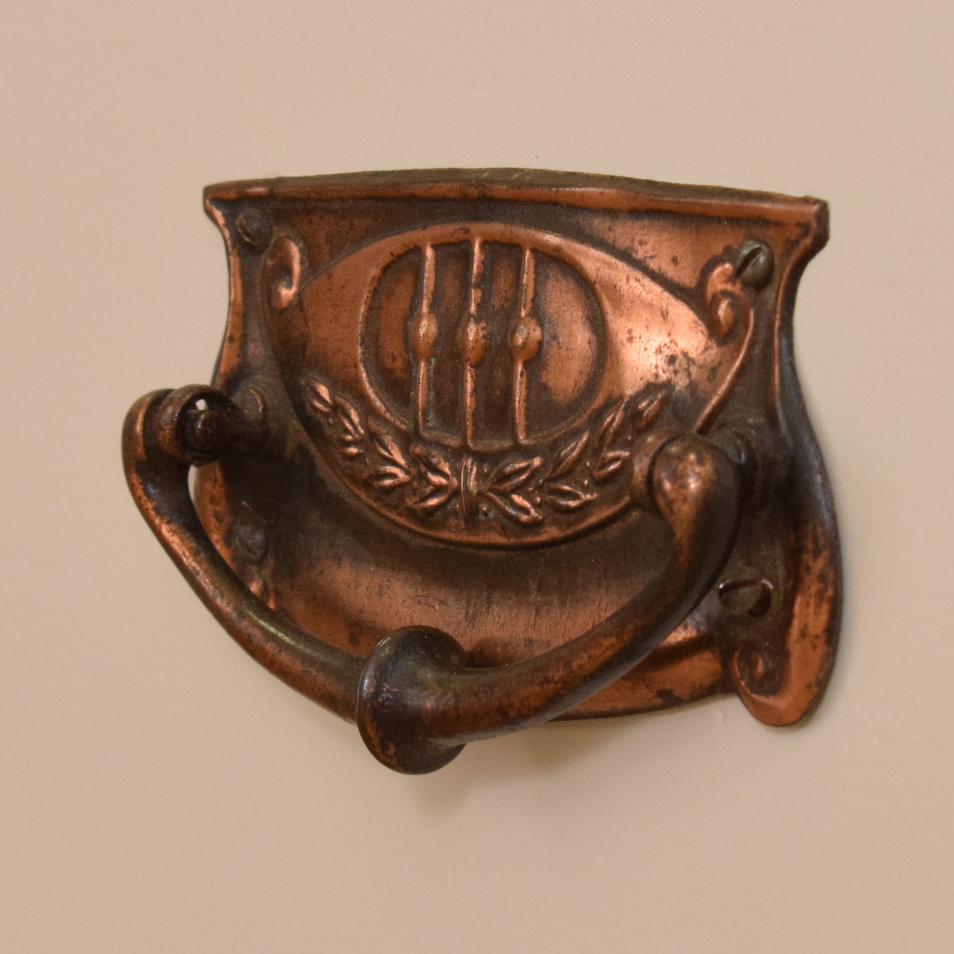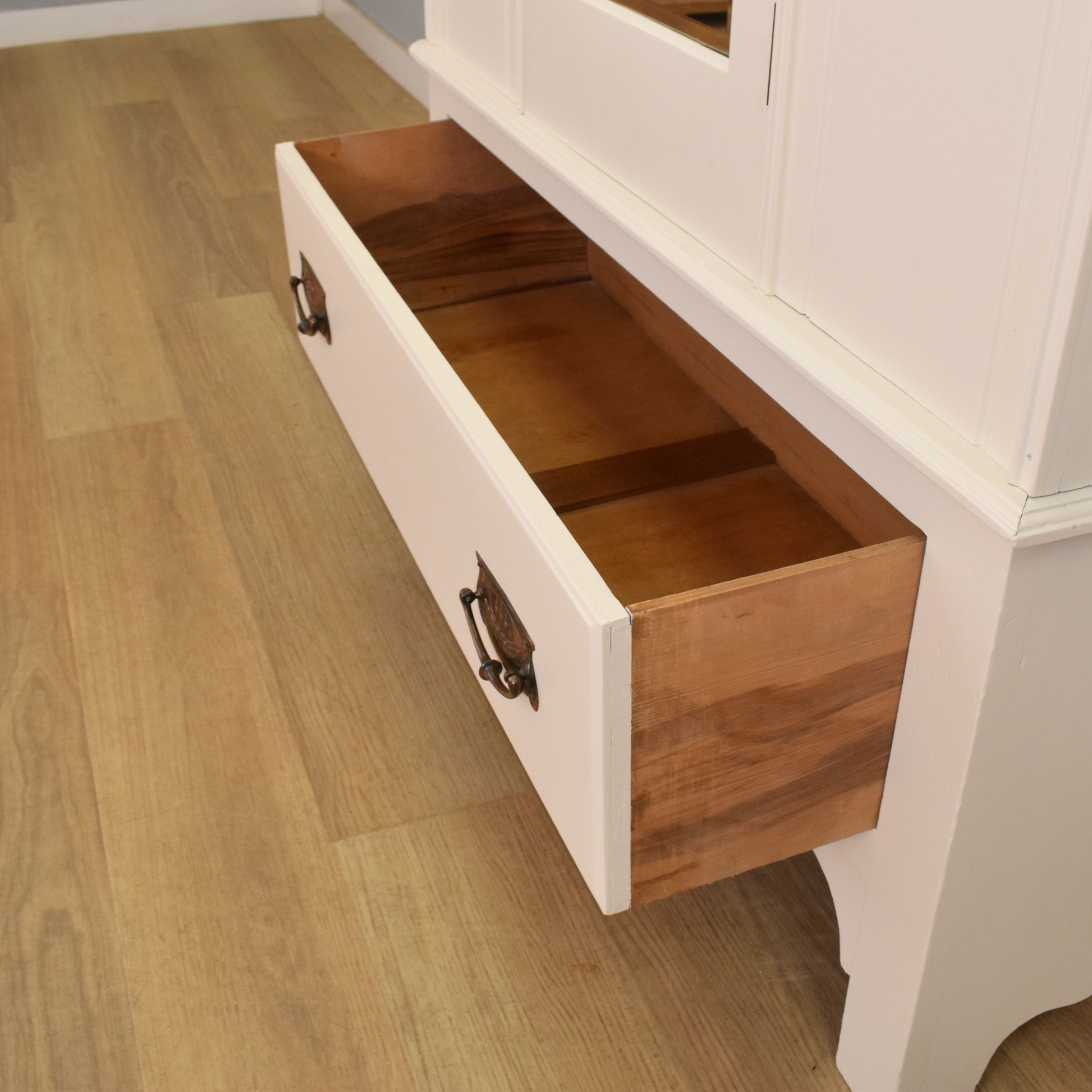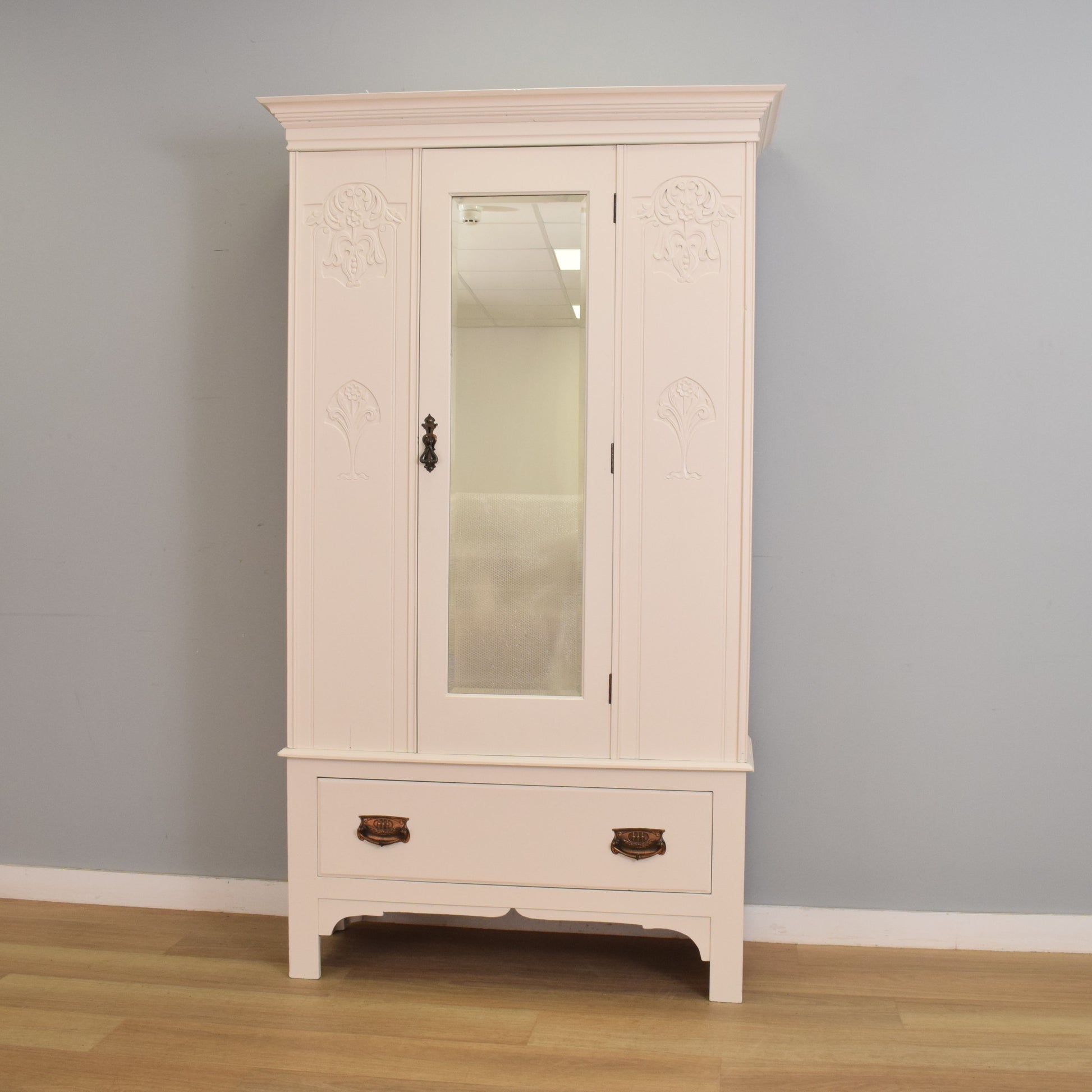 The tall single-door design features a full-length bevel-edged mirror to the centre, flanked by carved floral and Art Nouveau-style motifs on either side. The door opens to reveal a hanging rail on either side, making it ideal for coats or longer garments, and below sits a generous full-width drawer with beautifully aged copper-tone handles, offering additional concealed storage.