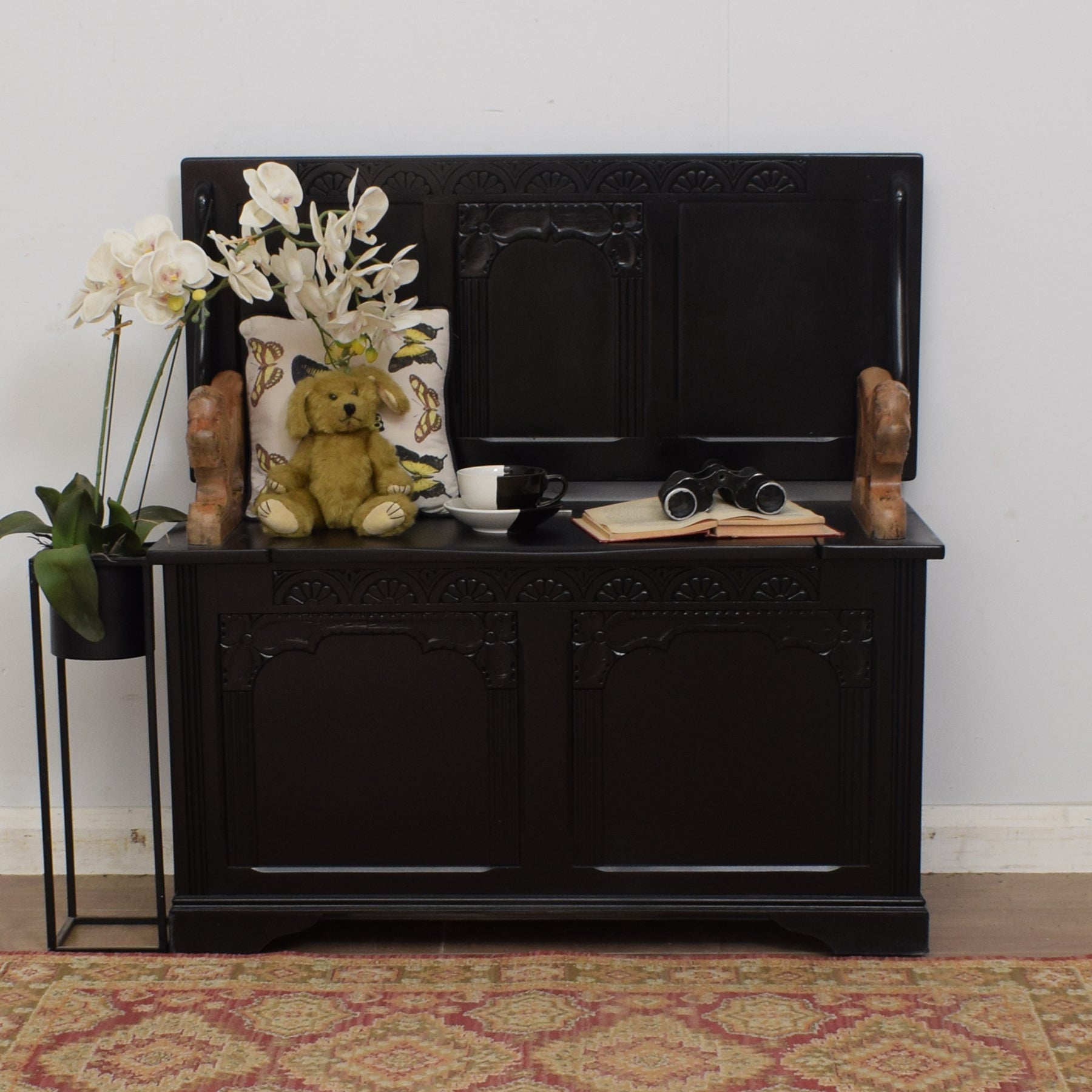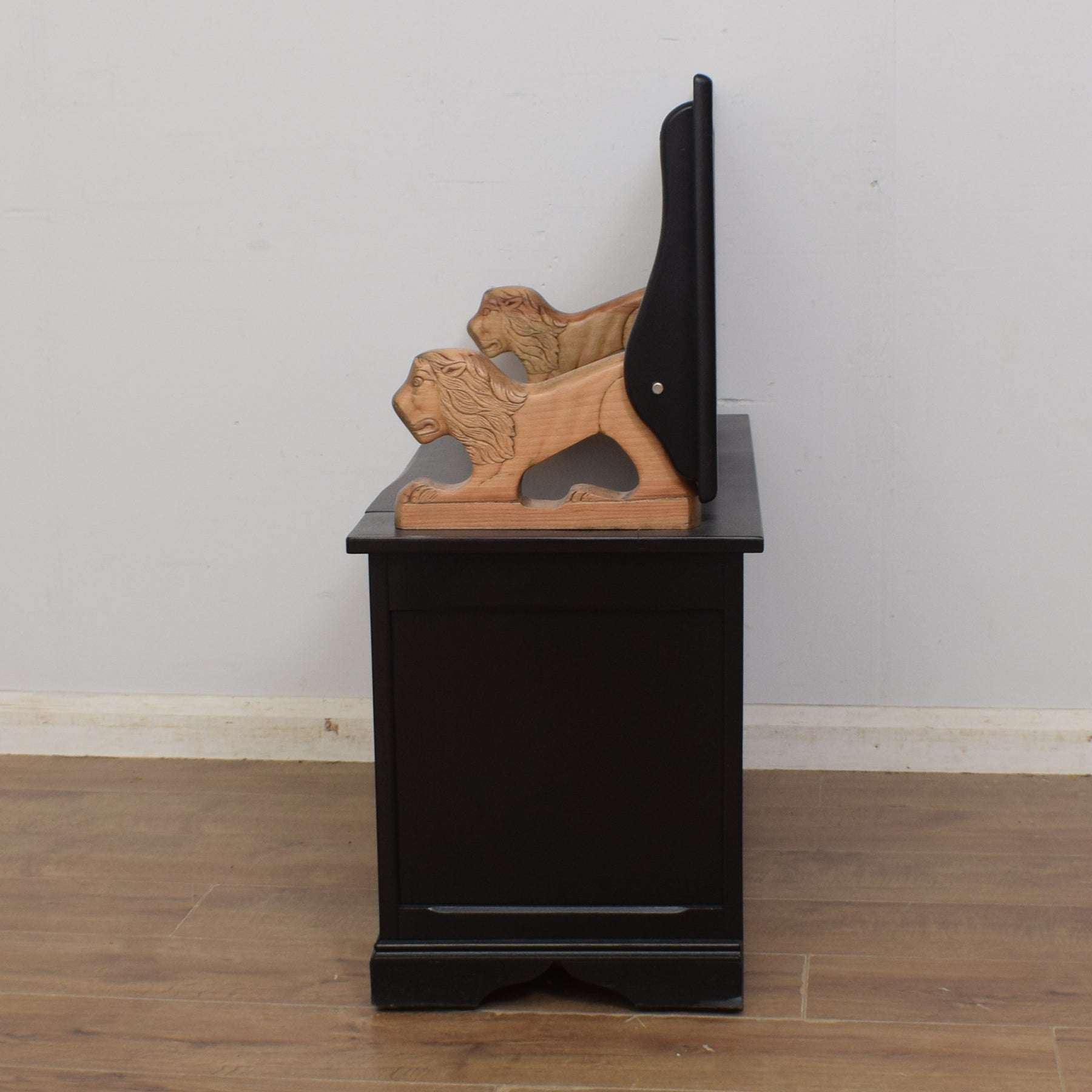 The previous darker stain has been stripped from the lion supports and a hard-wearing matte lacquer has been applied, providing a durable, long-lasting finish. The rest of the monks bench has been painted black to provide a fabulous contrast and bold finish. This item is constructed with some solid oak sections but is primarily made from oak veneer and plywood.