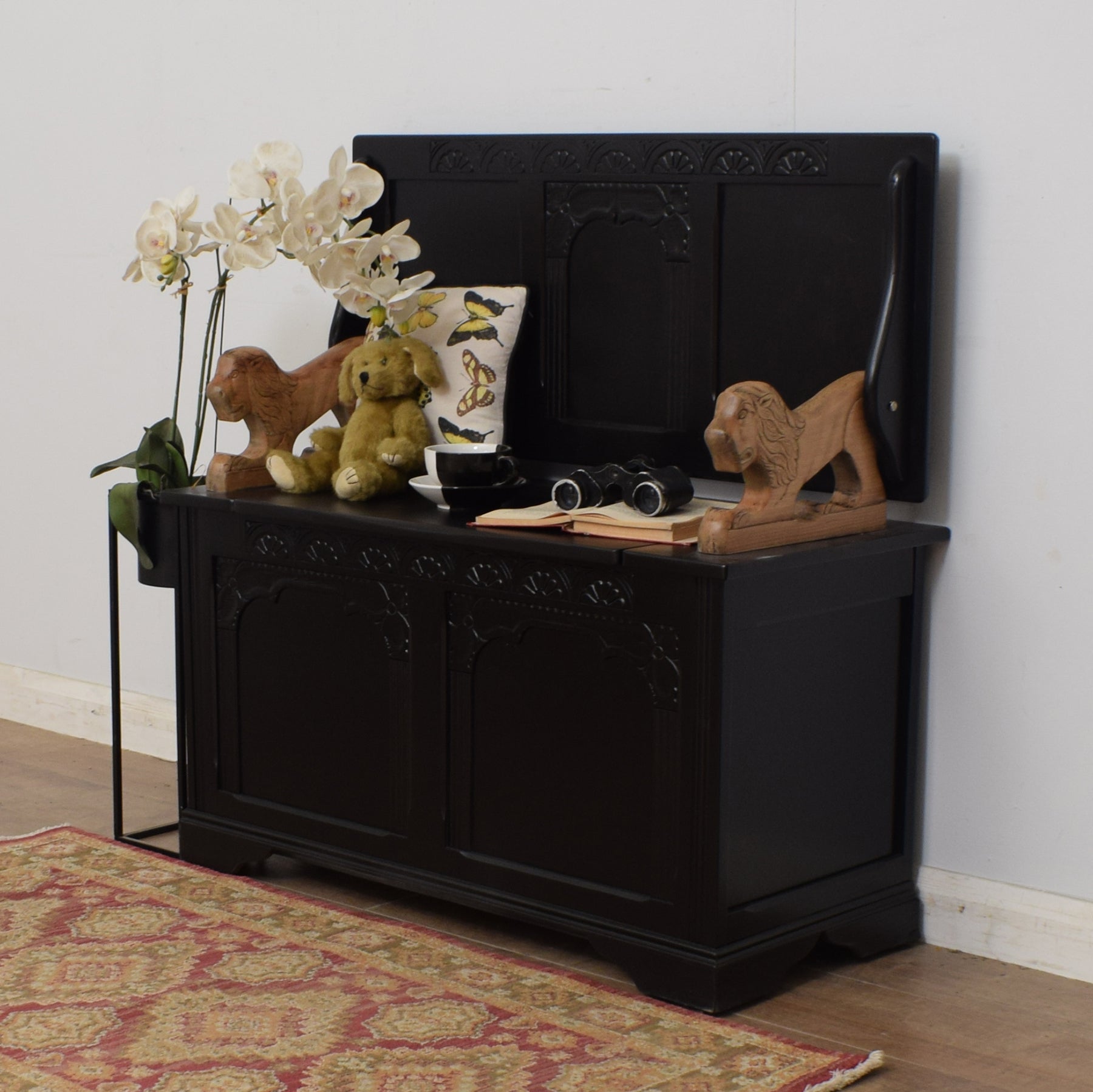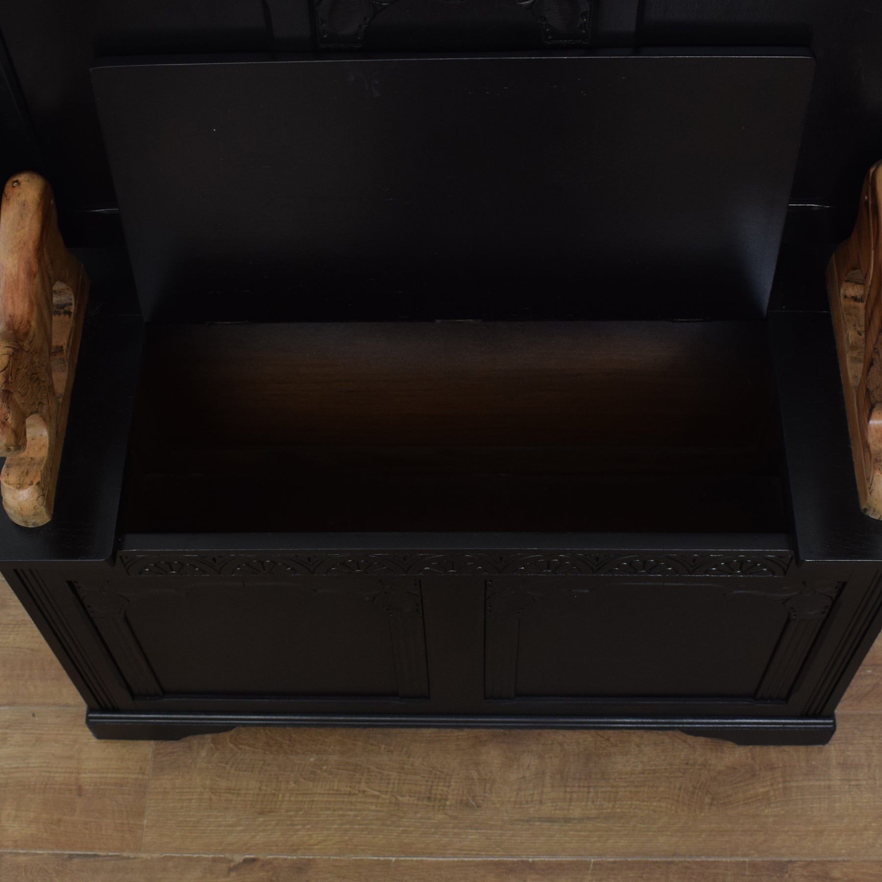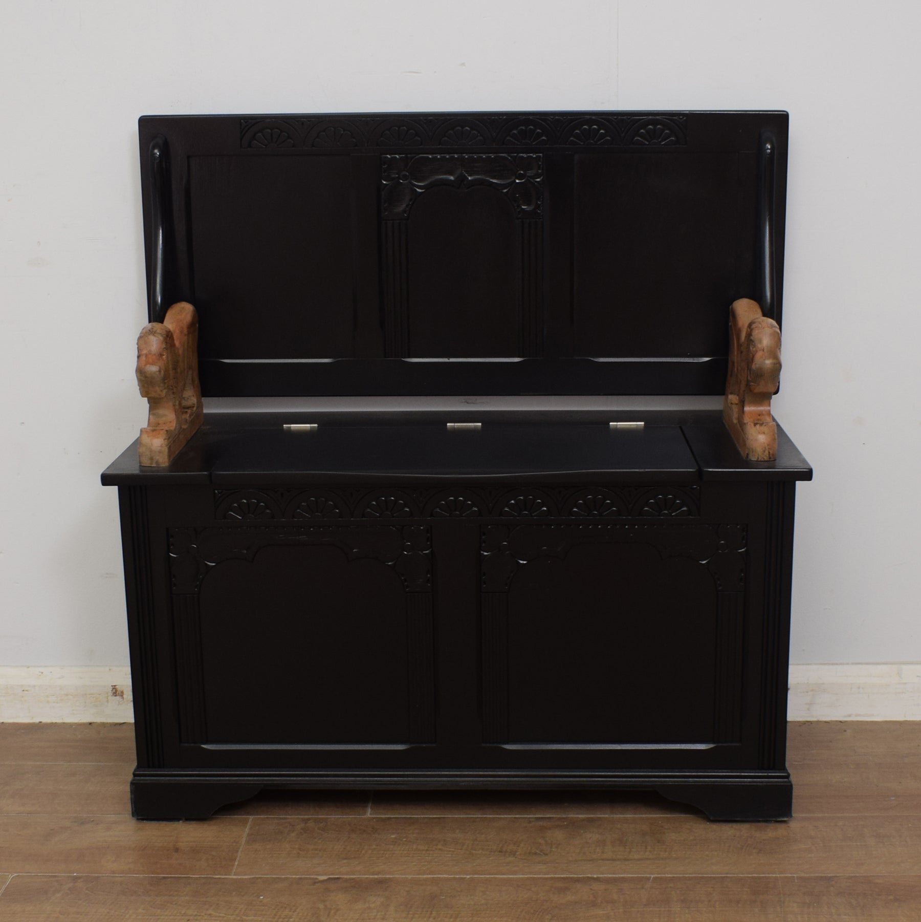 This particular monks bench features carved details, including arched panelling and decorative motifs, adding a touch of traditional craftsmanship. The standout feature is the pair of boldly carved lion supports on each armrest, giving the piece a regal and striking presence. The lift-up seat reveals a spacious storage compartment, making it as functional as it is decorative.