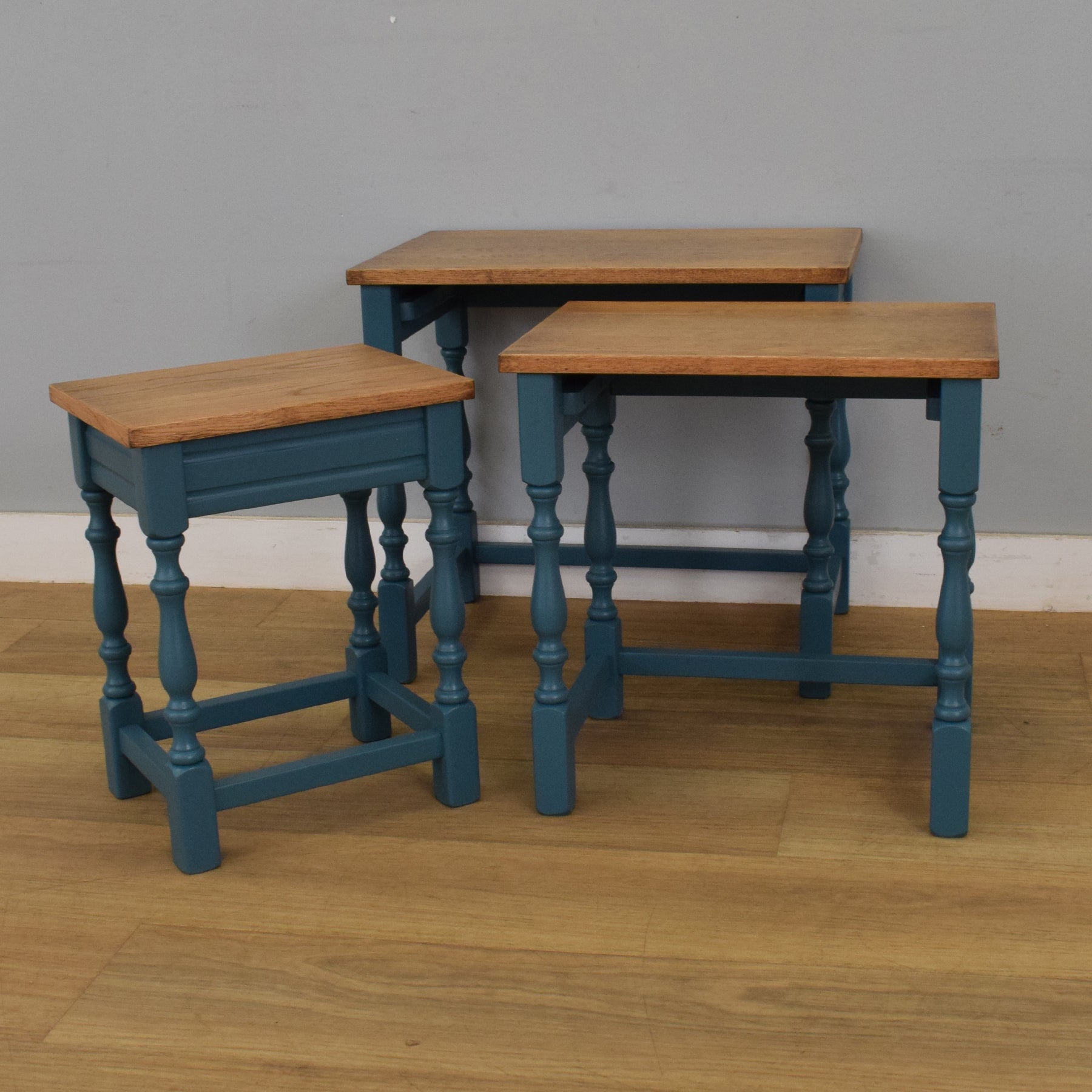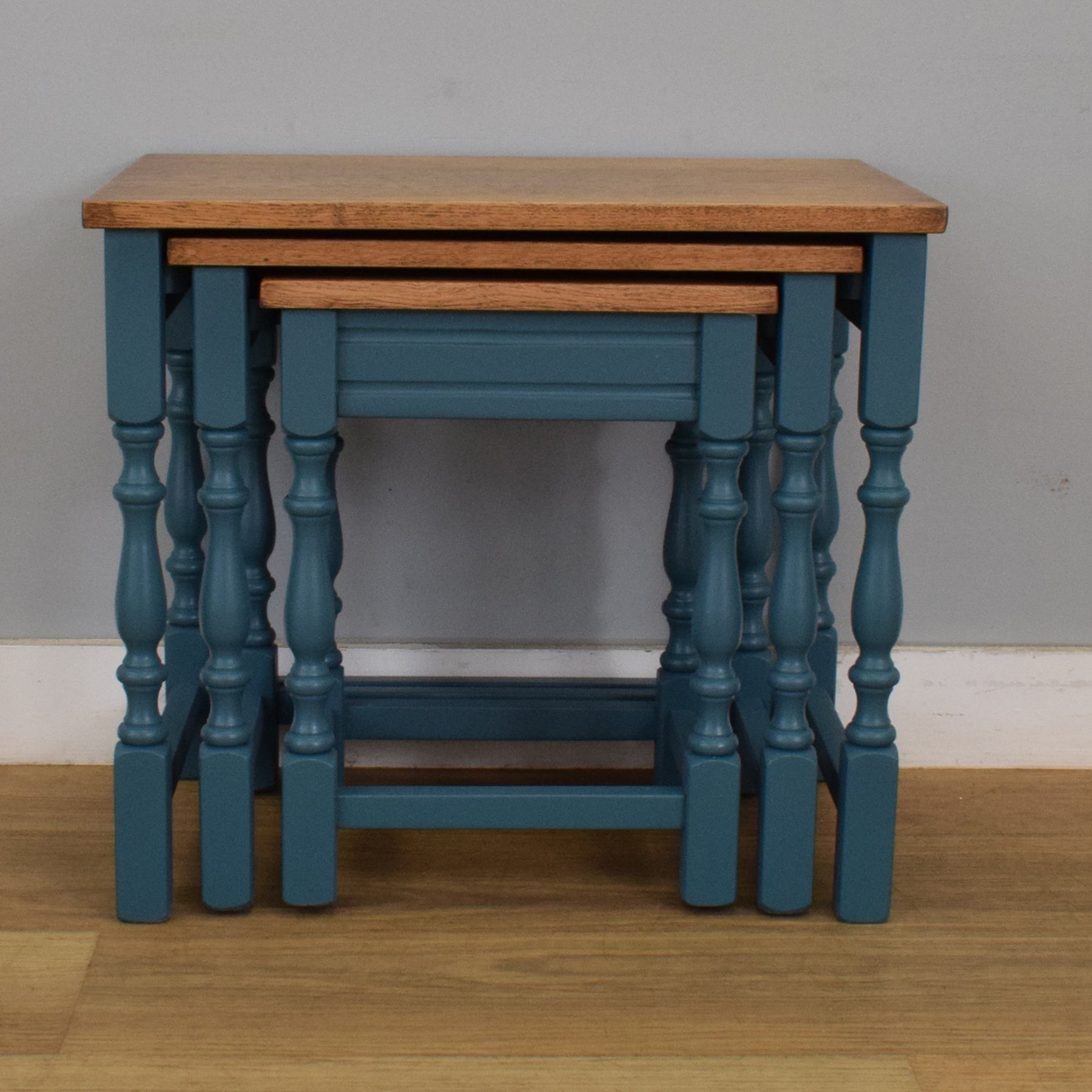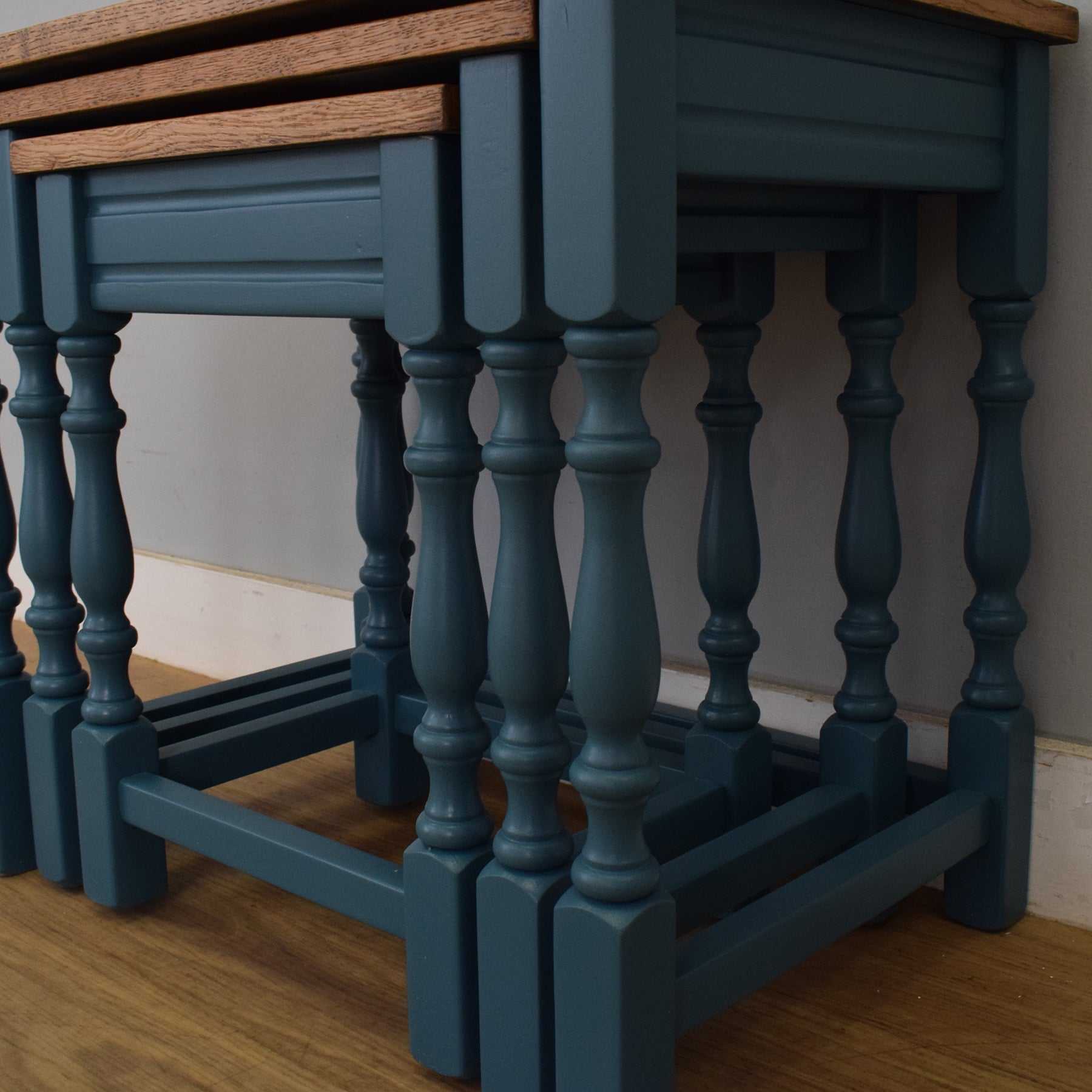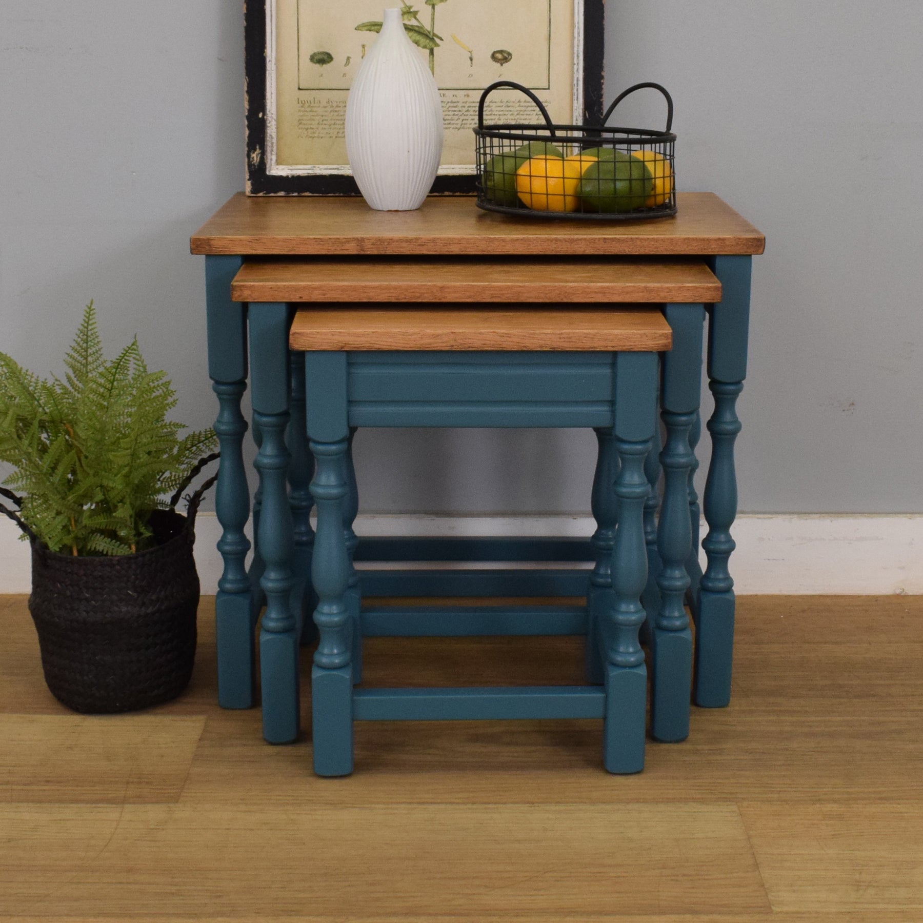 This set of three nesting tables features classic turned legs and oak tops, combining timeless design with everyday practicality. Each table fits neatly beneath the next, making them ideal for smaller spaces or for keeping things tidy between uses. The natural oak grain of the tops contrasts beautifully with the deep blue painted bases, creating a look that is both traditional and contemporary.