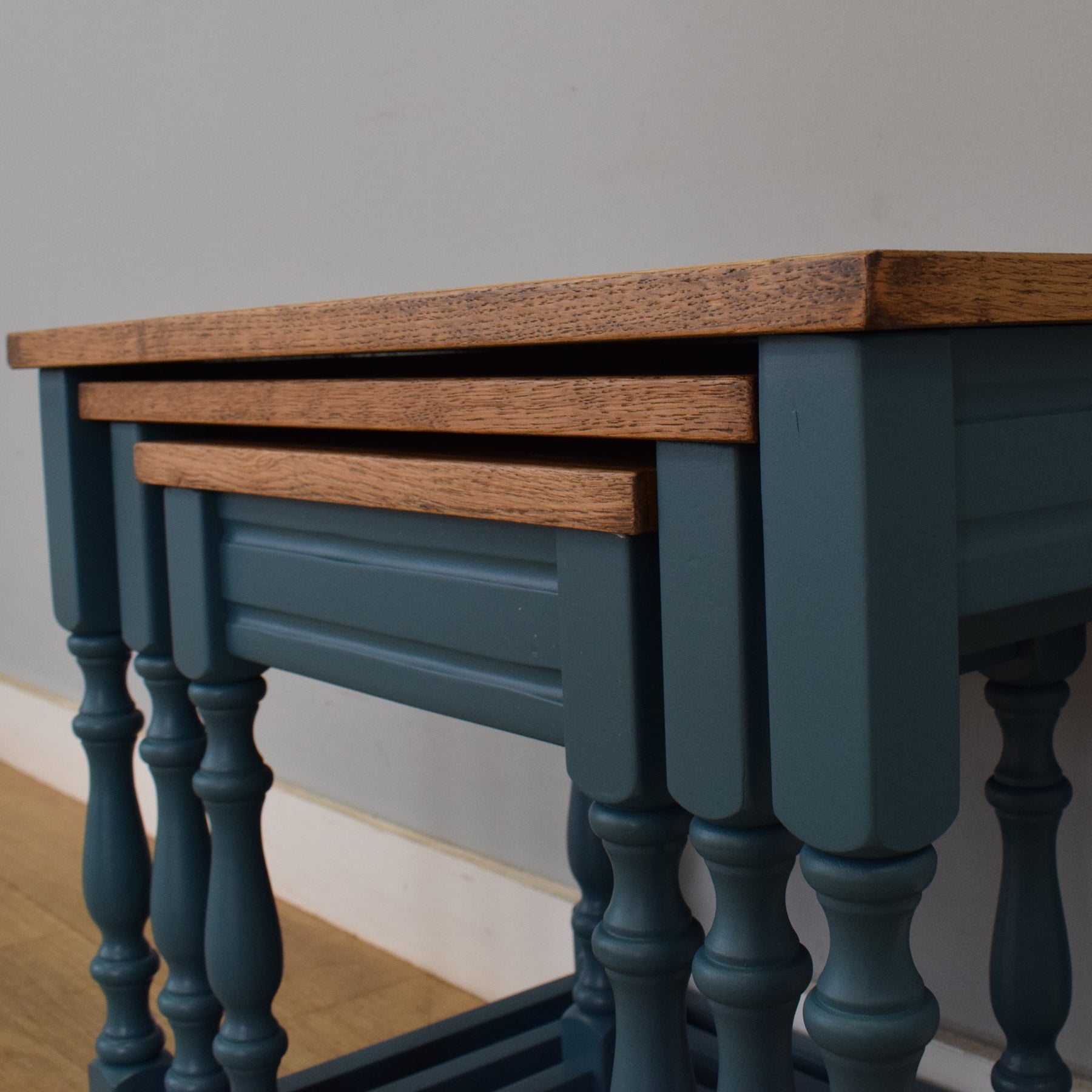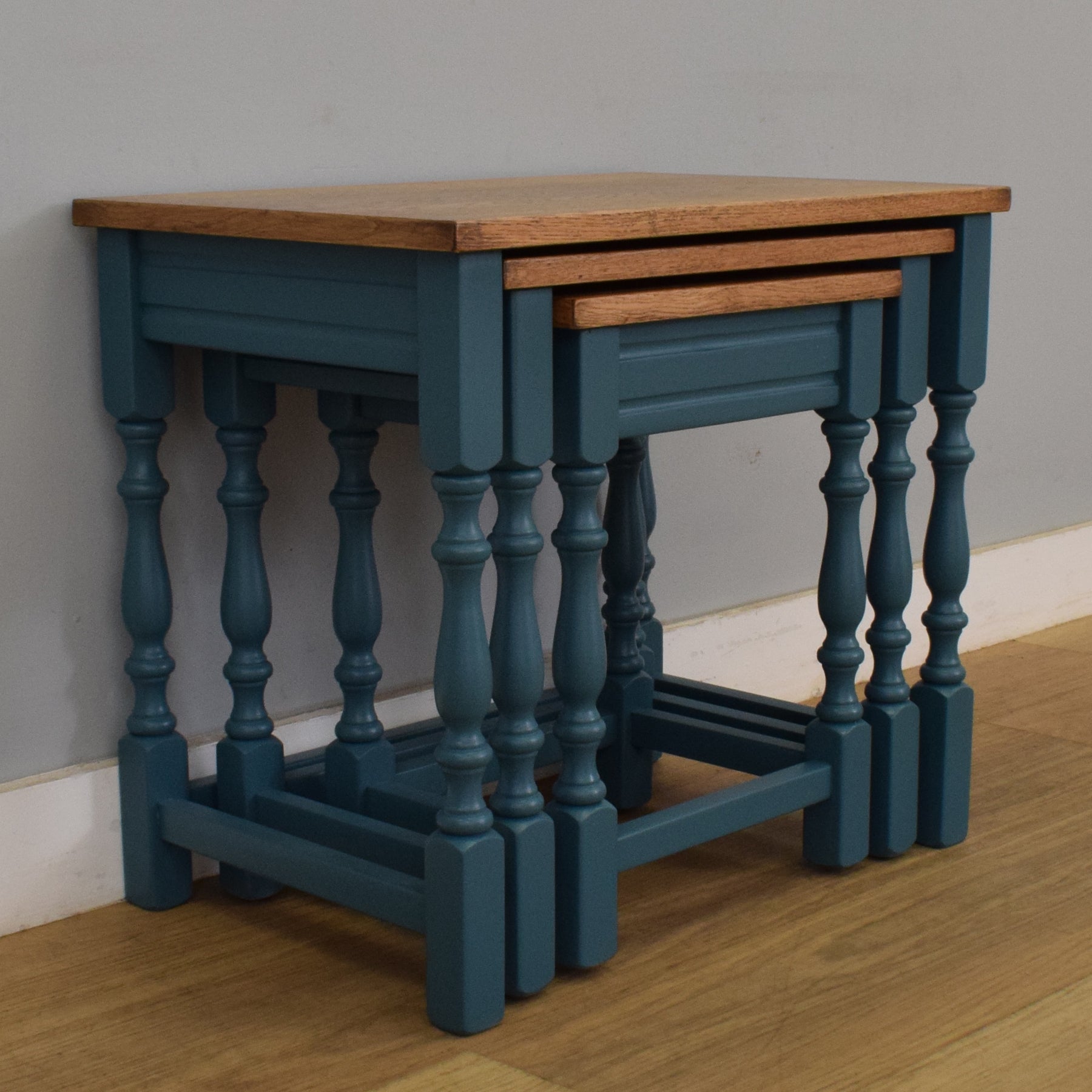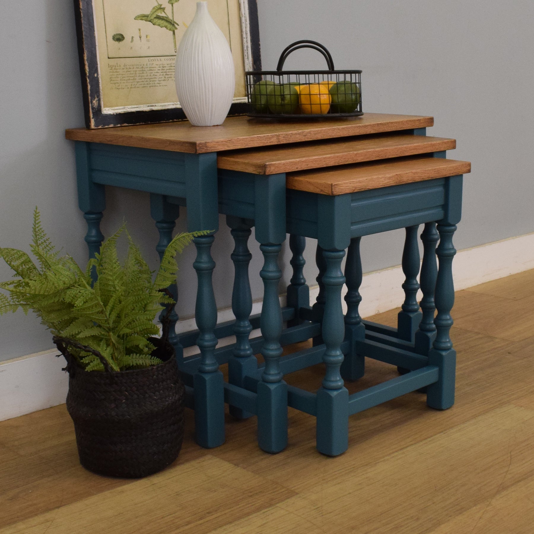 This set of three nesting tables features classic turned legs and oak tops, combining timeless design with everyday practicality. Each table fits neatly beneath the next, making them ideal for smaller spaces or for keeping things tidy between uses. The natural oak grain of the tops contrasts beautifully with the deep blue painted bases, creating a look that is both traditional and contemporary.
