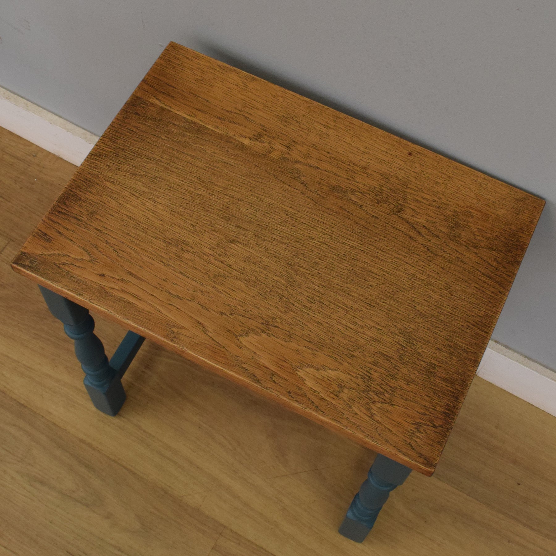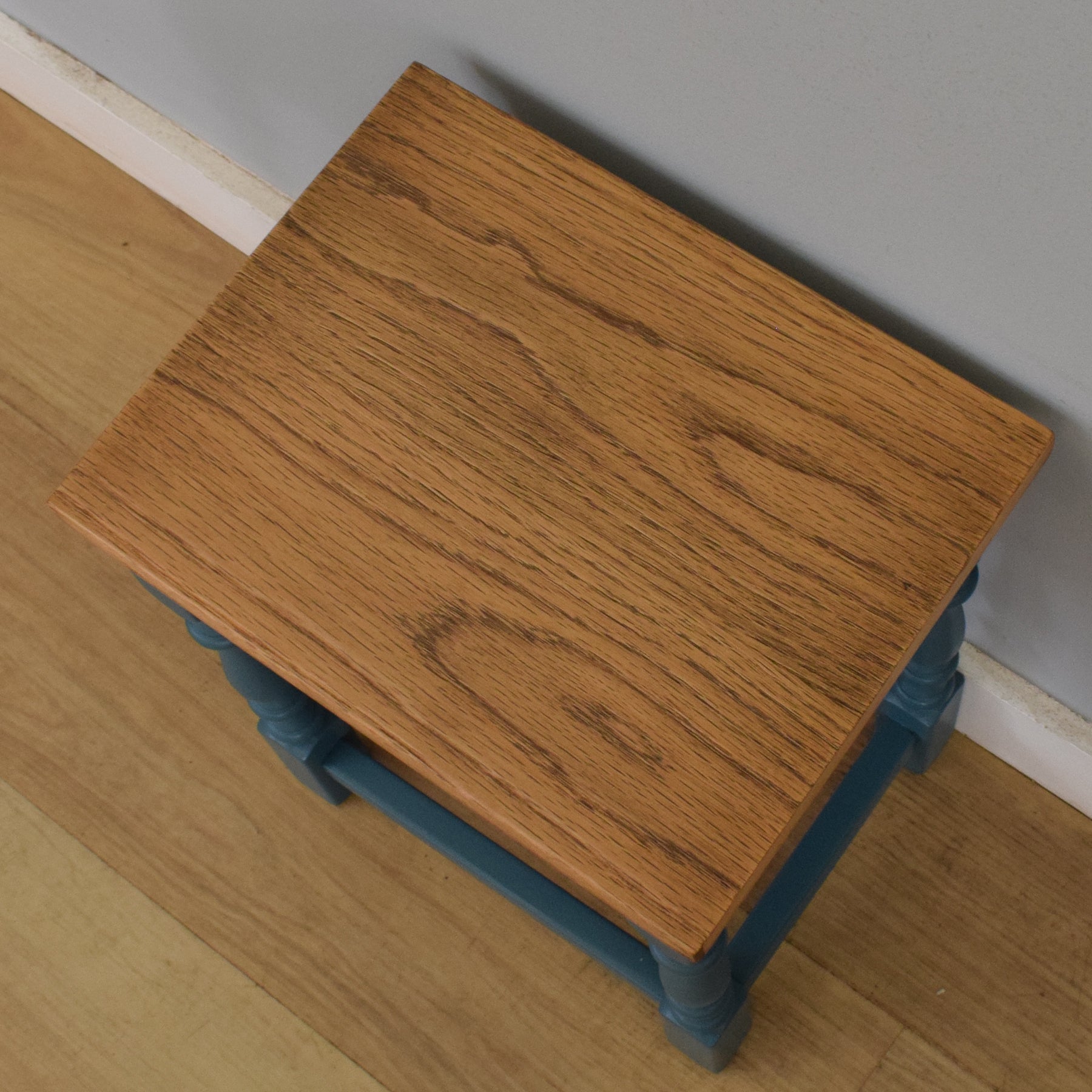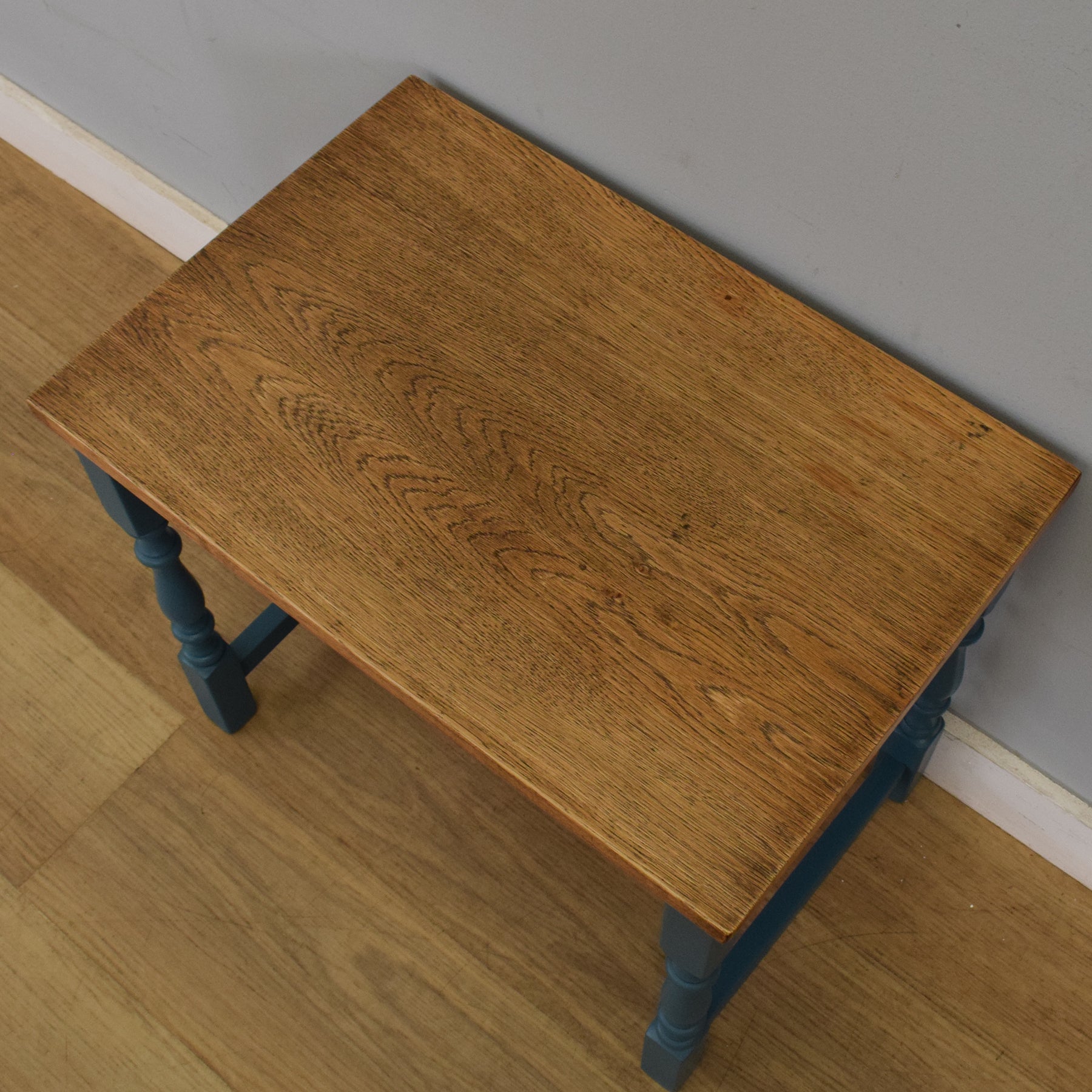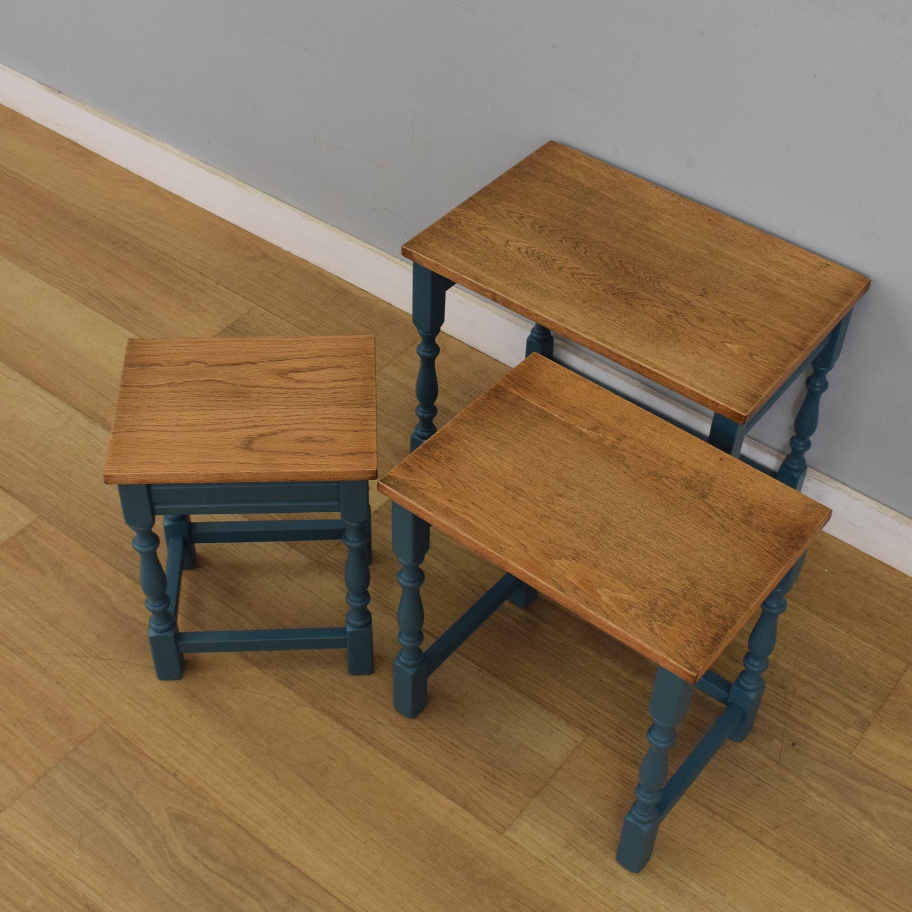 This set of three nesting tables features classic turned legs and oak tops, combining timeless design with everyday practicality. Each table fits neatly beneath the next, making them ideal for smaller spaces or for keeping things tidy between uses. The natural oak grain of the tops contrasts beautifully with the deep blue painted bases, creating a look that is both traditional and contemporary.