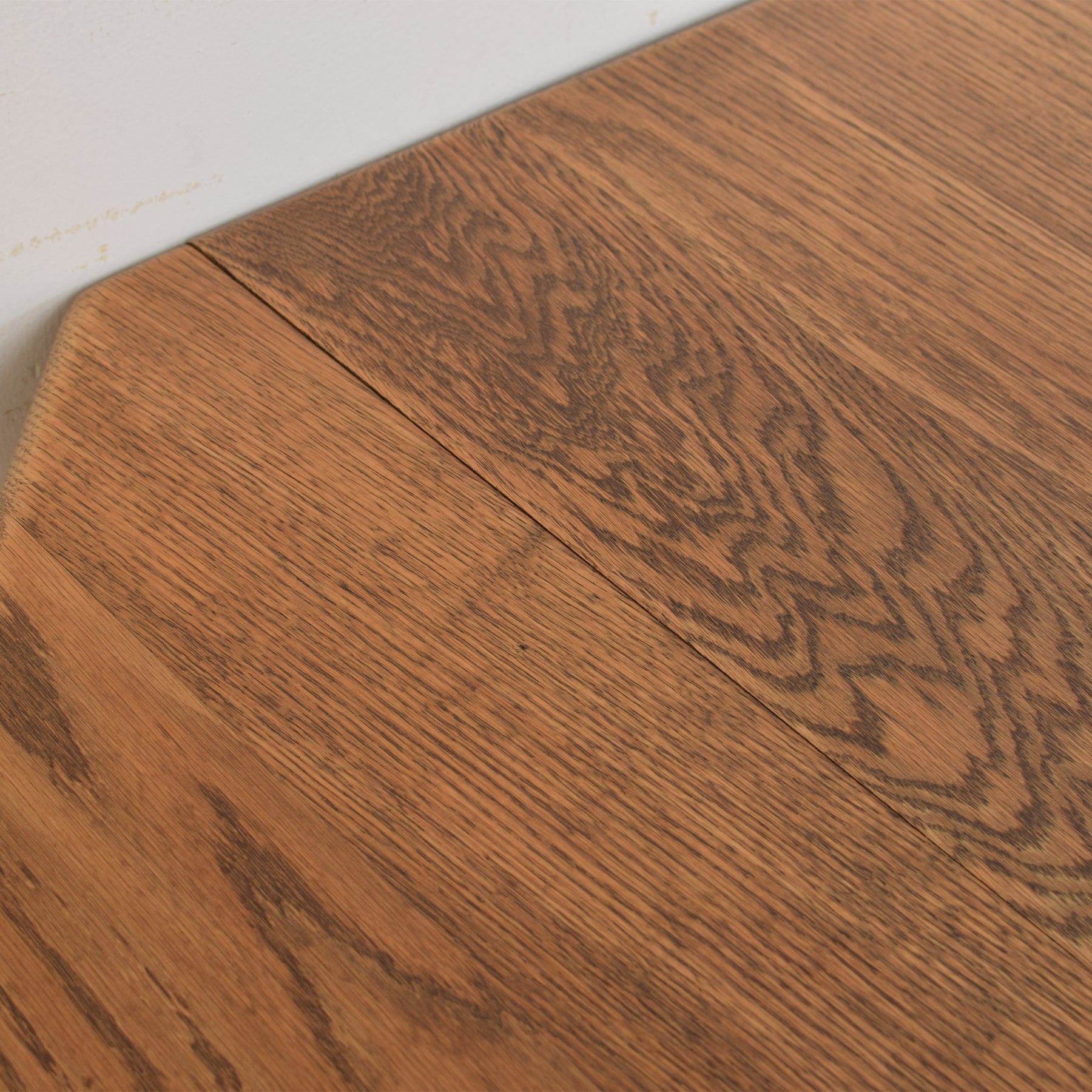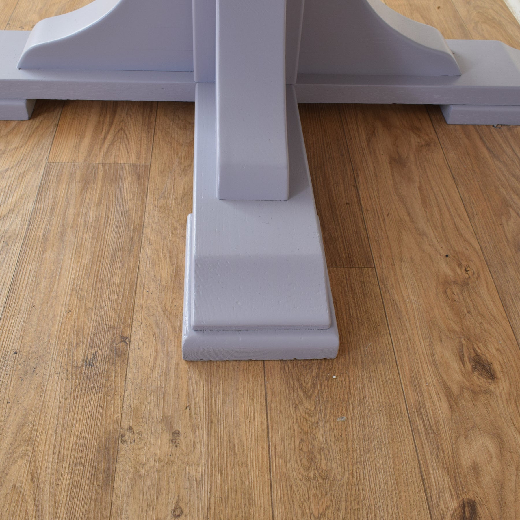 The table base and chair frames have been carefully keyed back and fully prepared before being painted in ‘Mid Wedgewood’, resulting in a smooth and durable finish. The table top and chair pads have been stripped and coated with multiple layers of hard-wearing matte lacquer, bringing out the rich oak grain and providing long-lasting protection. This set is made entirely from solid oak. There is a small split towards one edge of the table top, this does not affect the structure of the table, and is visible in the accompanying photographs.