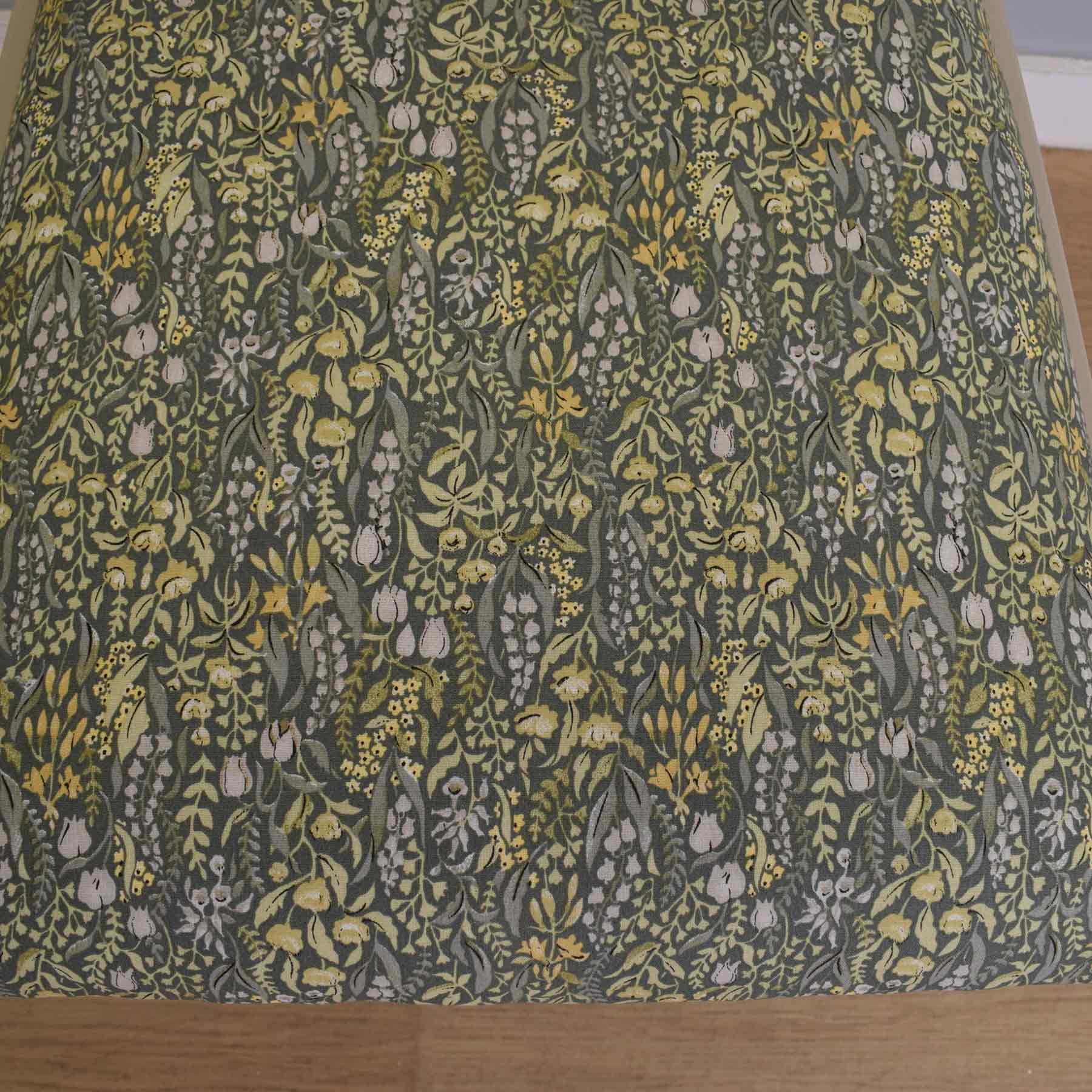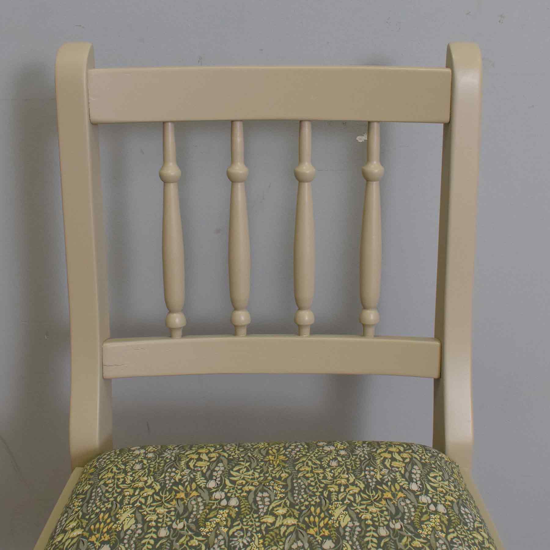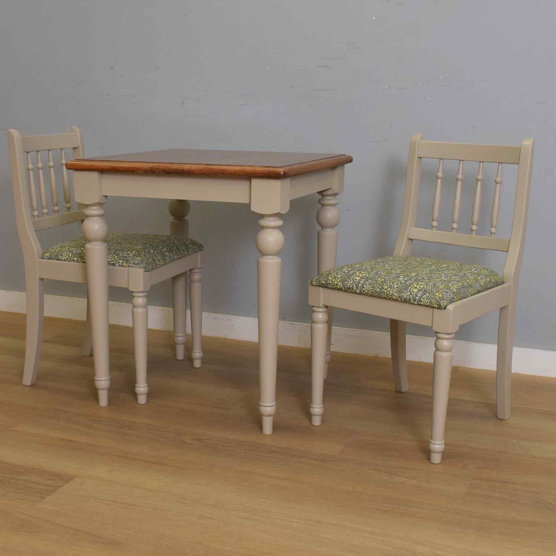 The set includes a compact rectangular table and two matching chairs, making it well suited to more modest spaces. The table has a rich oak top that adds warmth and contrast against the soft neutral painted base, with turned legs giving it a traditional country style. The chairs follow the same design with simple spindle backs and upholstered seats in a detailed botanical fabric, adding comfort as well as a gentle touch of pattern and colour.