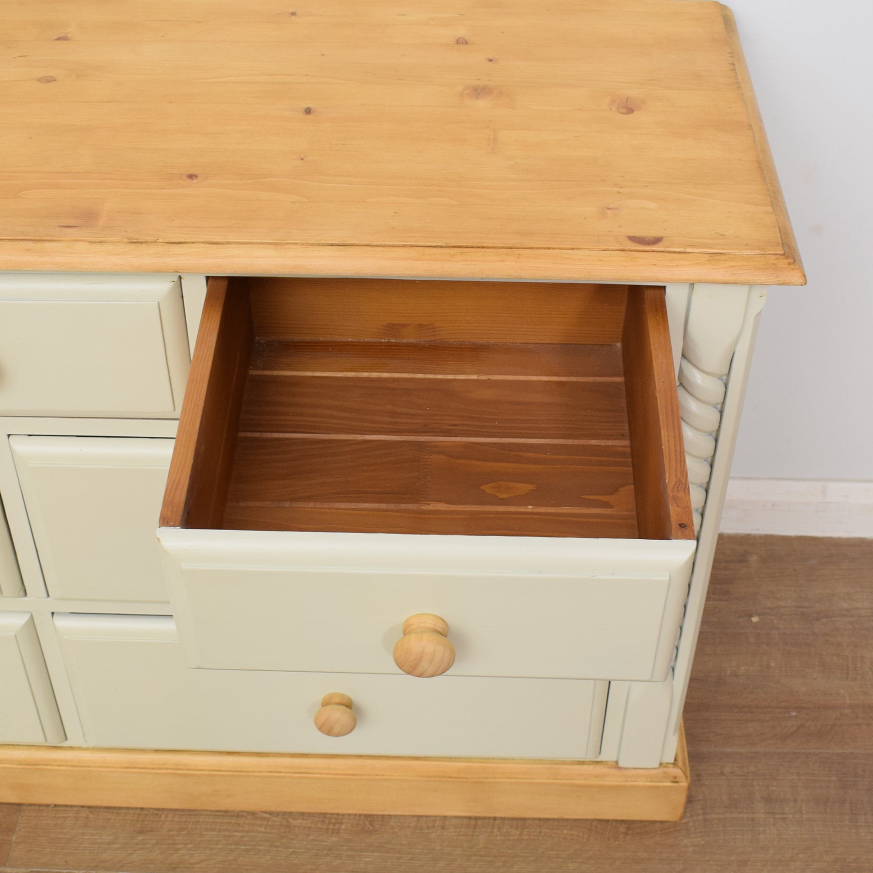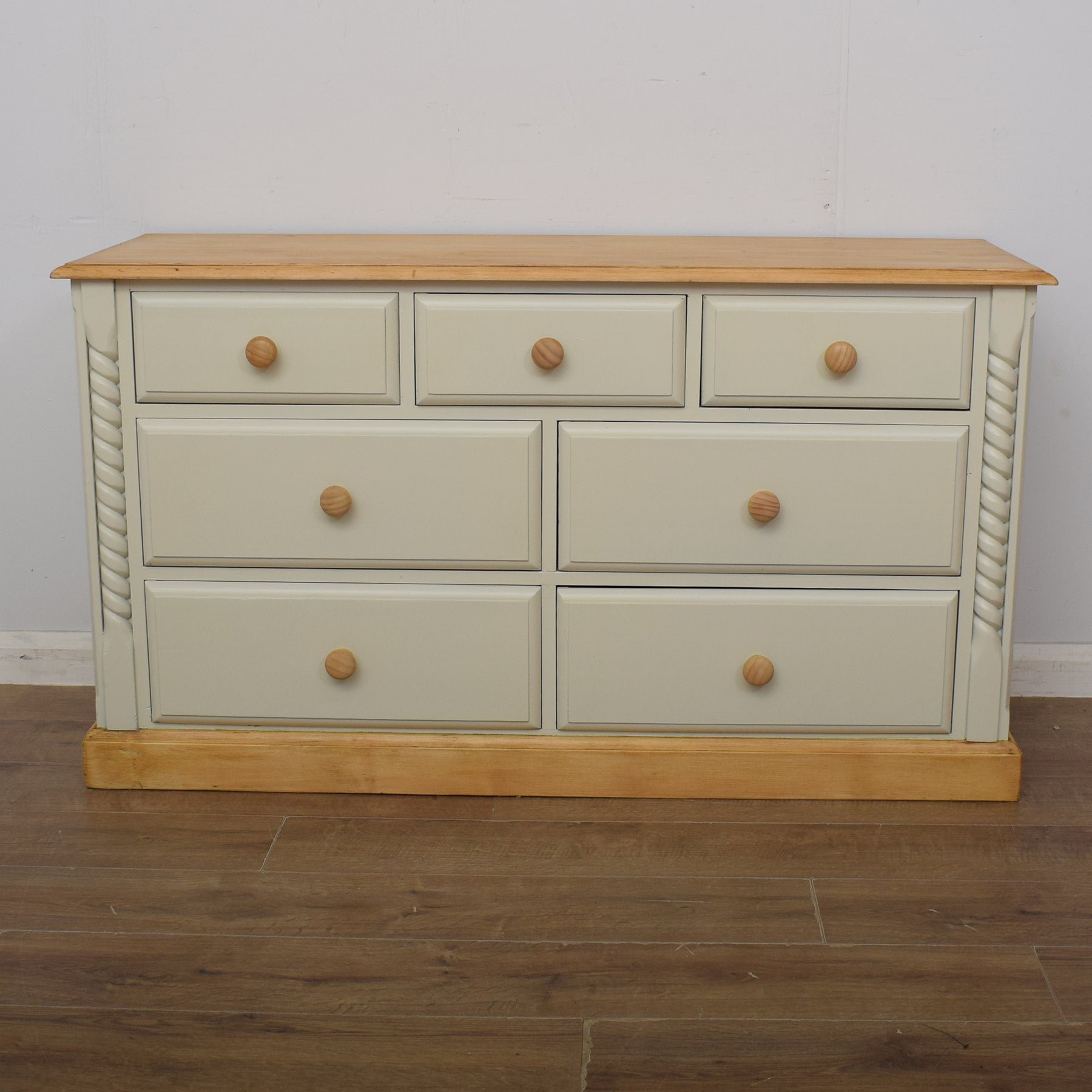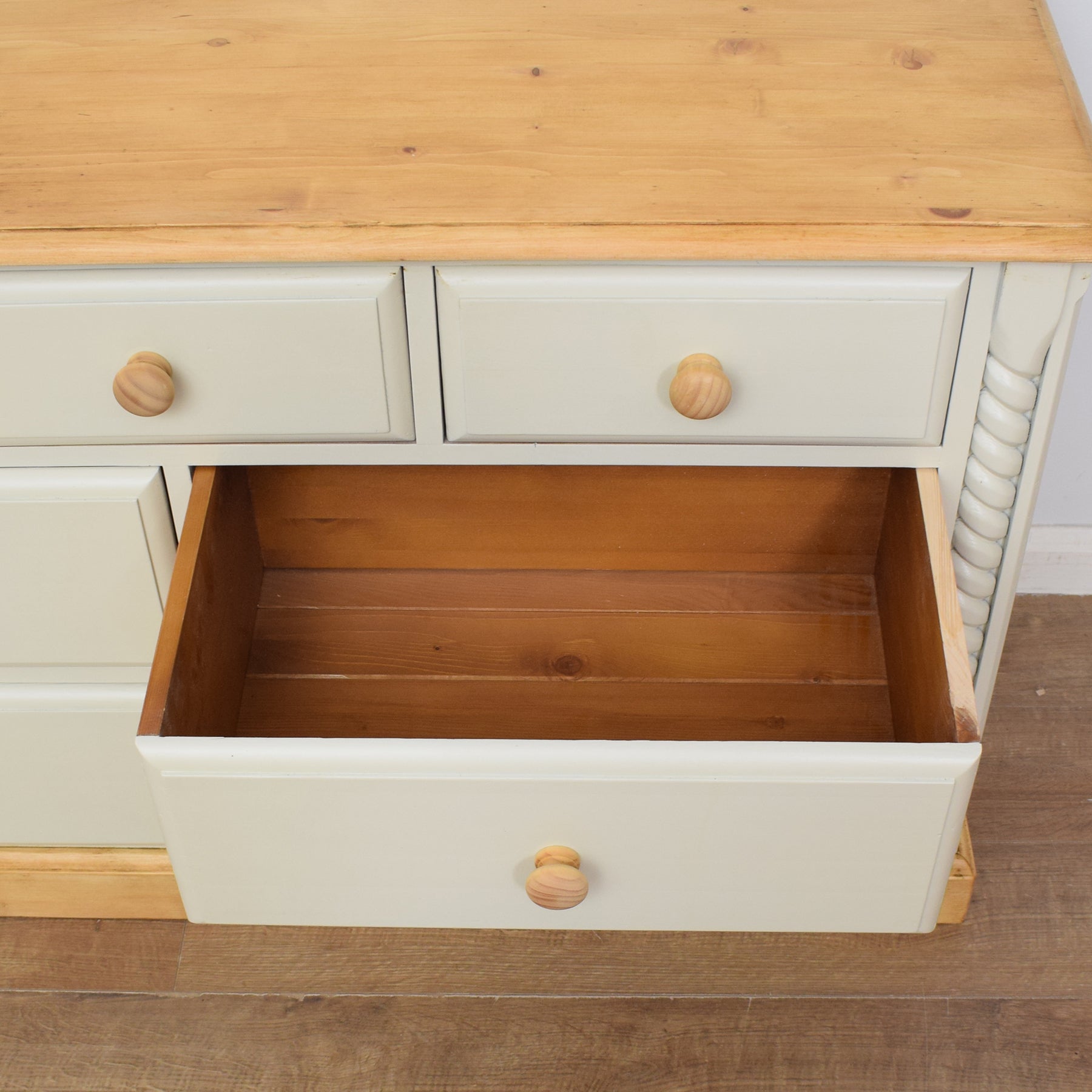 The beautiful pine top is a great place for your favourite ornaments and photographs. Below are three small drawers above four half-width drawers providing plenty of storage space for linen and clothing. The carved details running down either side and the attractive pine handles all add to the visual appeal.