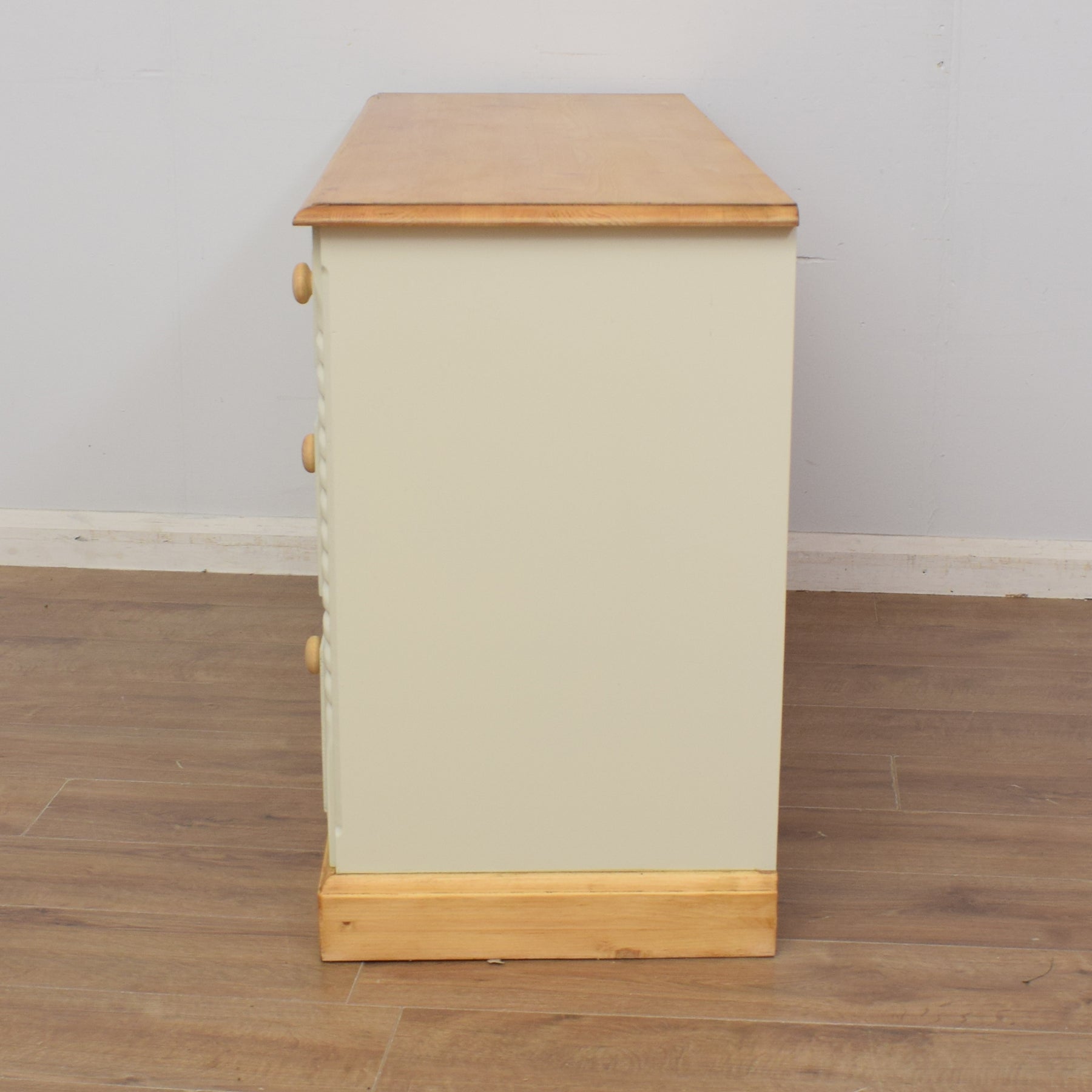 We have restored this chest of drawers by stripping back by hand the old finish to reveal the natural pine underneath. The top and the plinth have then been waxed to give an attractive finish and accentuate the beautiful pine grain. The rest of this chest has been painted in a neutral colour that compliments the natural wood and will fit with a variety of interiors. This piece is constructed entirely from pine.
