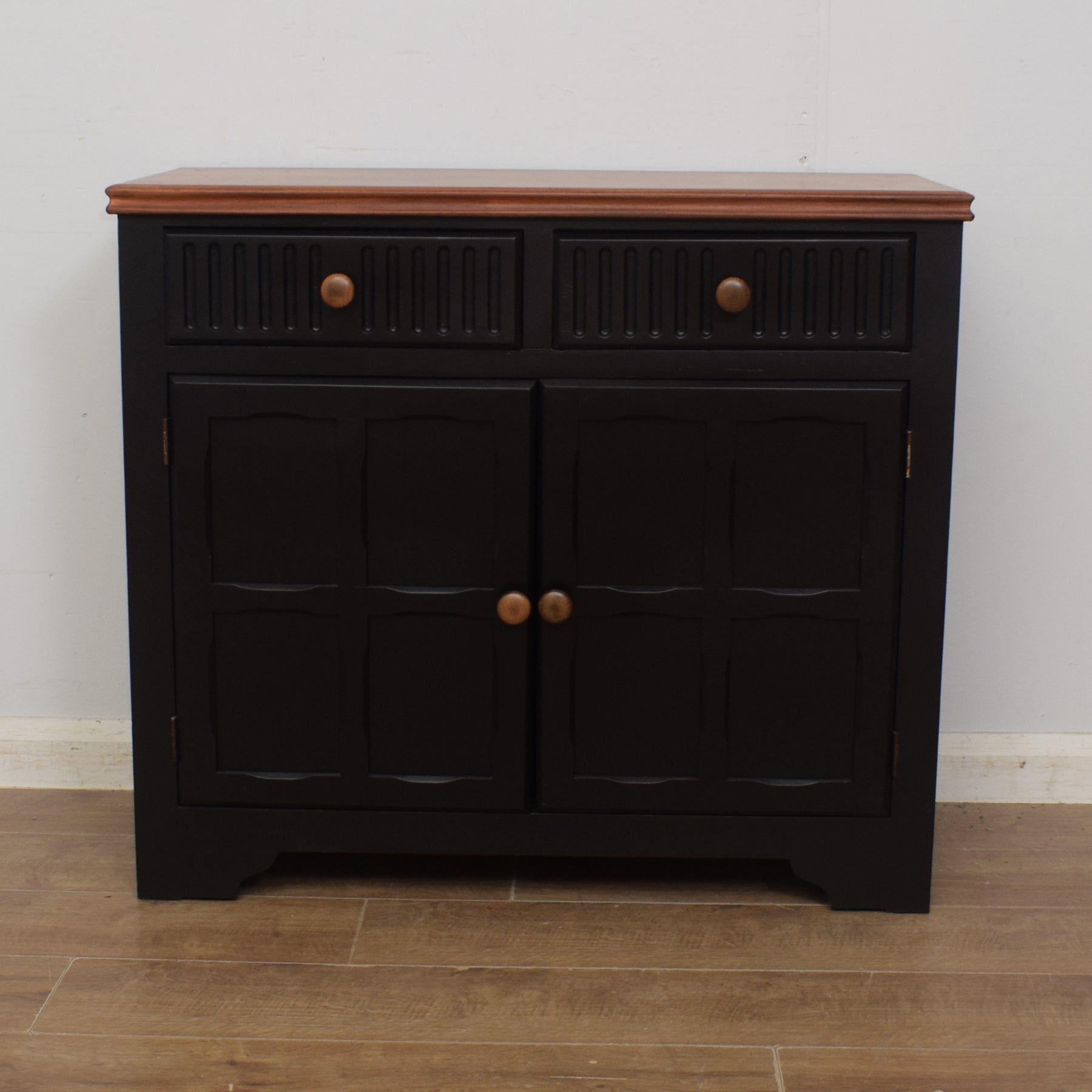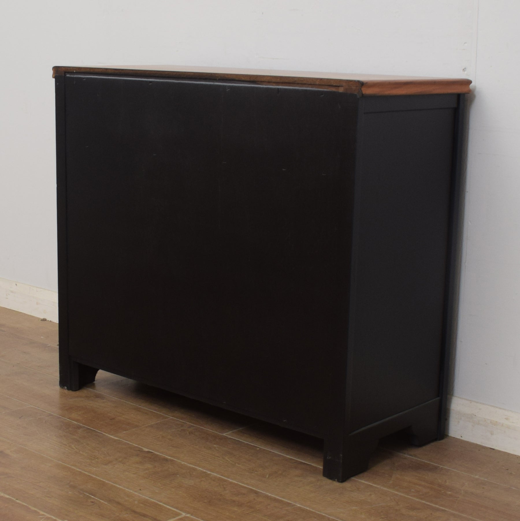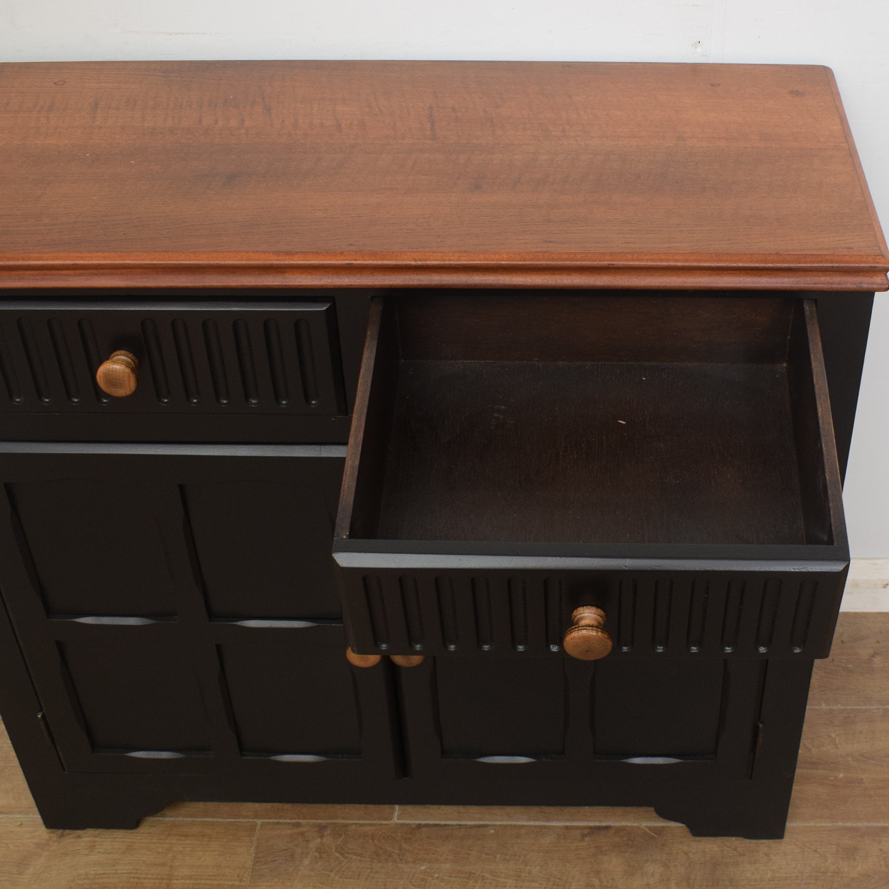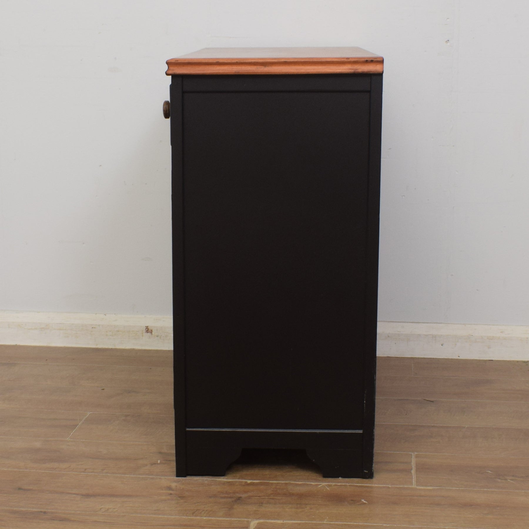 We have stripped the top of this sideboard and then applied a clear lacquer to protect the wood and accentuate the beauty of the wood grain. The rest has been painted in a striking black colour which provides a fabulous contrast to the natural oak top. Made of a mix of oak framework and oak-veneered plywood panels this piece has a plywood back and drawer sections.