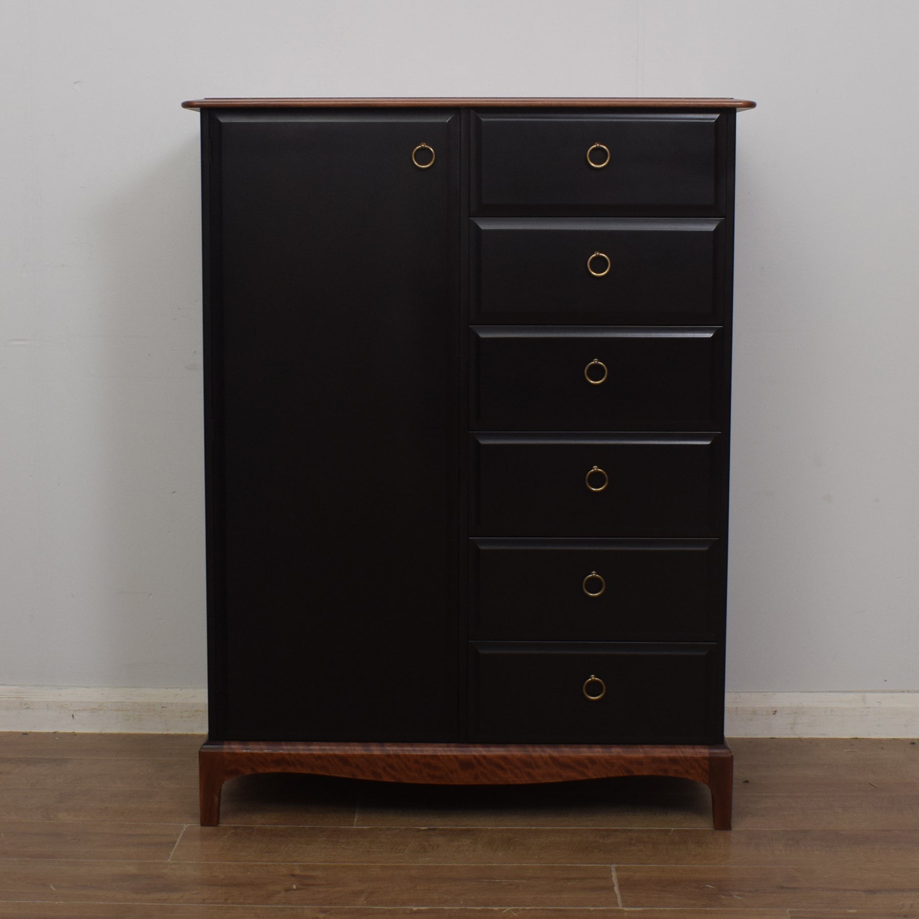 The left side provides hanging space for clothing and the right side has six drawers that are ideal for smaller items and linen. Internally, the cupboard space is equipped with a clothes rail at the top, for items that need storing on a hanger, and a rail at the bottom for storing shoes. Both the cupboard and the six drawers have the original and attractive ring handles.