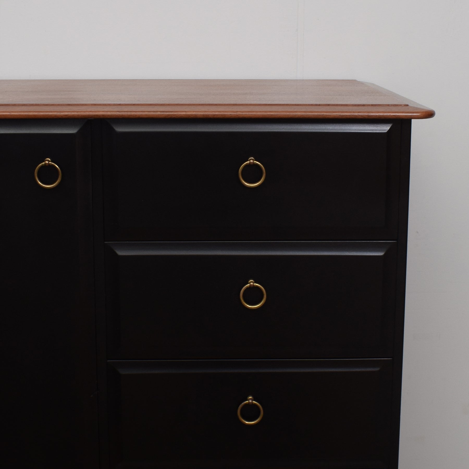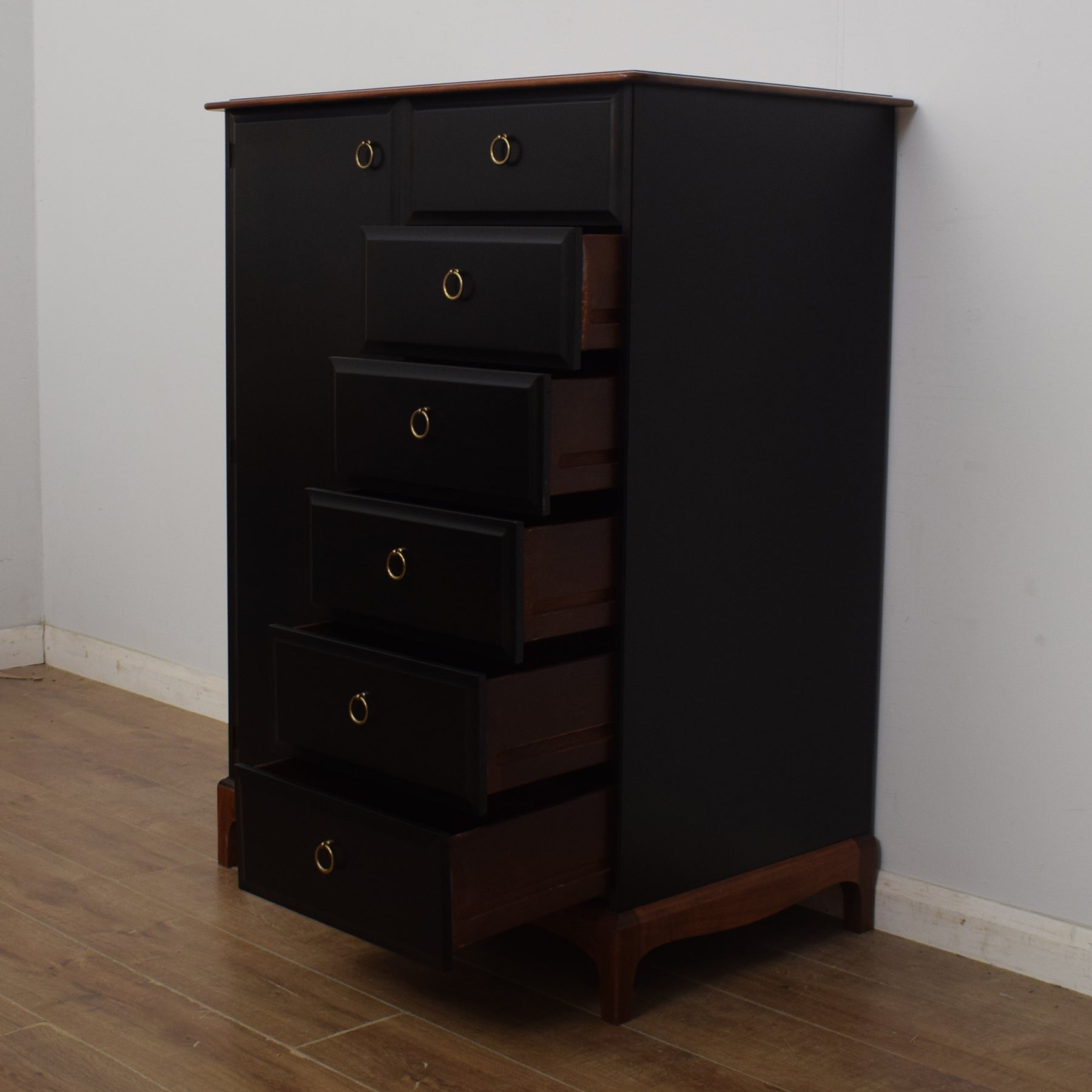 Our dedicated restoration team has revived this tallboy by removing the original finish before applying a clear lacquer to the crown and the plinth to provide protection. The rest has been painted black to provide a striking contrast with the wood and give an appealing finish. This tallboy is constructed predominantly from cherry wood. The back panel and drawer bases are plywood.