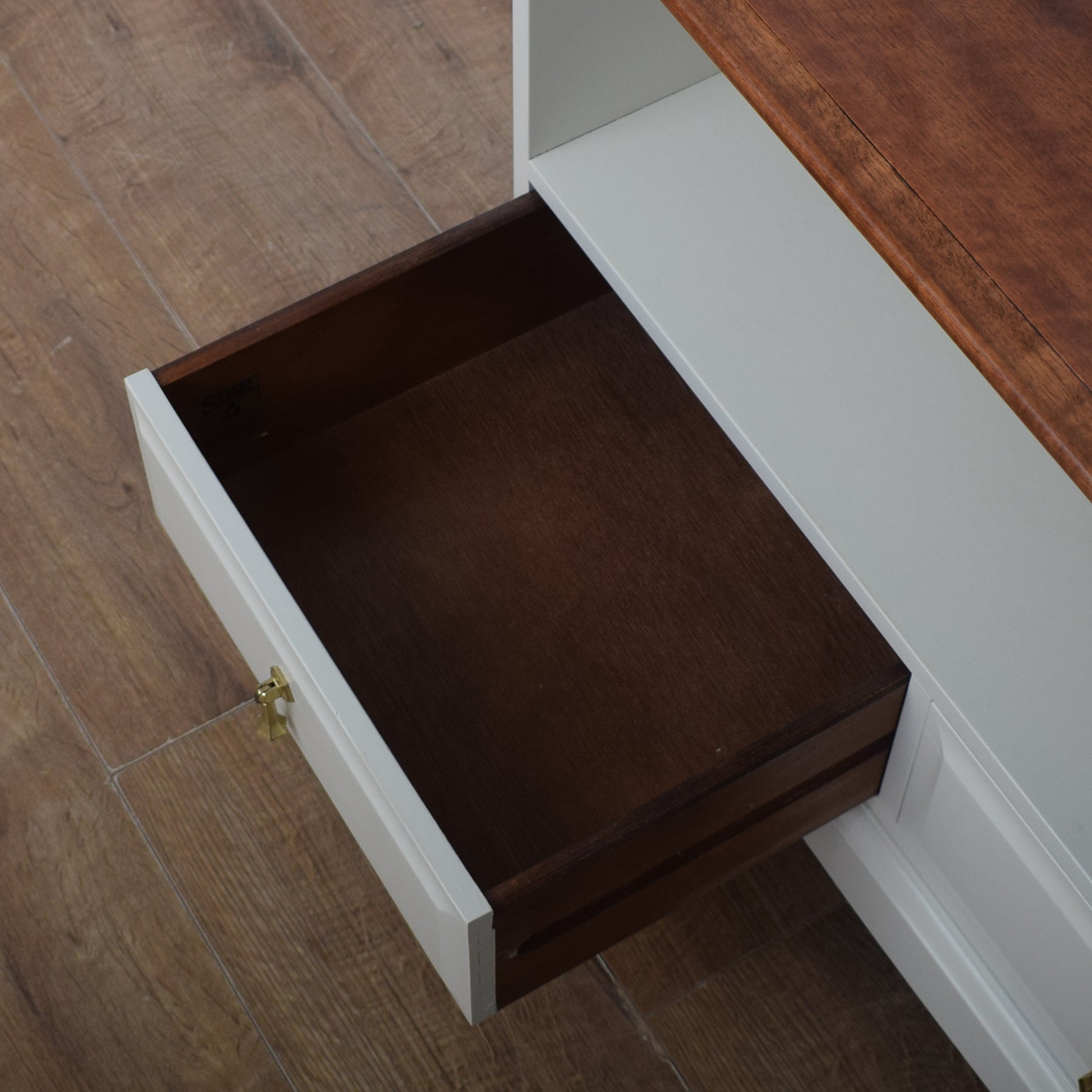This cabinet has been hand-sanded, cleaned, and multiple spray coats of 'Old White' paint have been applied, creating an appealing contrast to the cherry wood top, which has been lacquered for protection and depth. This TV cabinet is made mostly from cherry wood, with plywood used for the back panel and drawer bases.