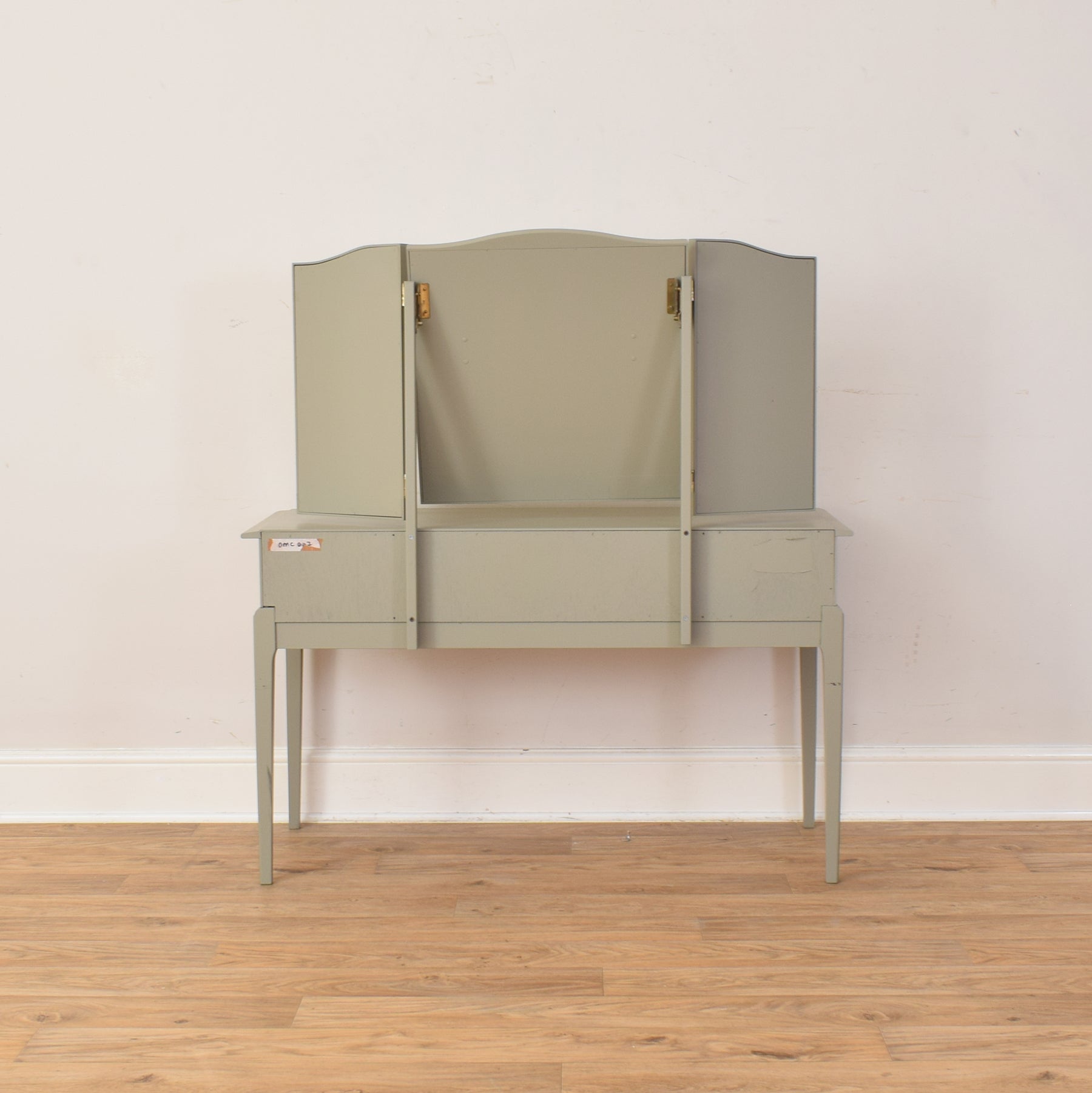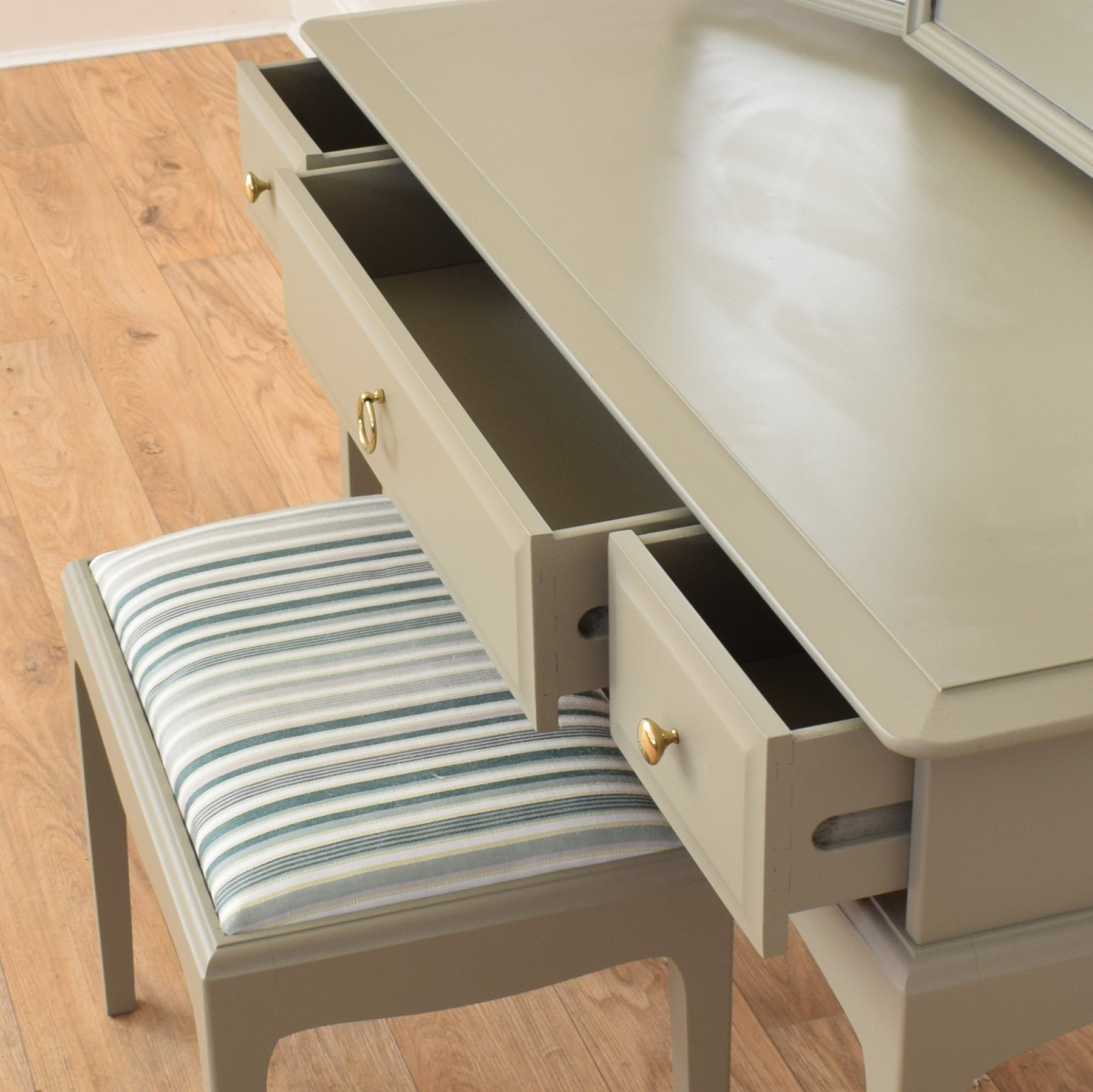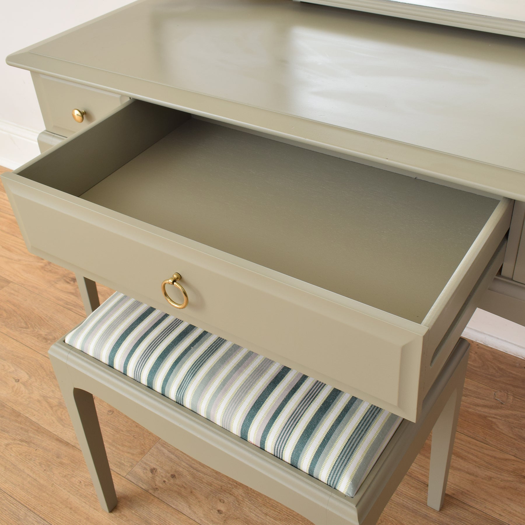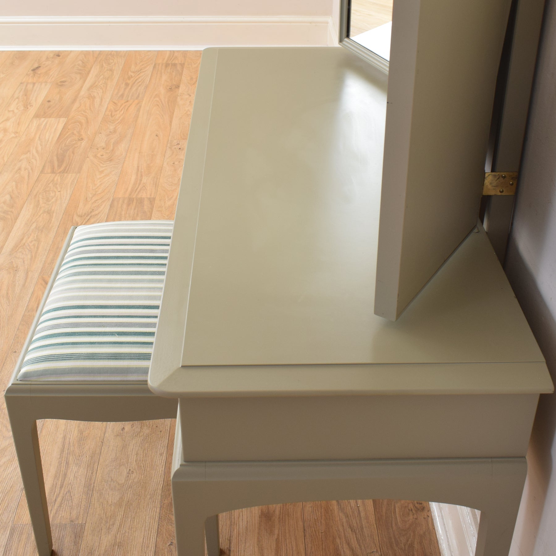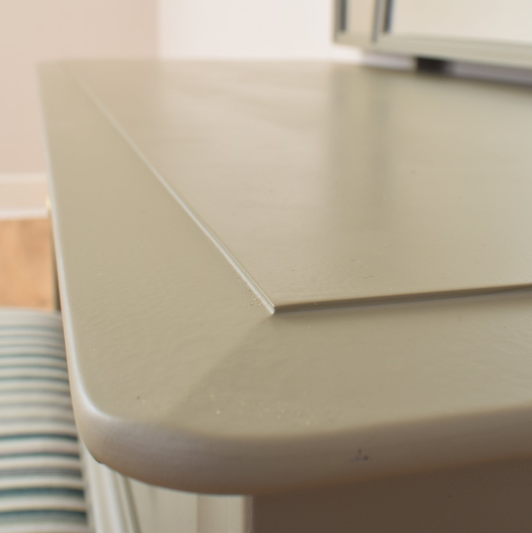 The item has been carefully keyed, primed, and professionally spray-painted in 'Chateau Grey,' creating a smooth and durable surface while complementing the elegant style of the vanity. The stool seat has been reupholstered in a striped fabric, adding both comfort and a modern touch of contrast. A small area of the mirror shows missing reflective backing, though this does not detract from the overall charm or usability of the piece. This item is constructed from solid rosewood, with the drawer bases and rear panel made from plywood.