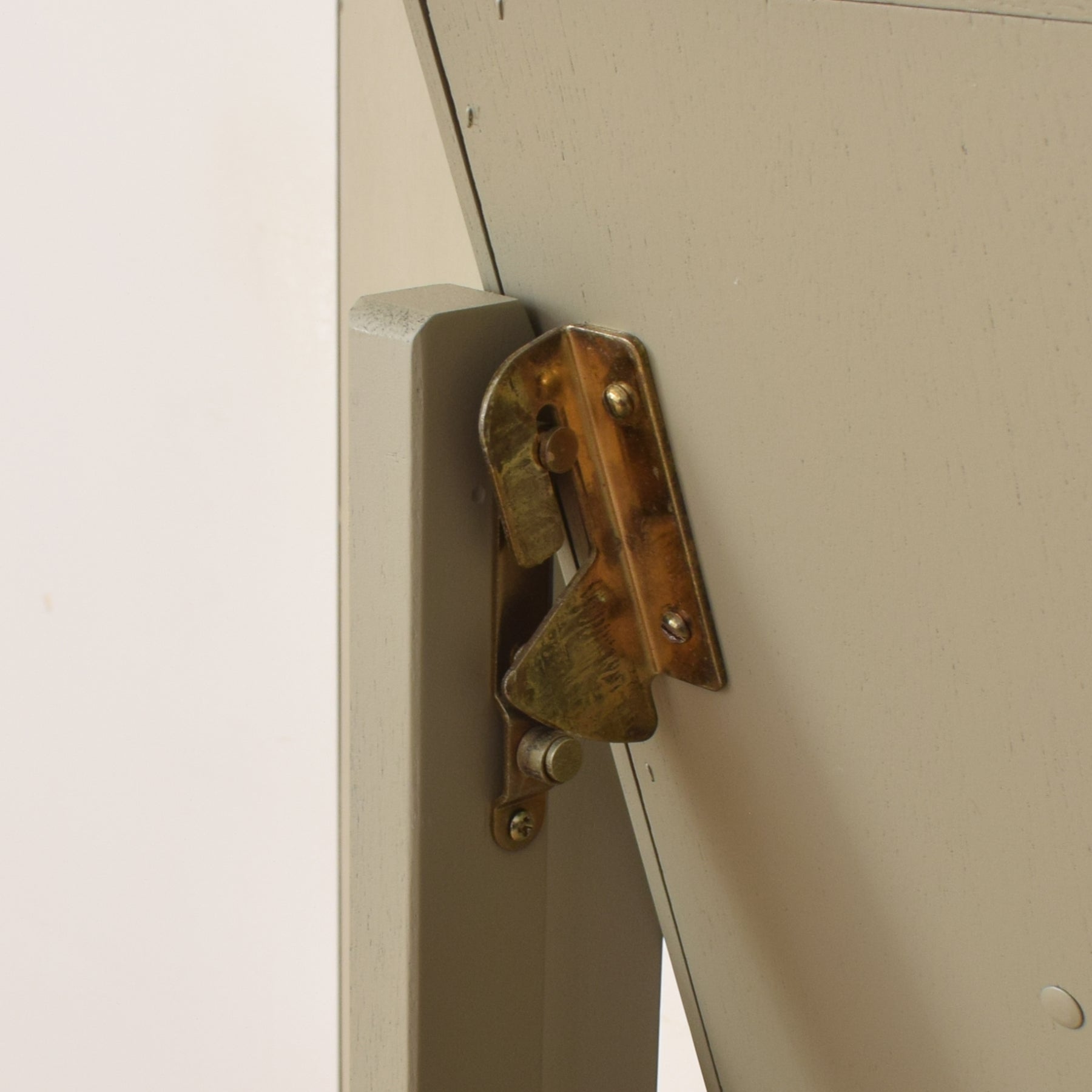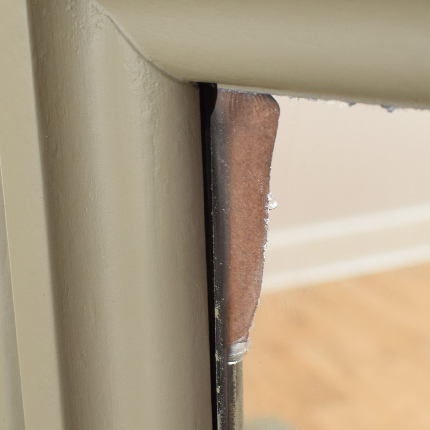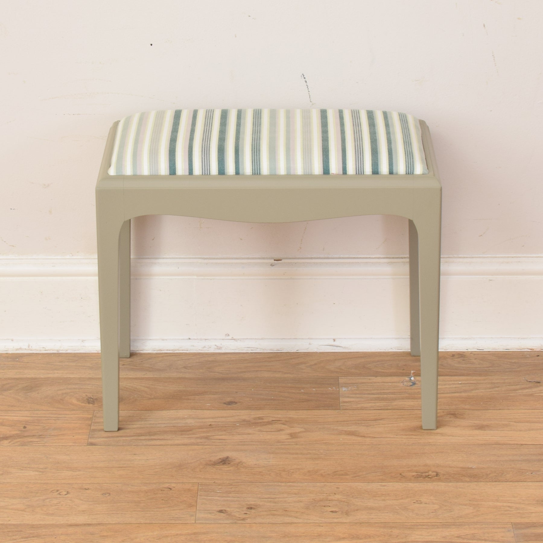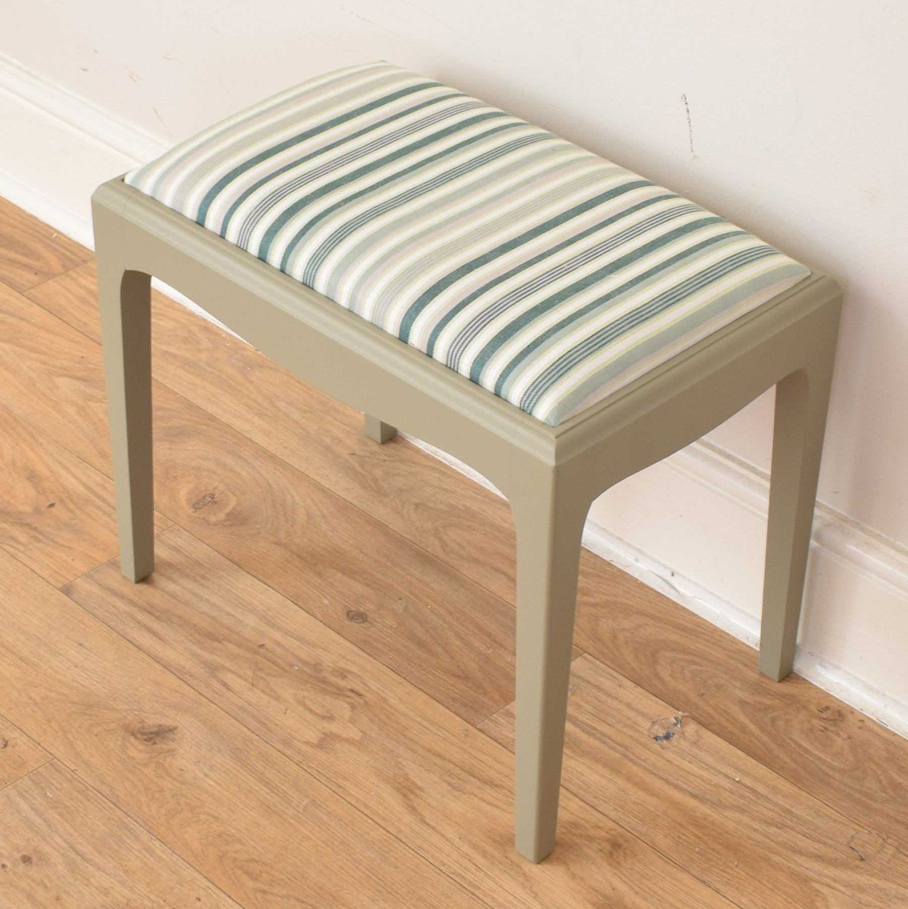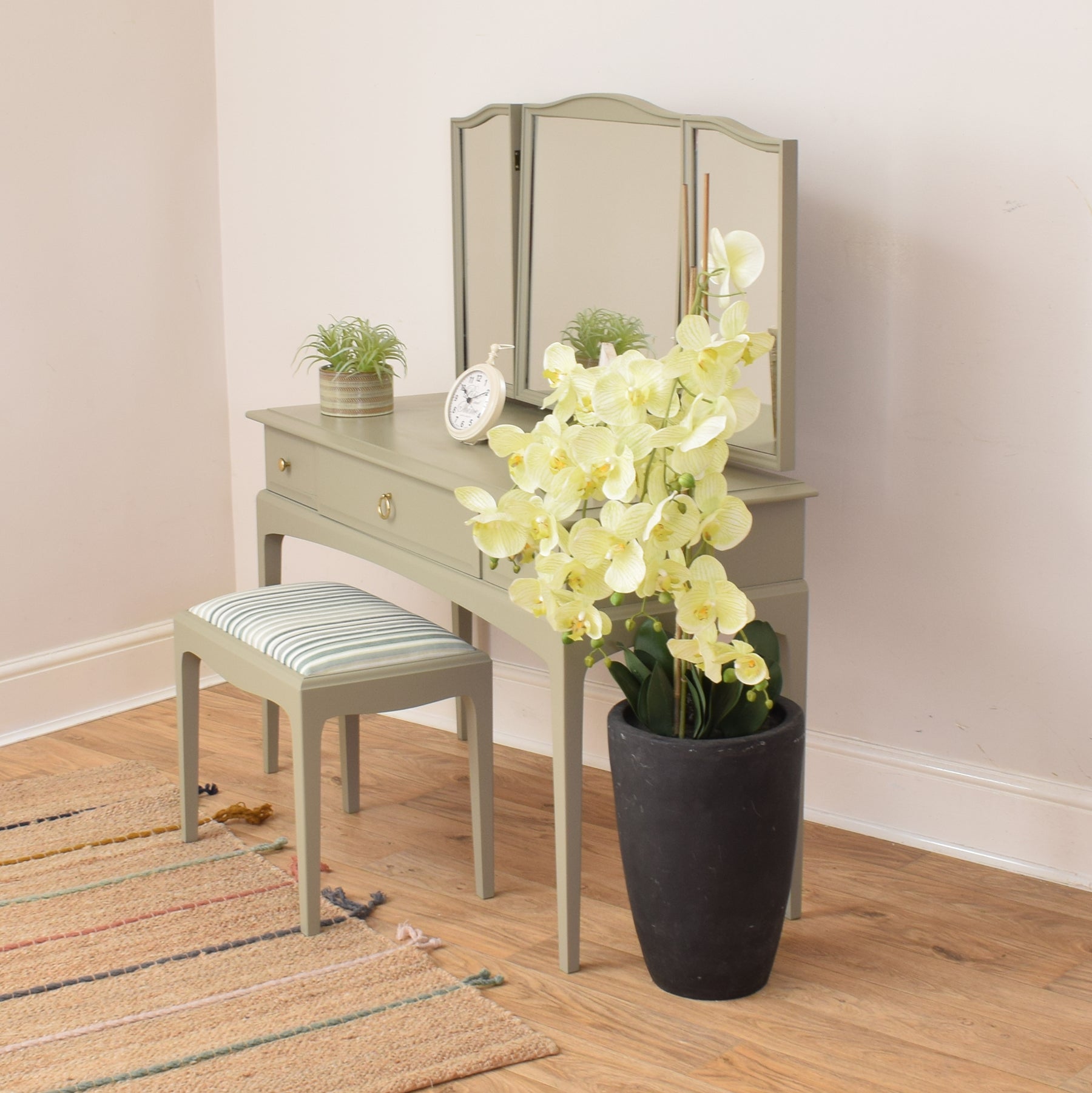 The item has been carefully keyed, primed, and professionally spray-painted in 'Chateau Grey,' creating a smooth and durable surface while complementing the elegant style of the vanity. The stool seat has been reupholstered in a striped fabric, adding both comfort and a modern touch of contrast. A small area of the mirror shows missing reflective backing, though this does not detract from the overall charm or usability of the piece. This item is constructed from solid rosewood, with the drawer bases and rear panel made from plywood.