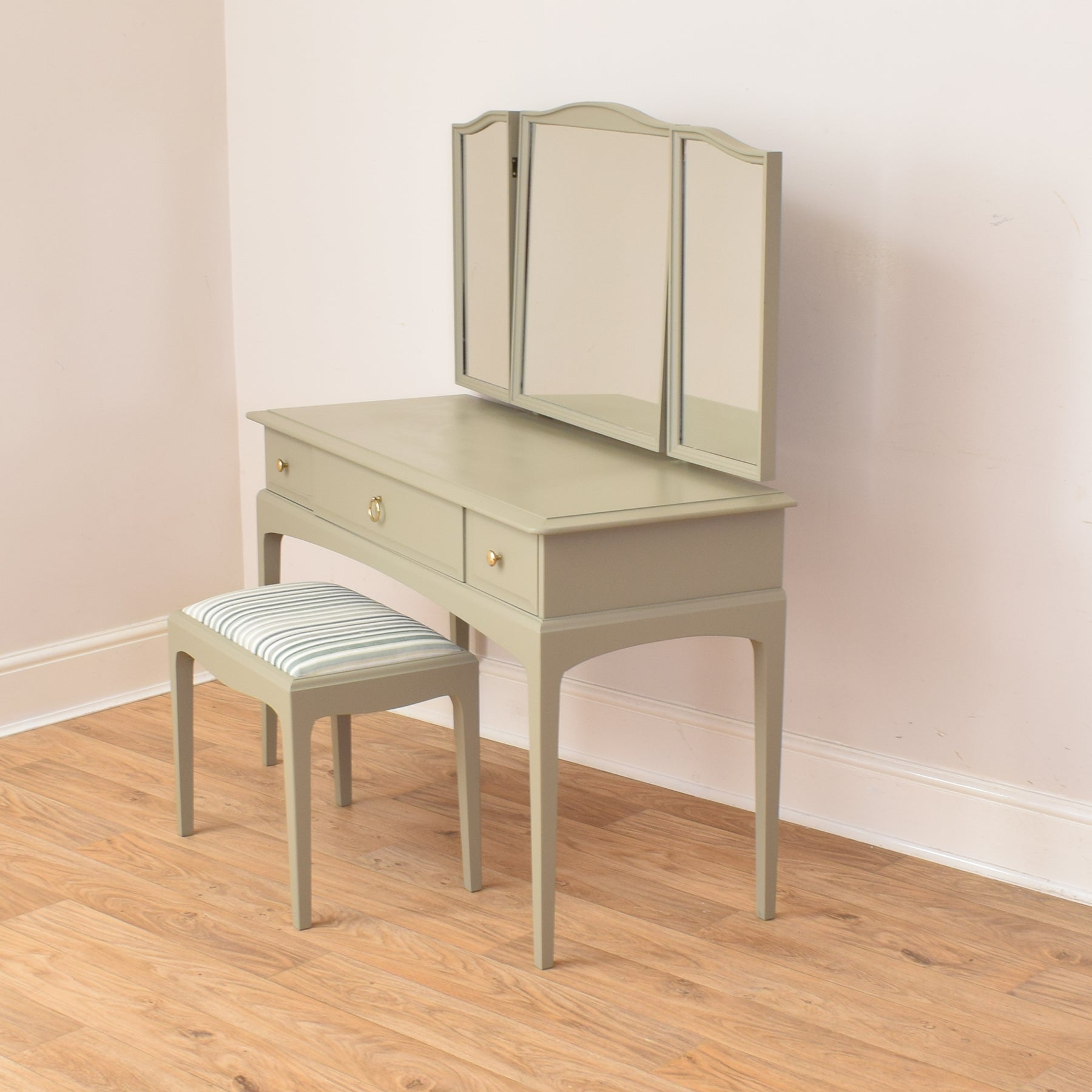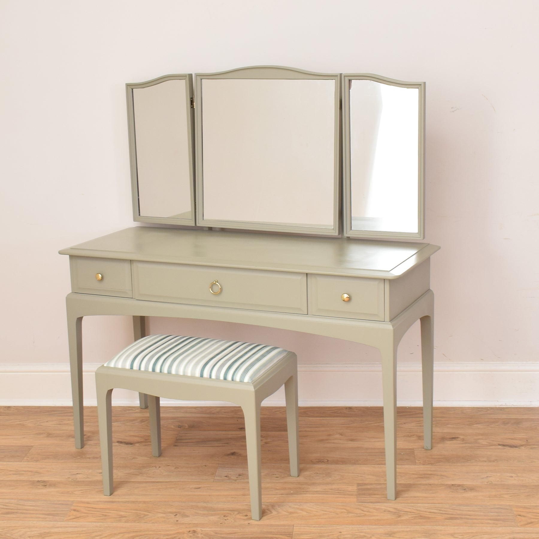 This is a genuine 'Stag' vanity table, featuring clean lines and subtle detailing that give it a refined appearance. The piece includes three drawers with brass-effect knobs, offering useful storage for accessories, beauty items, or other small essentials. Above sits a three-panel mirror designed to make daily routines easier.