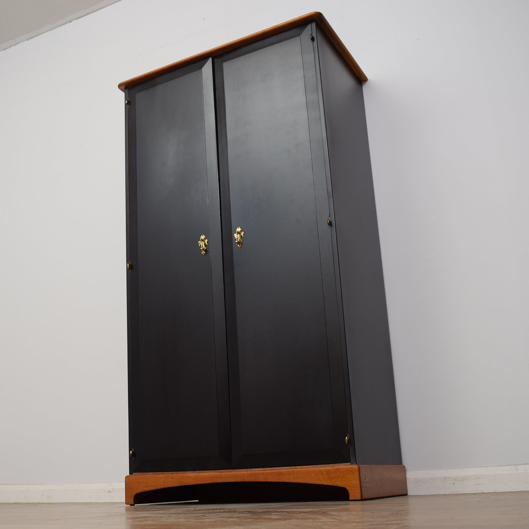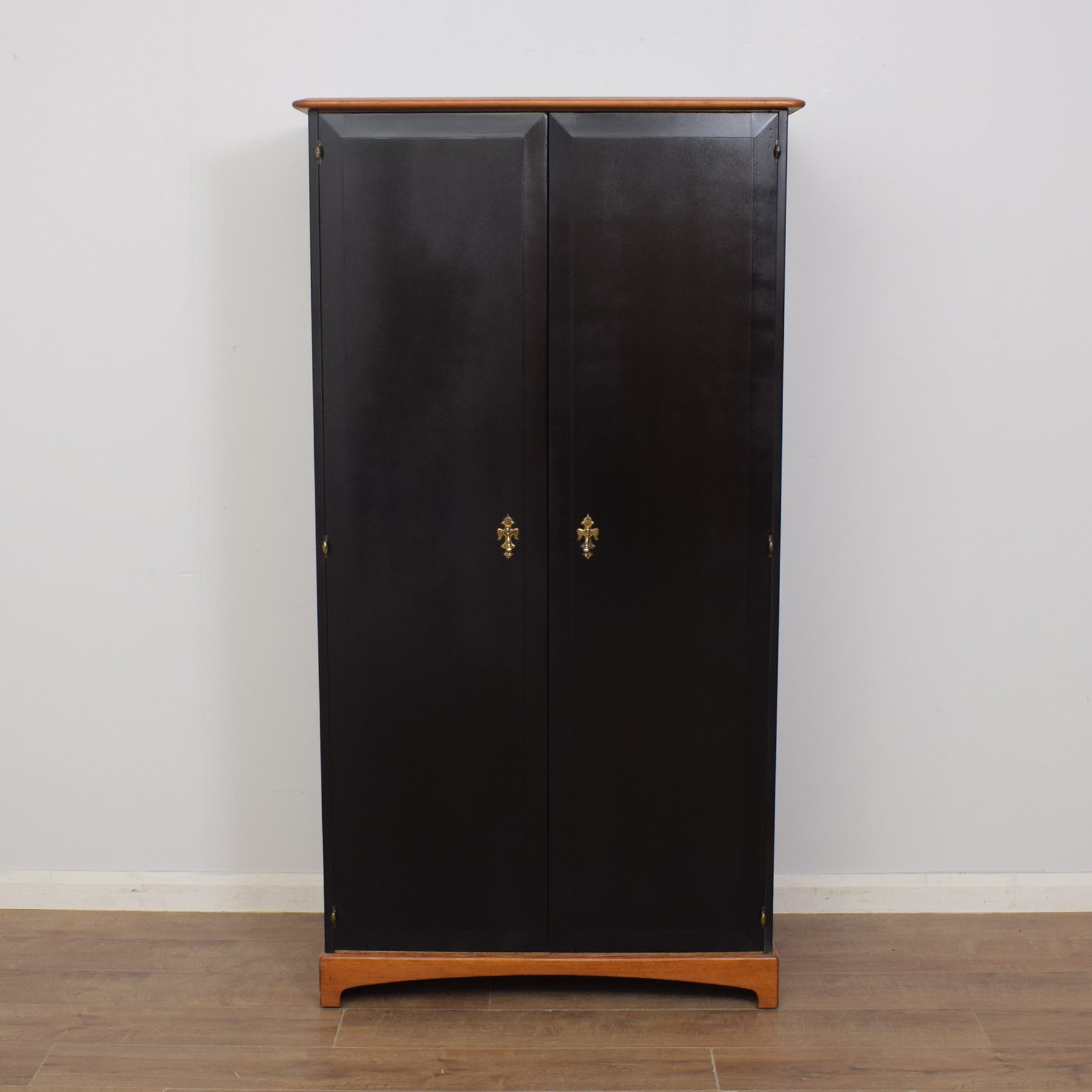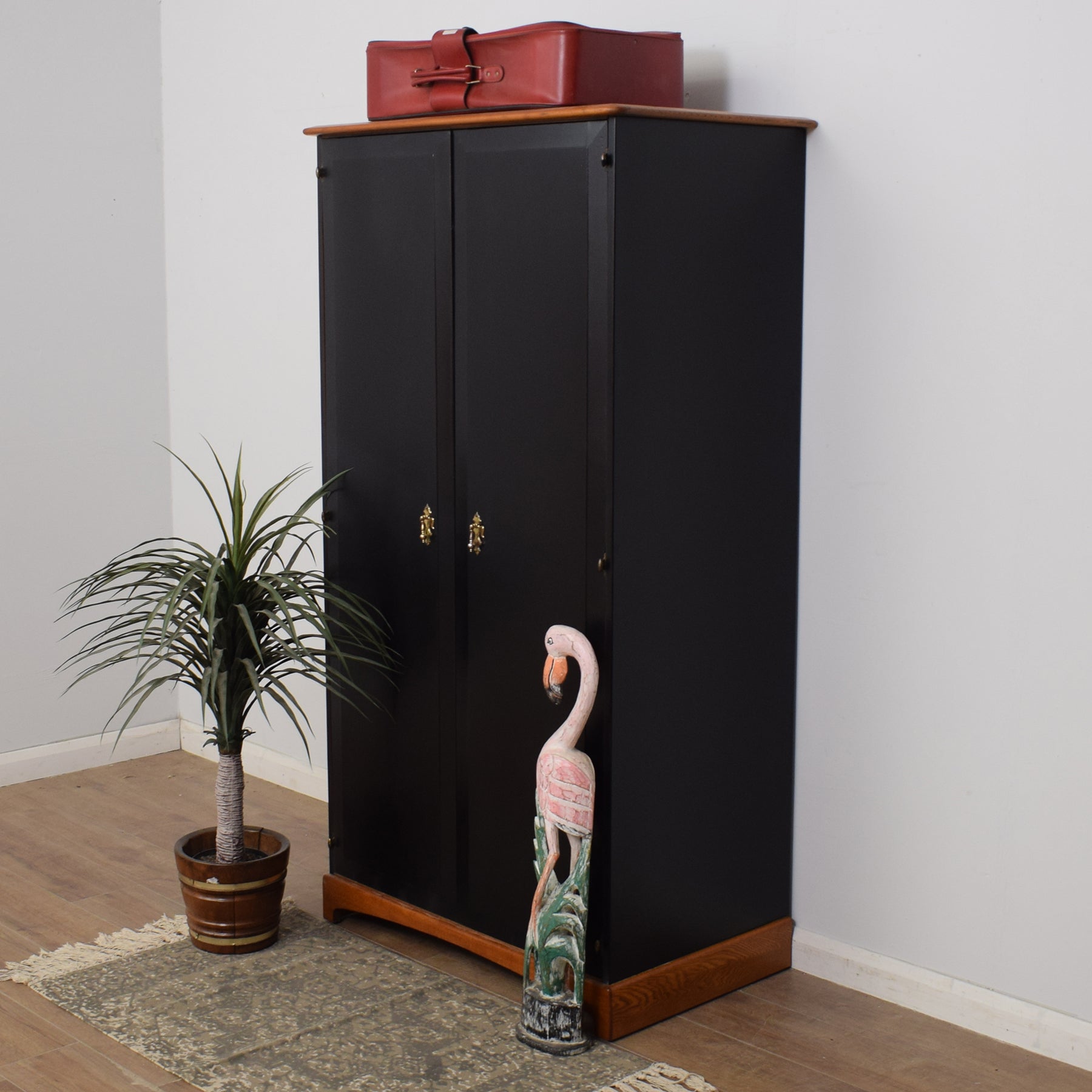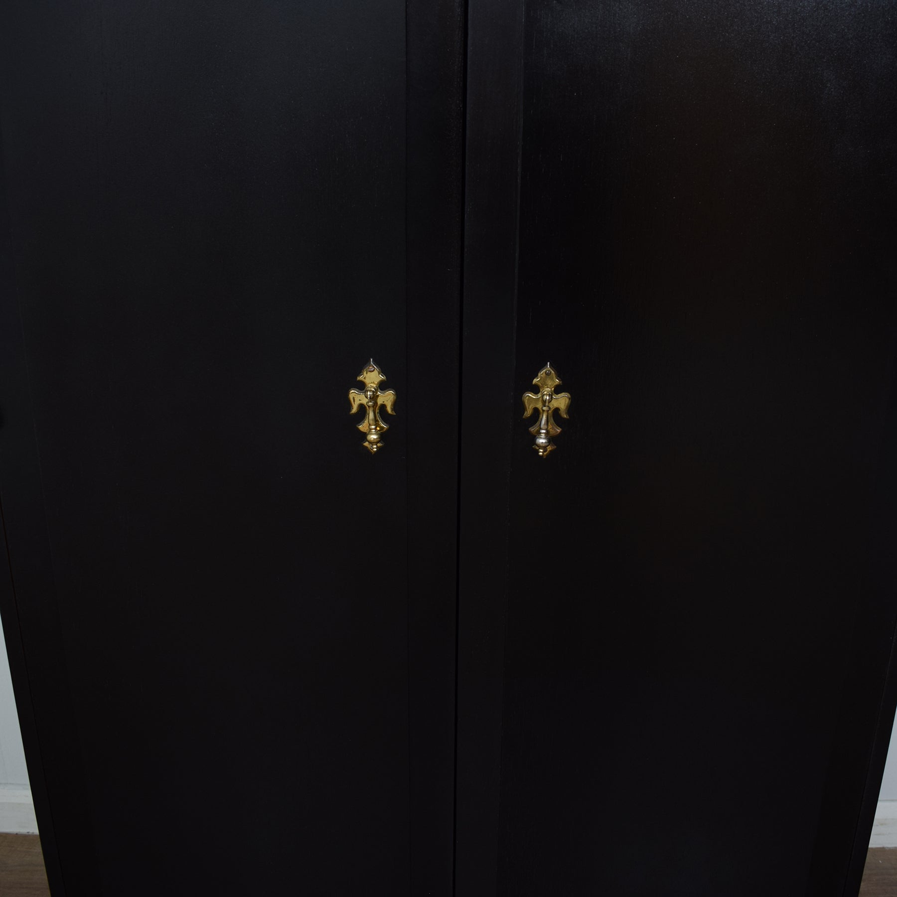 Our dedicated restoration team has revived this wardrobe by removing the original finish before applying a clear lacquer to the crown and the plinth to provide protection. The rest has been painted black to provide a striking contrast with the wood and give an appealing finish. We have also changed the handles during the restoration process. This wardrobe is constructed predominantly from cherry wood. The back panel is plywood.